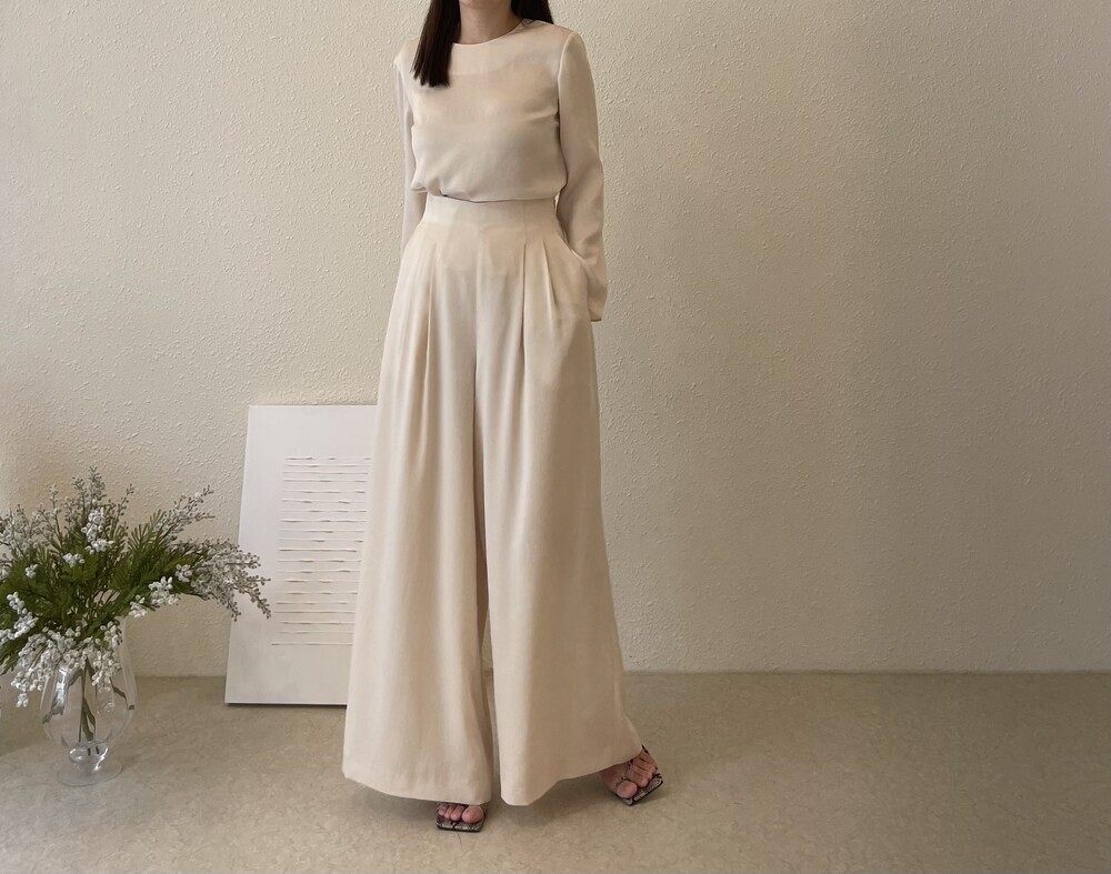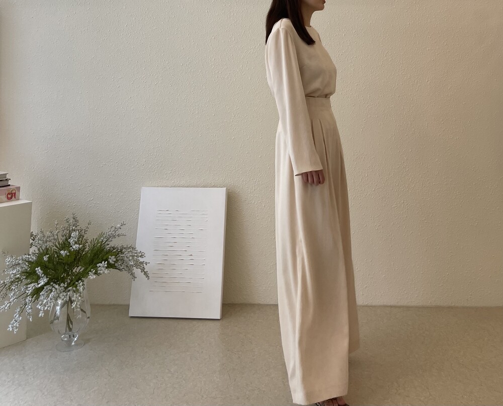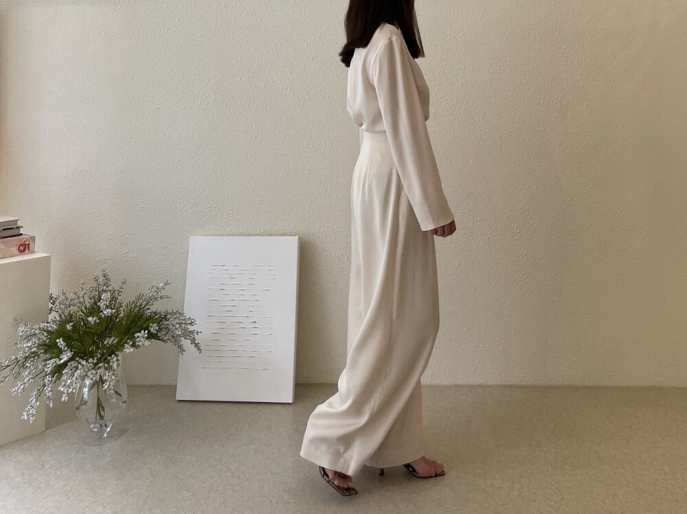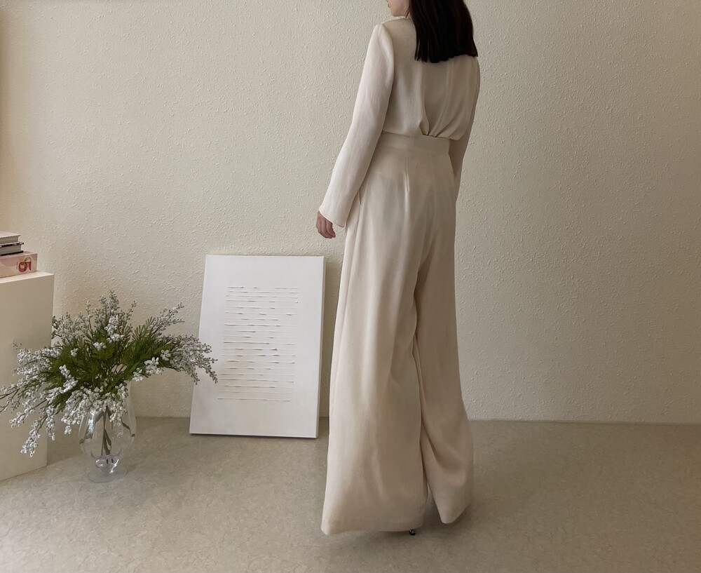 원피스와 동일한 소재로 보여드리는 셋업 중 팬츠는 전체적으로 여유로운 실루엣이나,