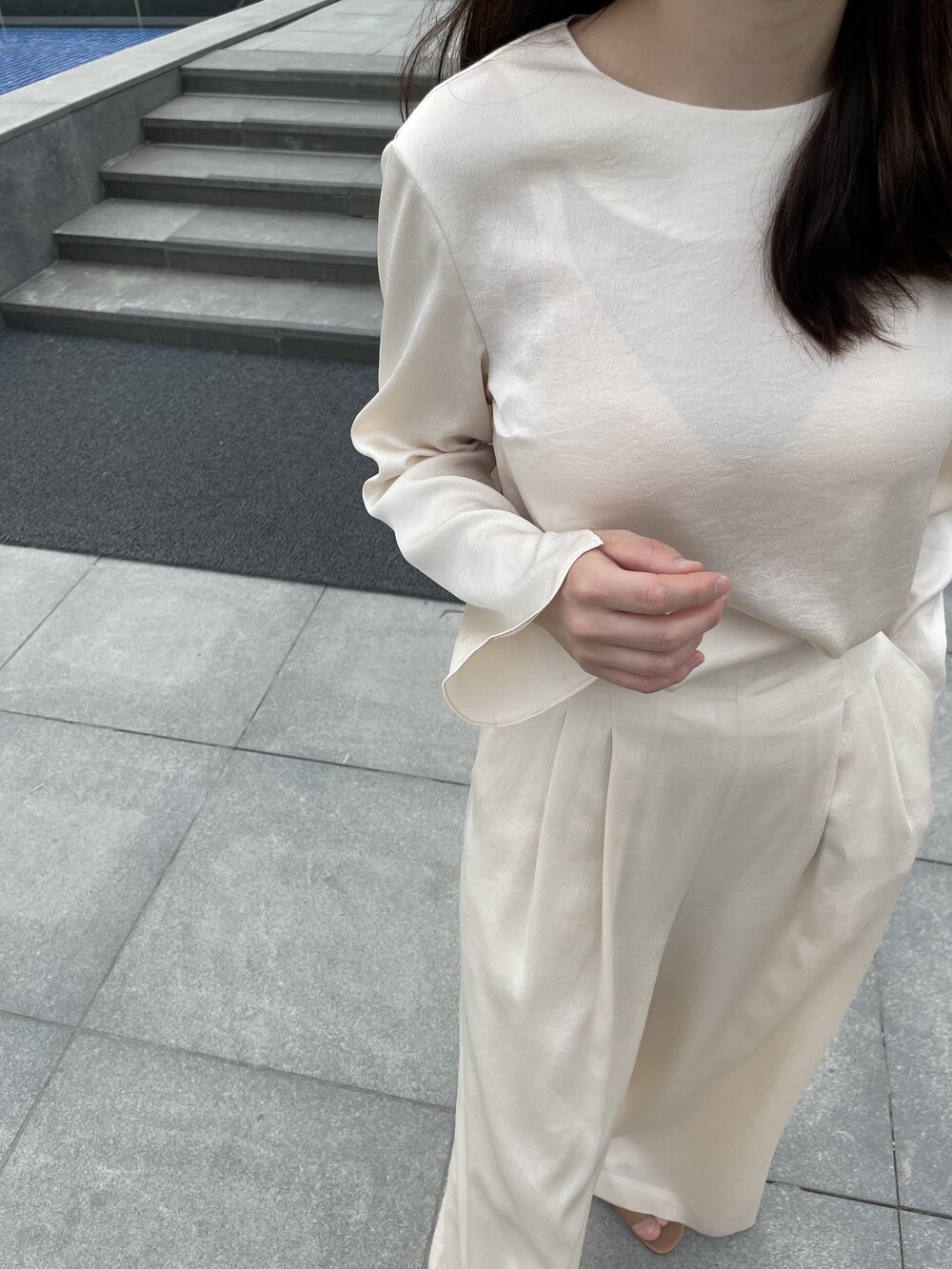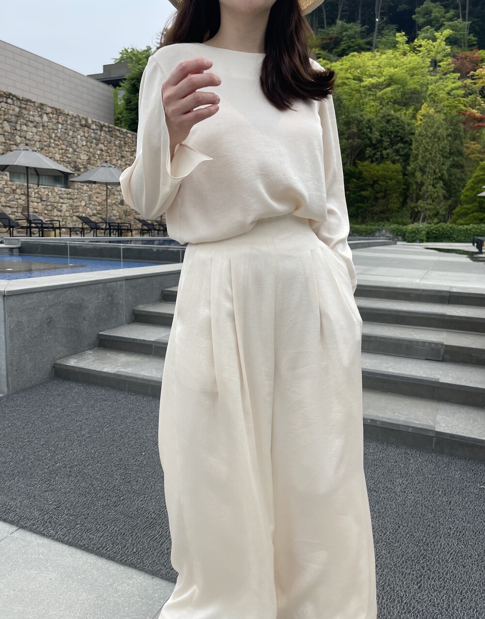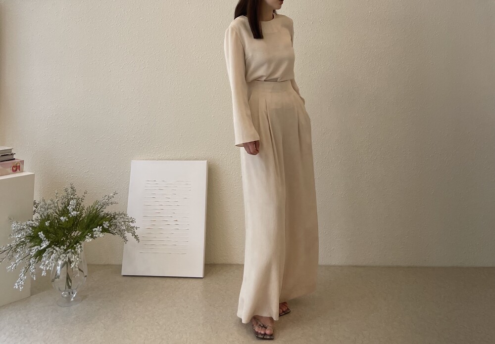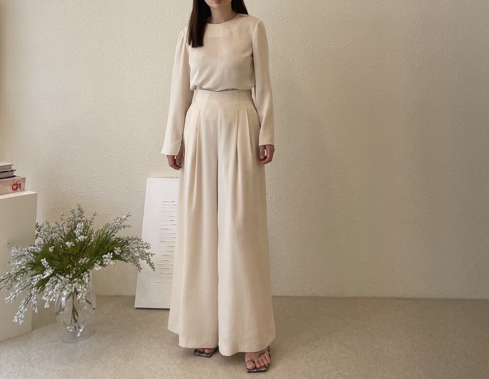원피스와 동일한 소재로 보여드리는 셋업 중 팬츠는 전체적으로 여유로운 실루엣이나,
