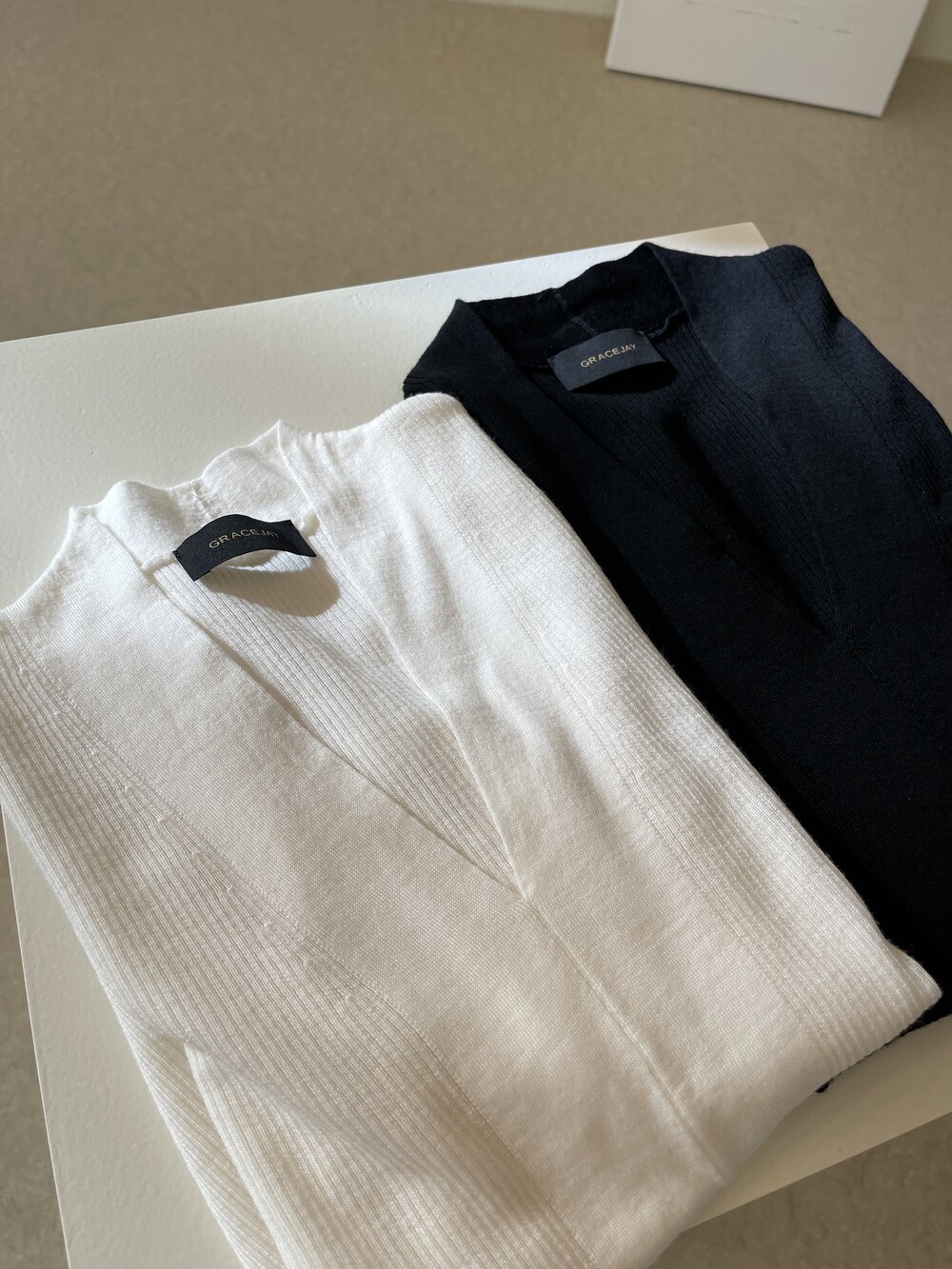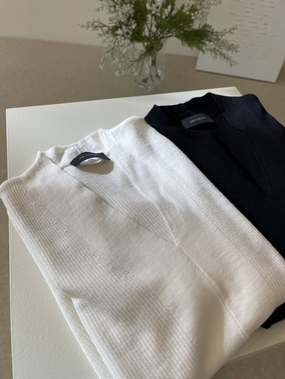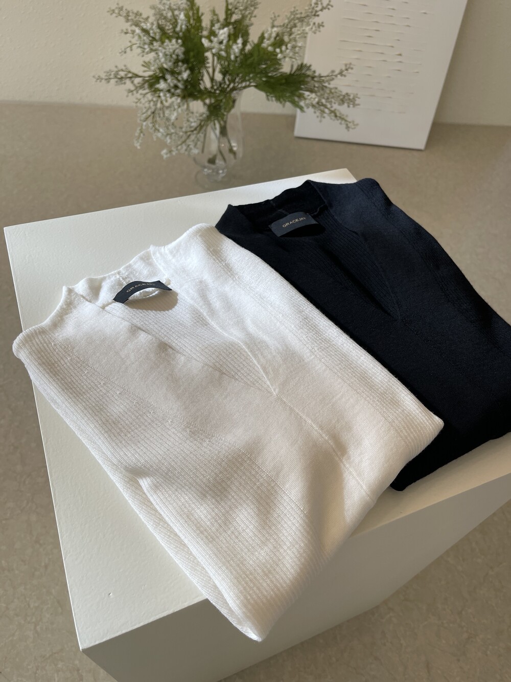 5cm 폭의 팬시한 립단작으로 편직되었으며, 특히 옆목선을 감싸주는 라인과 가슴골이 신경 쓰이지 않는 깊이감으로 디자인되어 우아하고 지적인 분위기를 느낄 수 있는 니트입니다.