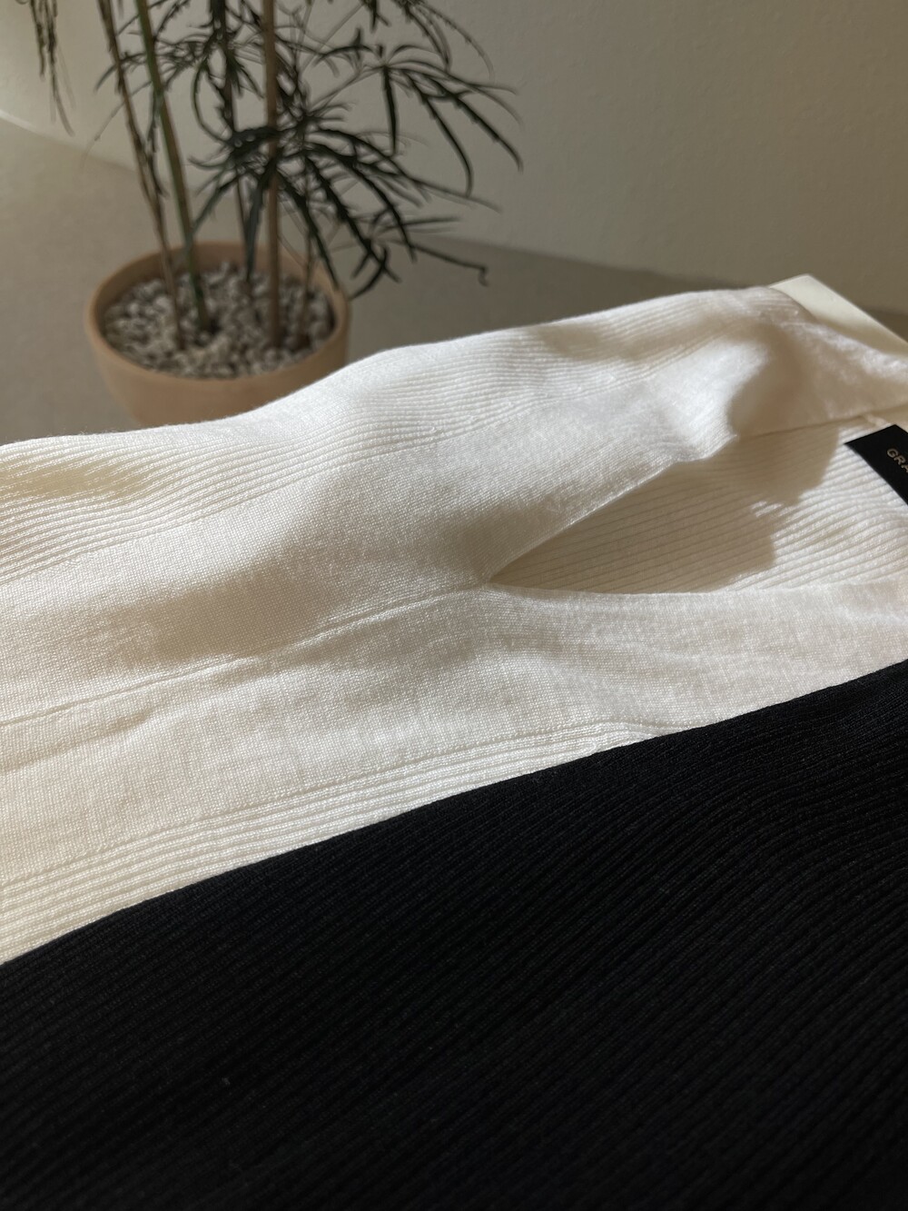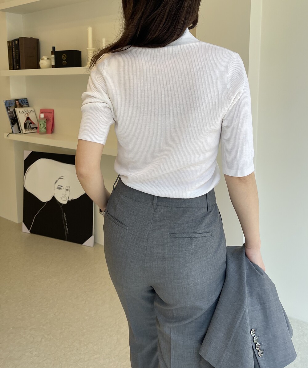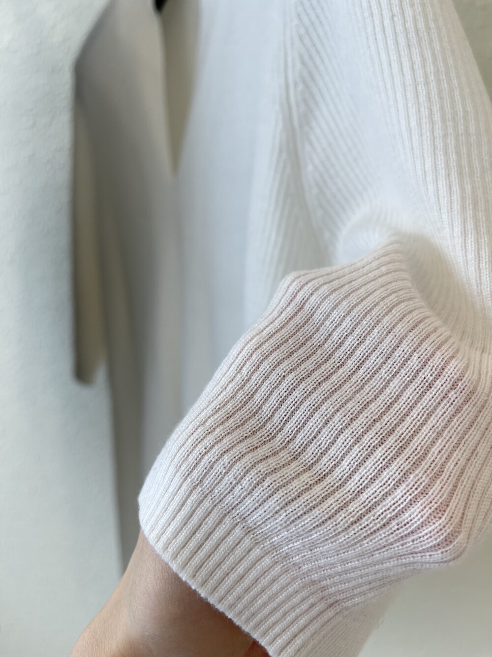 5cm 폭의 팬시한 립단작으로 편직되었으며, 특히 옆목선을 감싸주는 라인과 가슴골이 신경 쓰이지 않는 깊이감으로 디자인되어 우아하고 지적인 분위기를 느낄 수 있는 니트입니다.