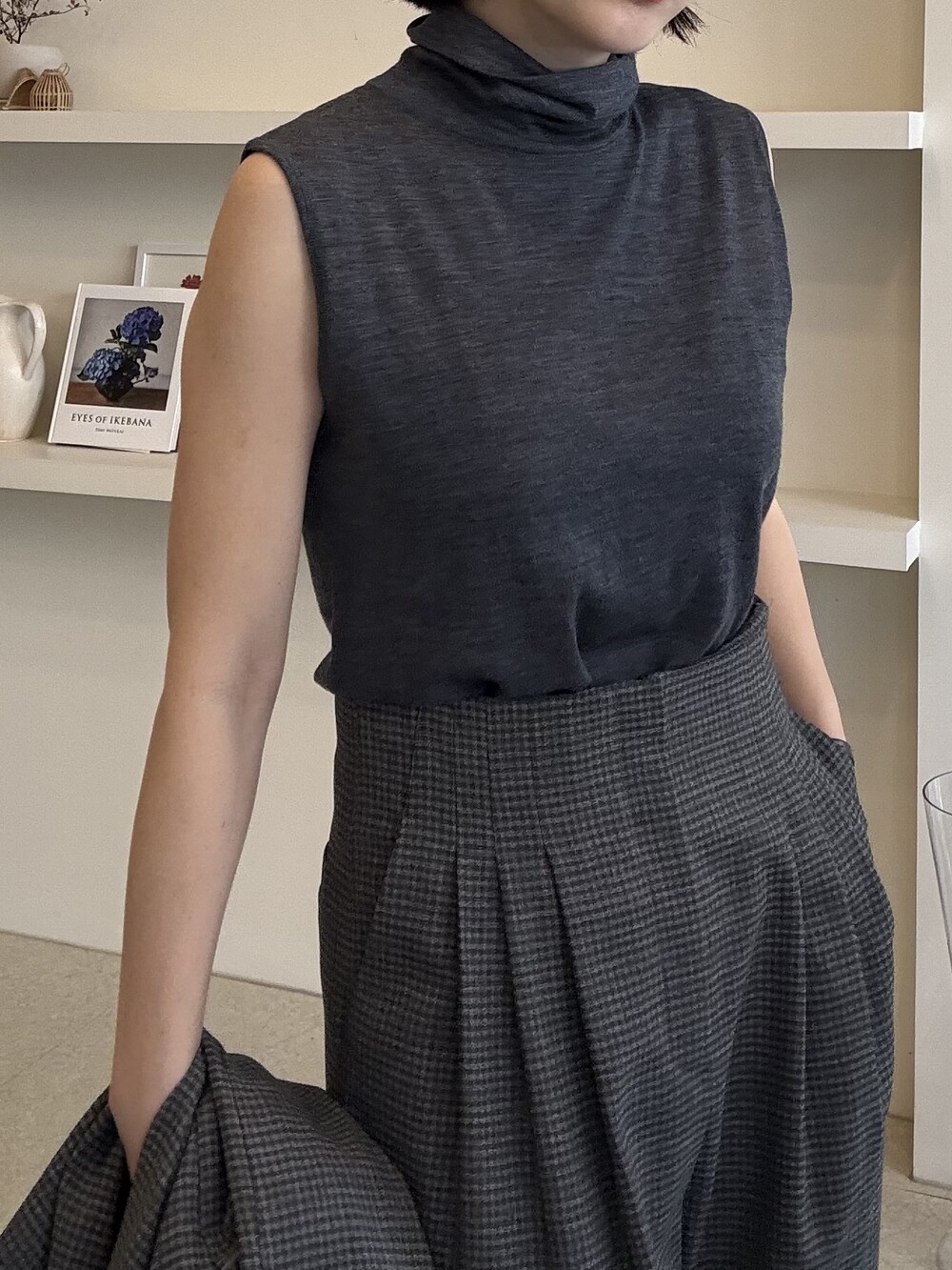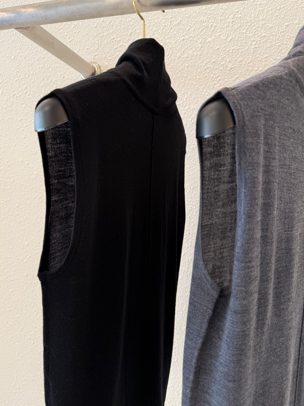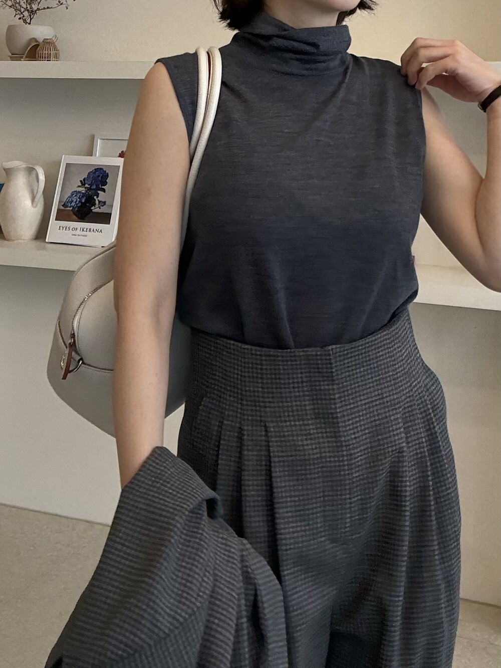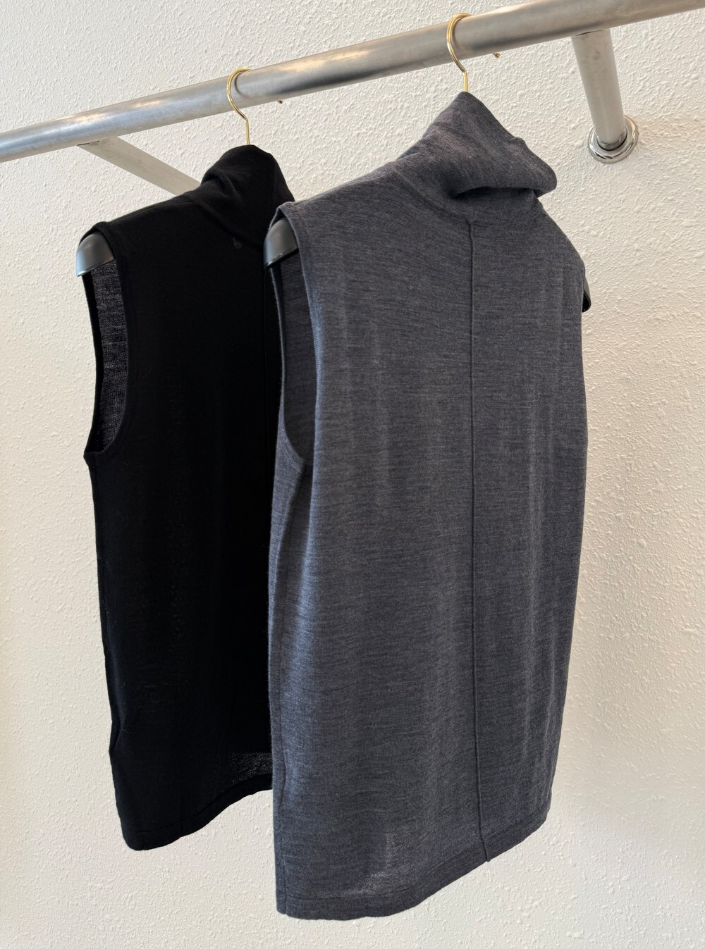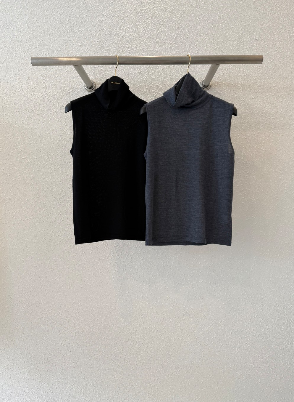메리노 울100% 의 세번수 울로 소프트한 질감이 느껴지는 터틀넥 슬리브리스 입니다.