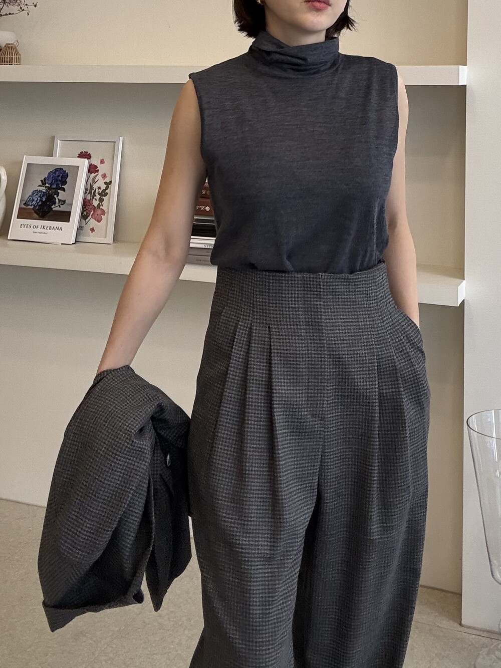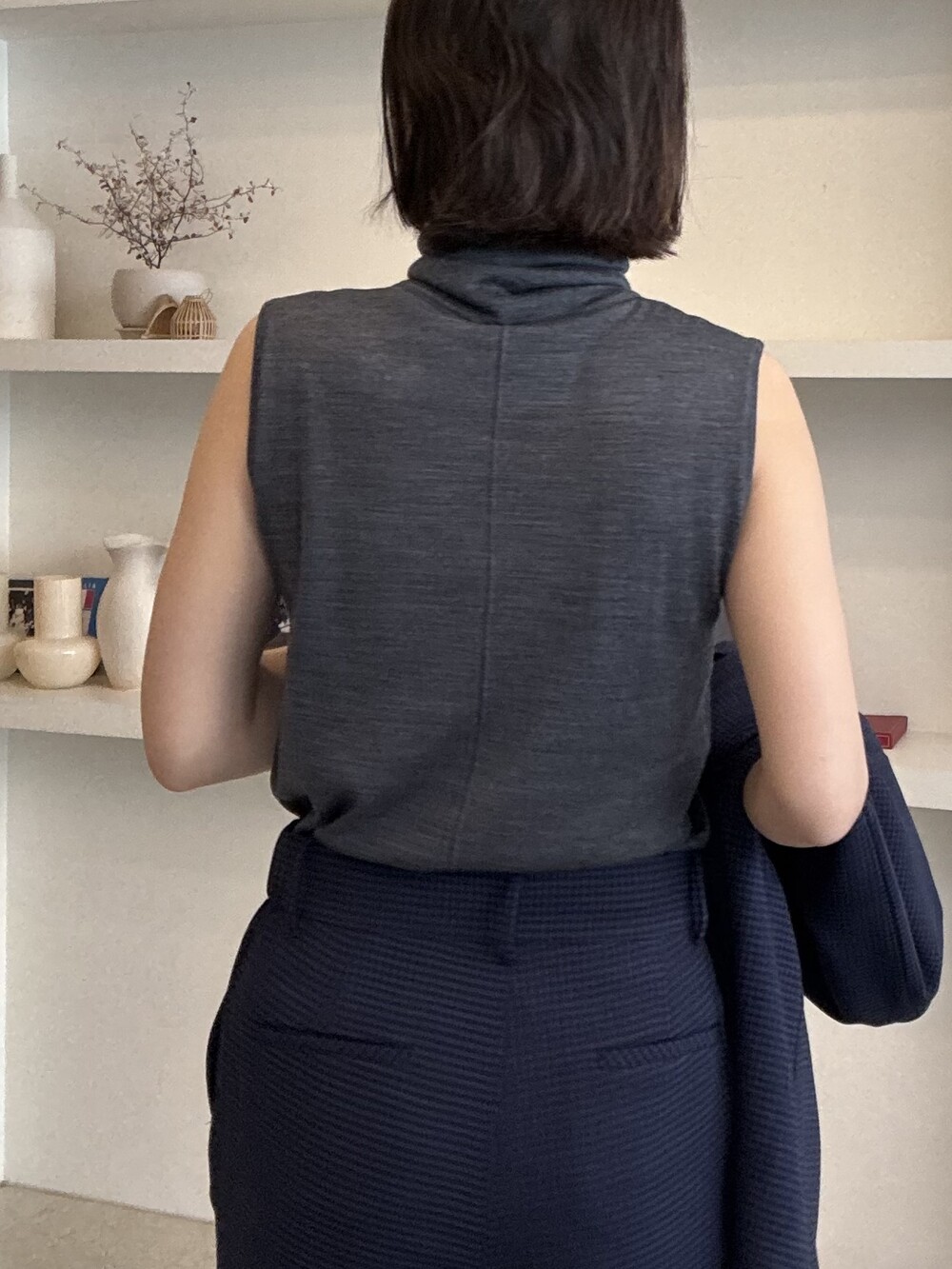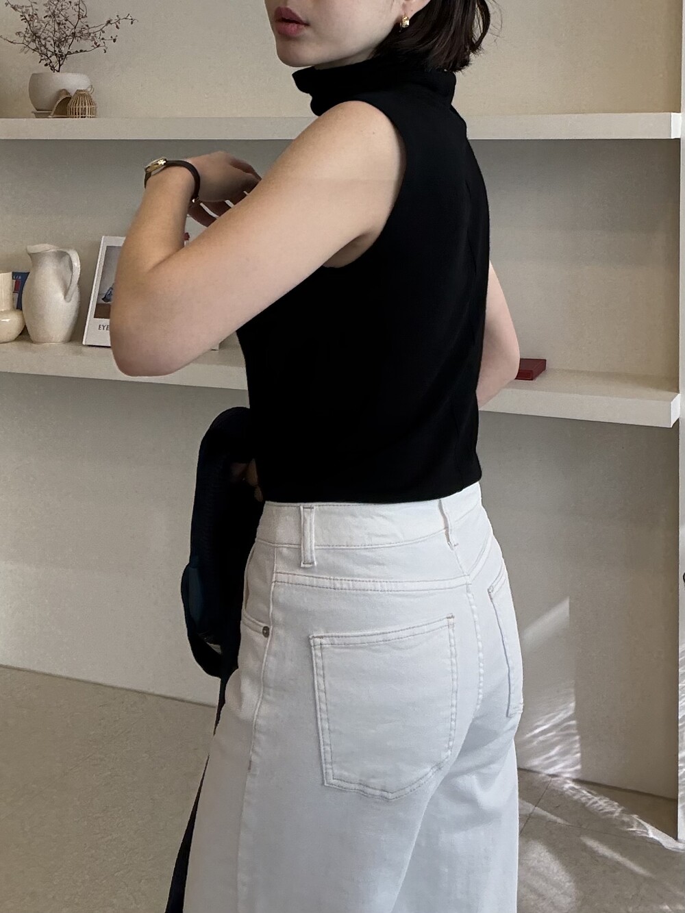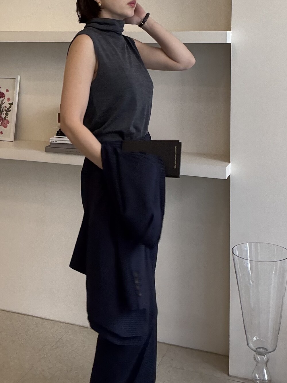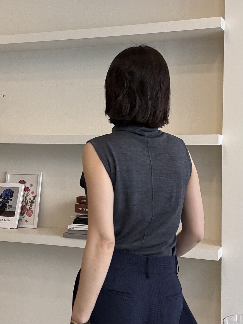 메리노 울100% 의 세번수 울로 소프트한 질감이 느껴지는 터틀넥 슬리브리스 입니다.