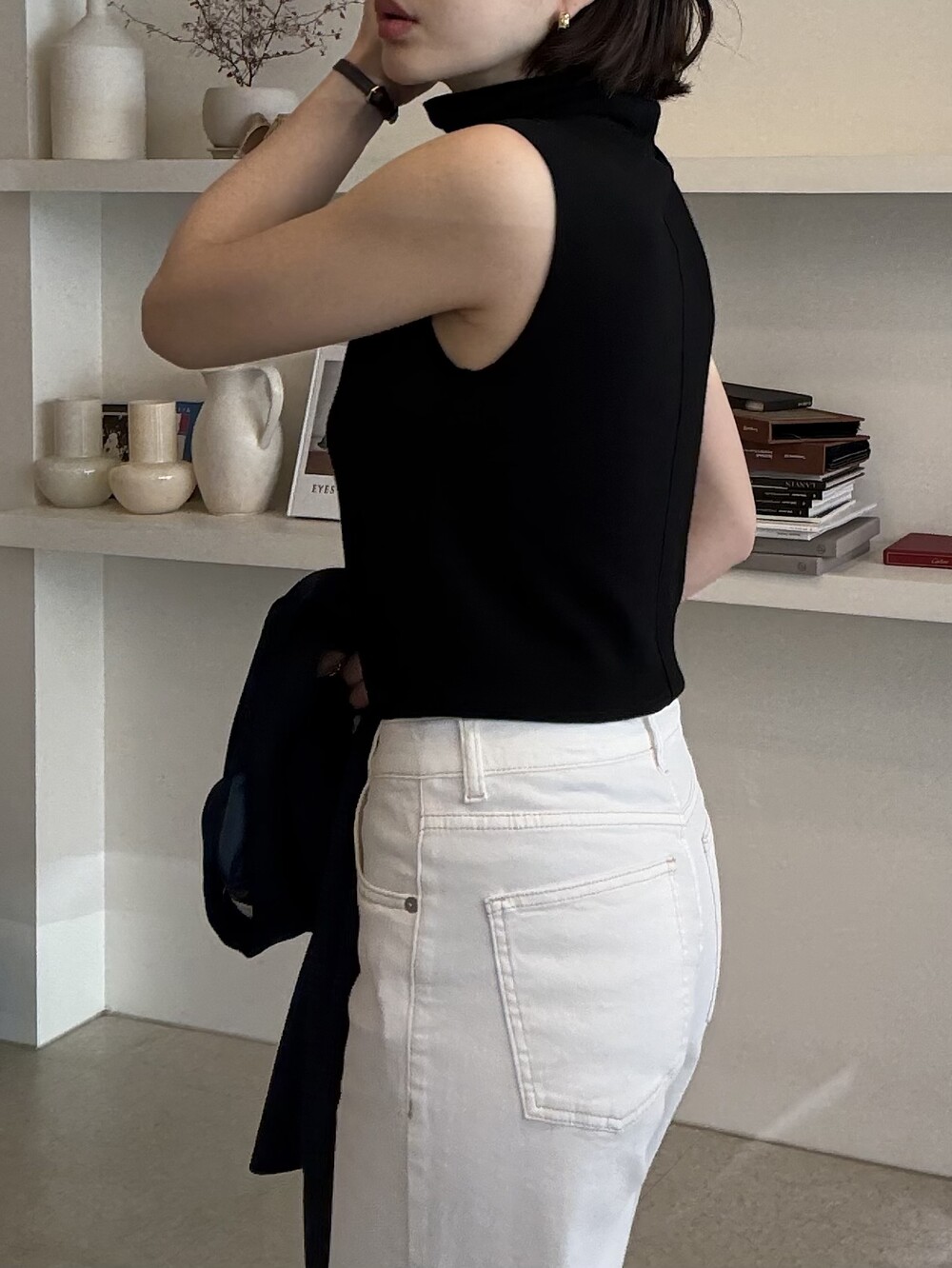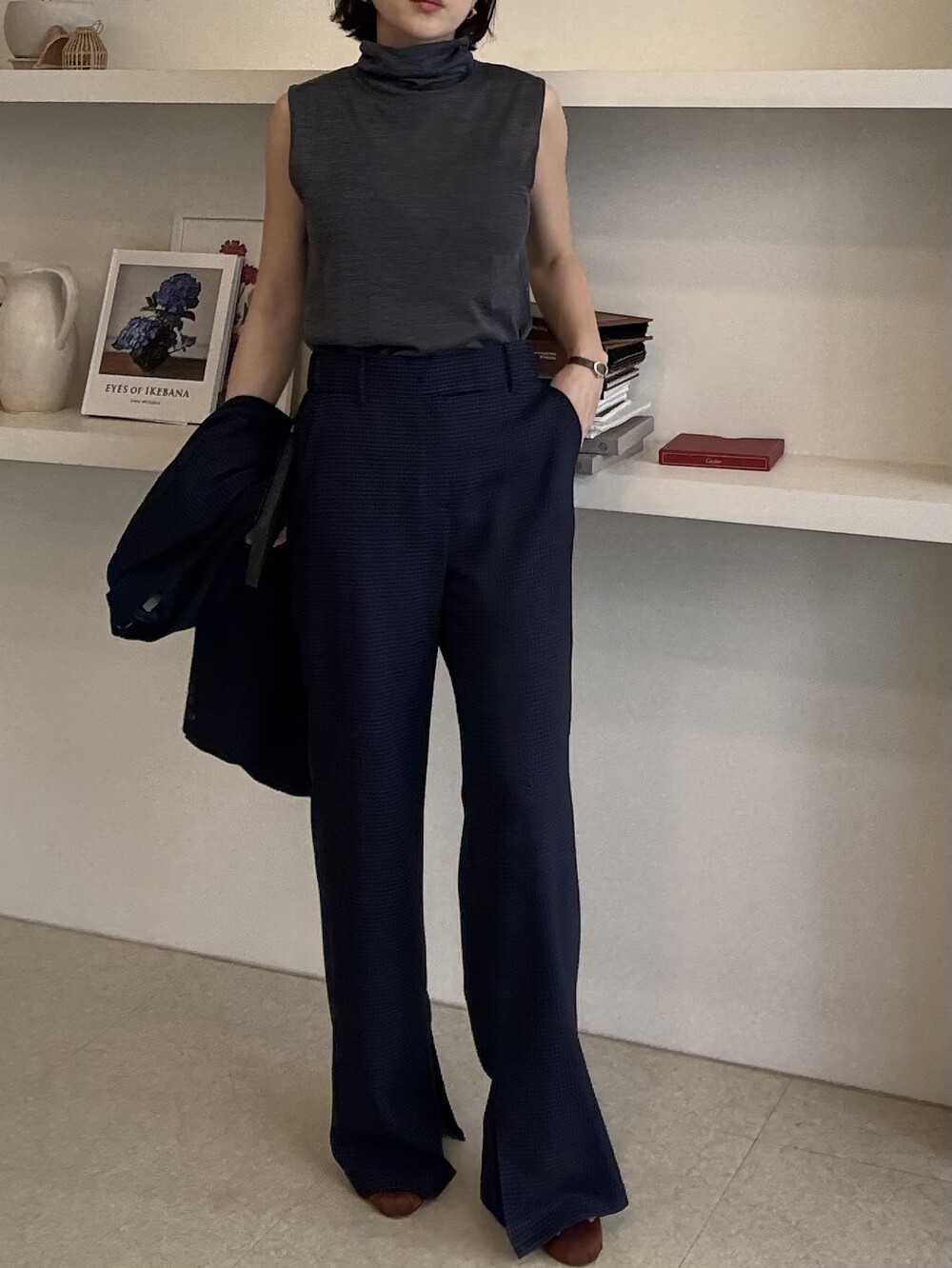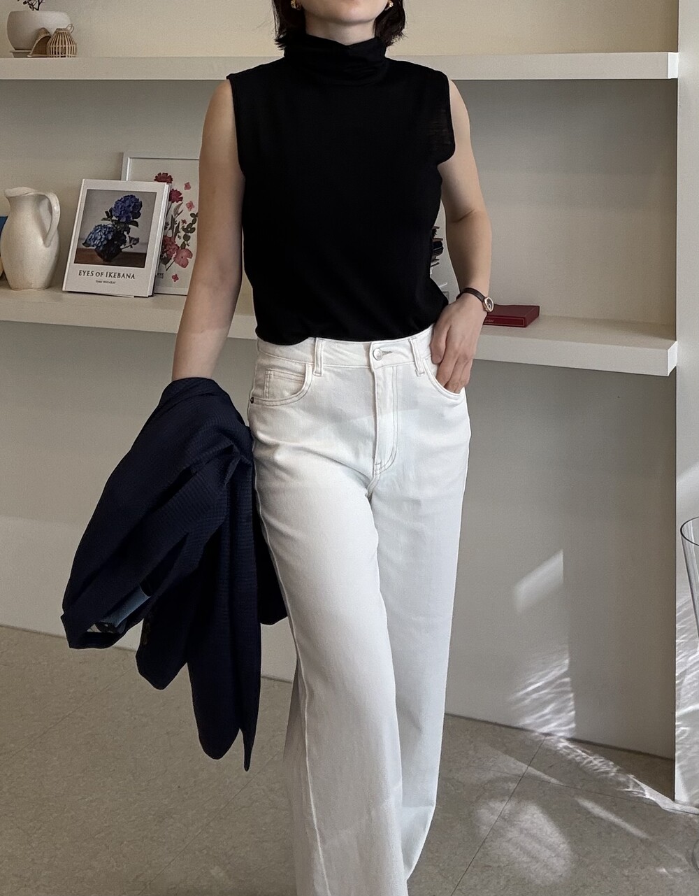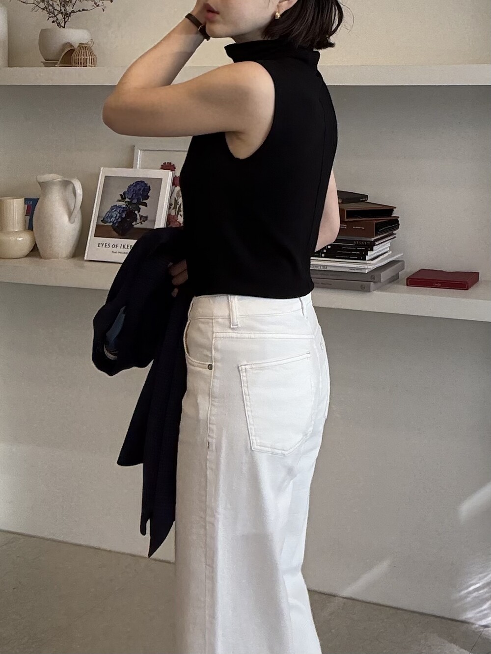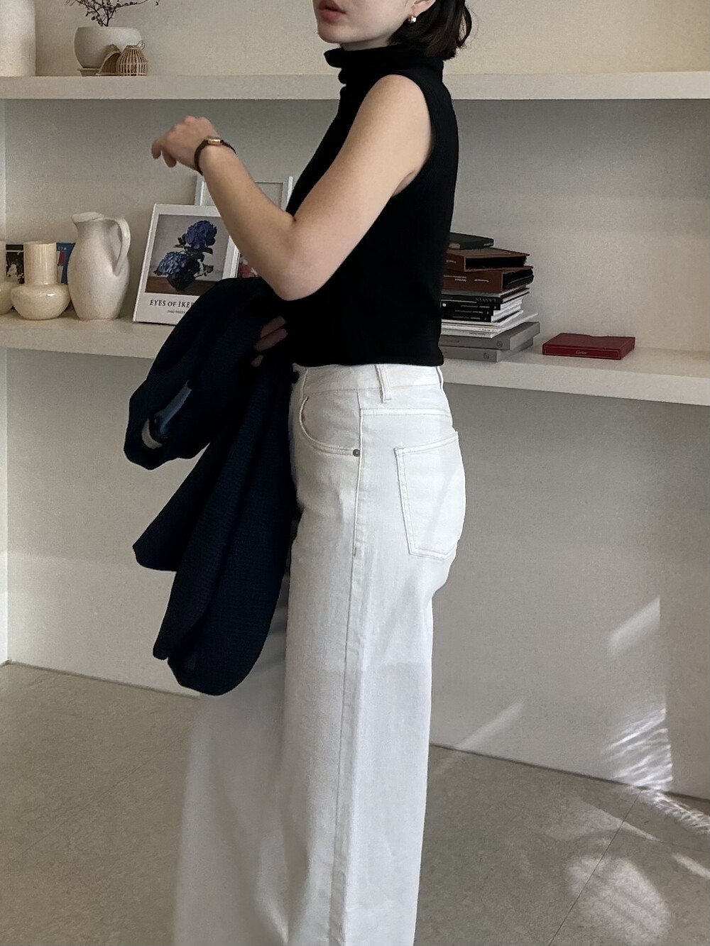 메리노 울100% 의 세번수 울로 소프트한 질감이 느껴지는 터틀넥 슬리브리스 입니다.