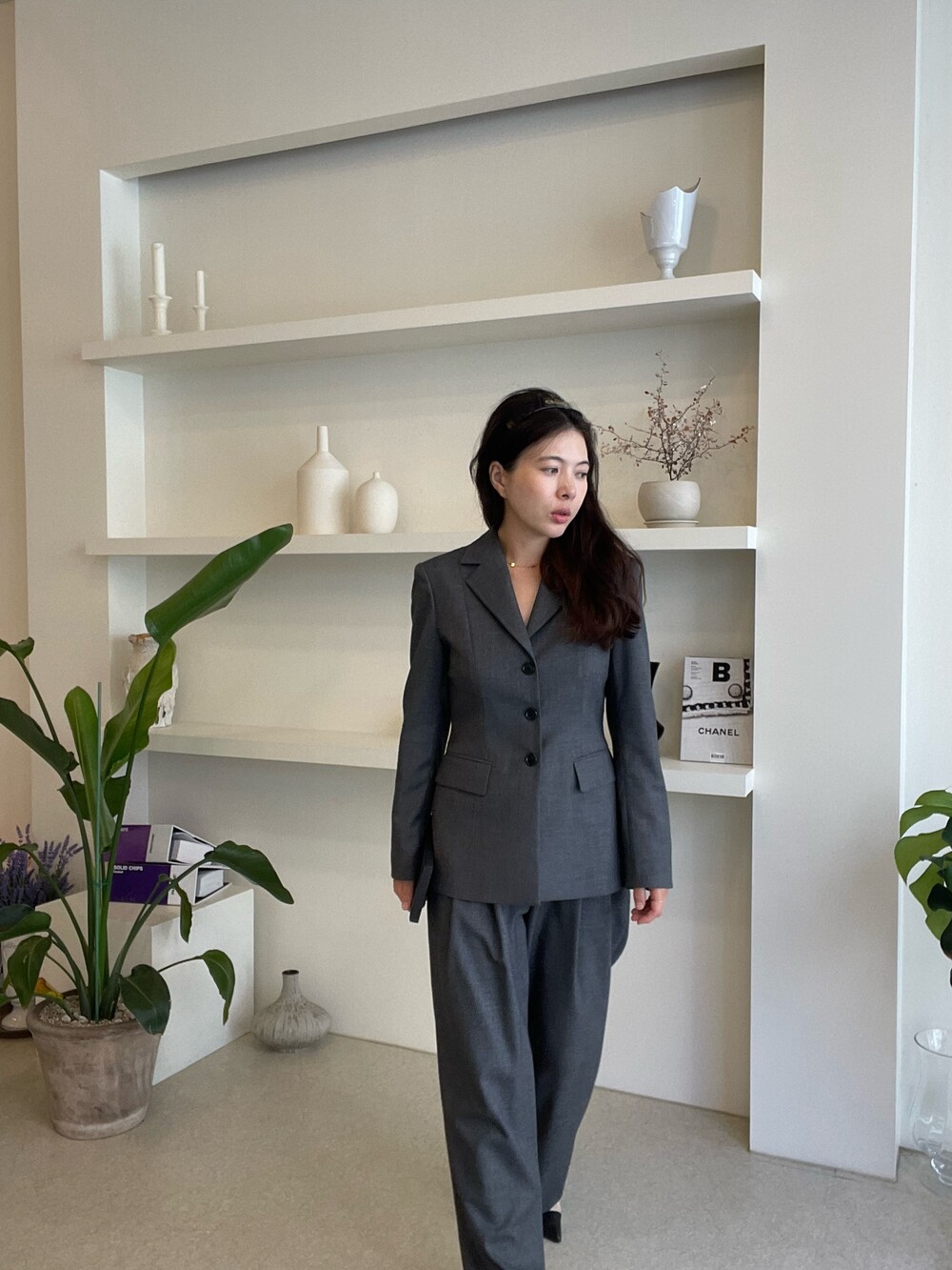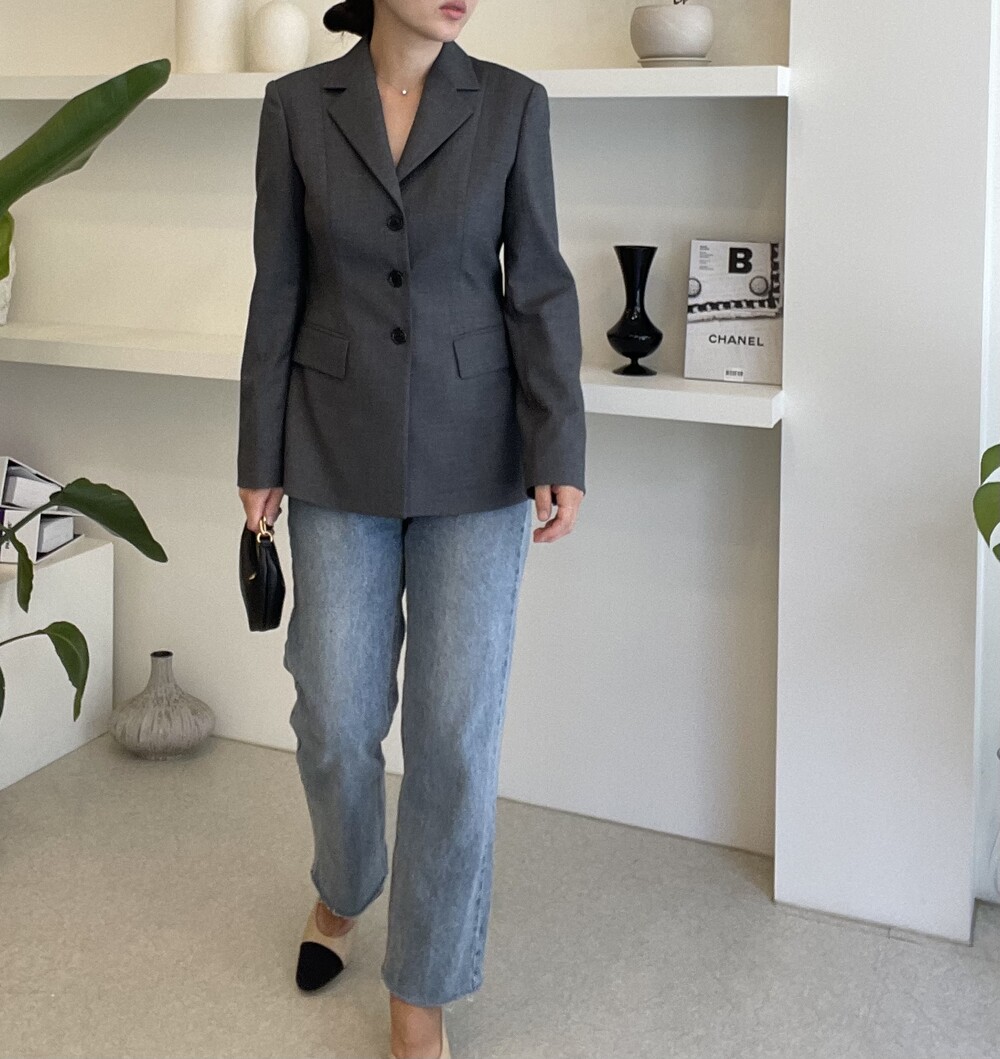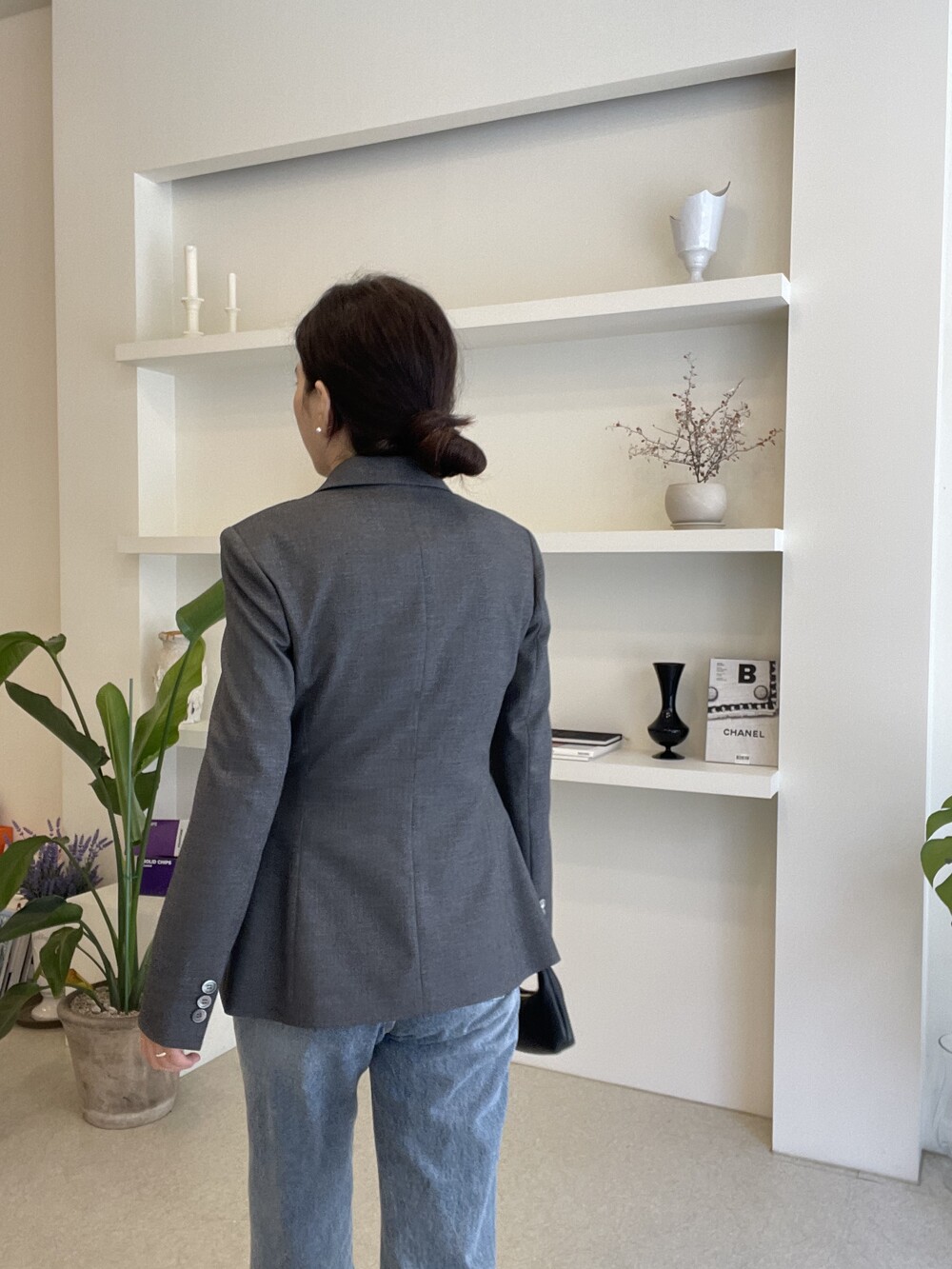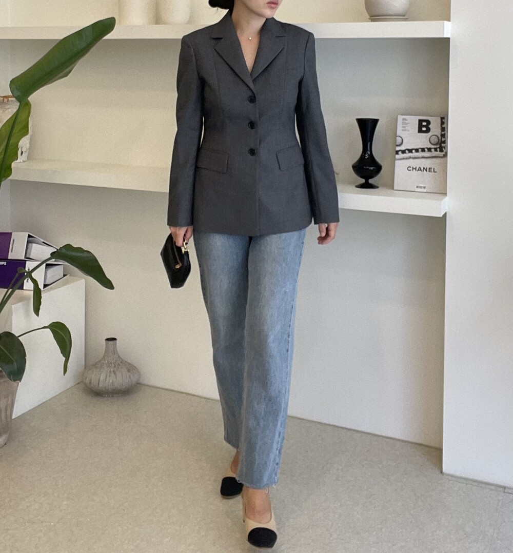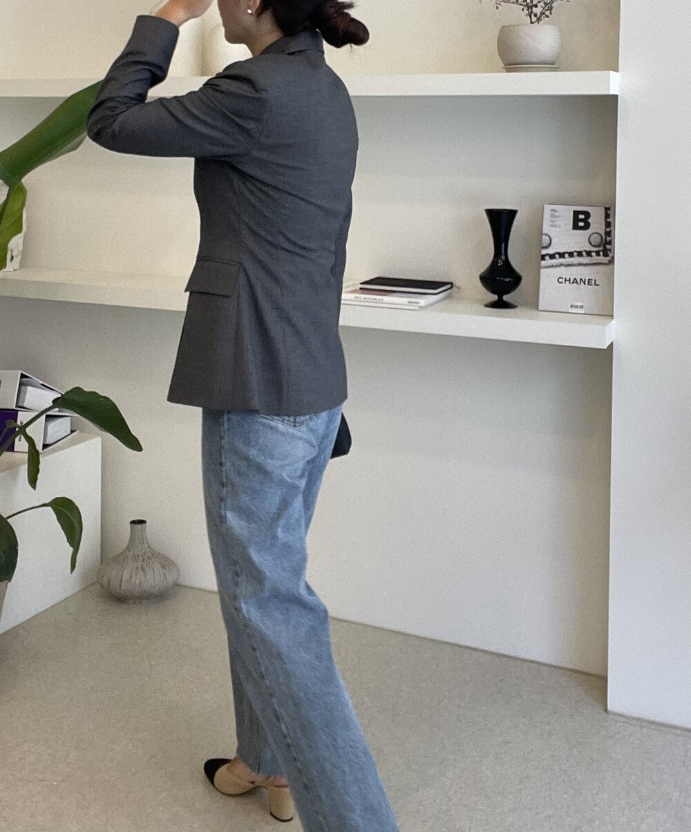 어깨선은 살짝 여유가 있고 전체적으로 슬림한 라인이 특징적인 자켓입니다.