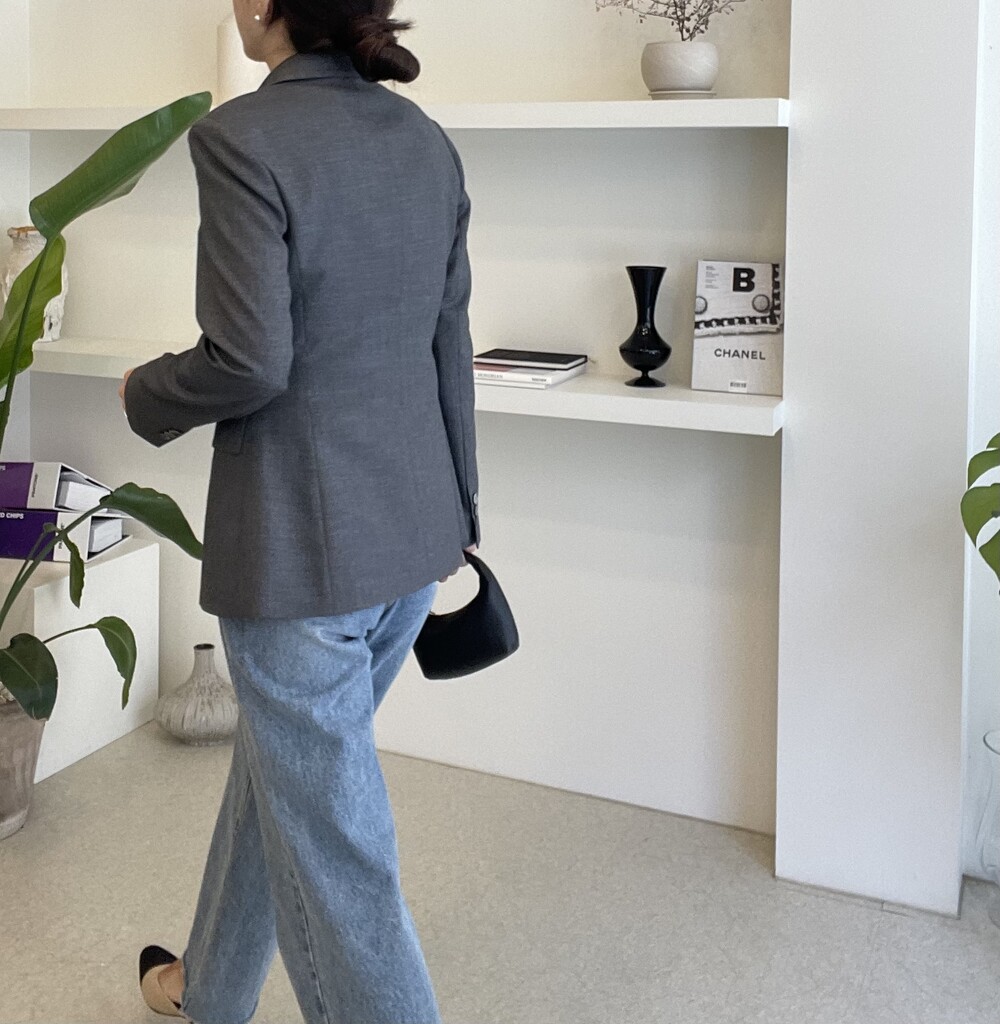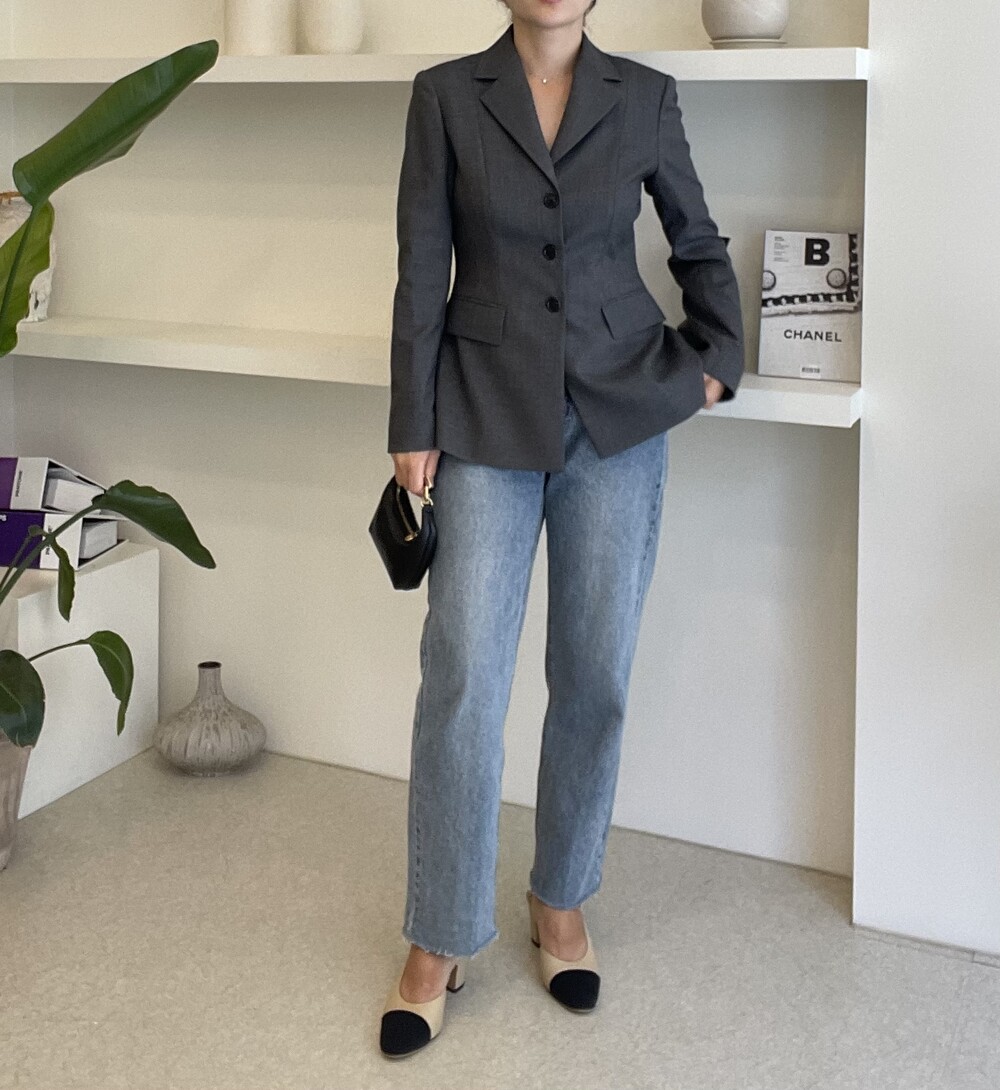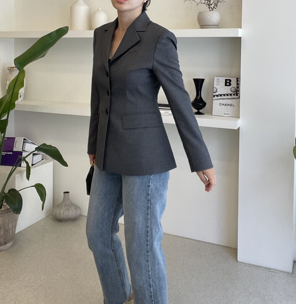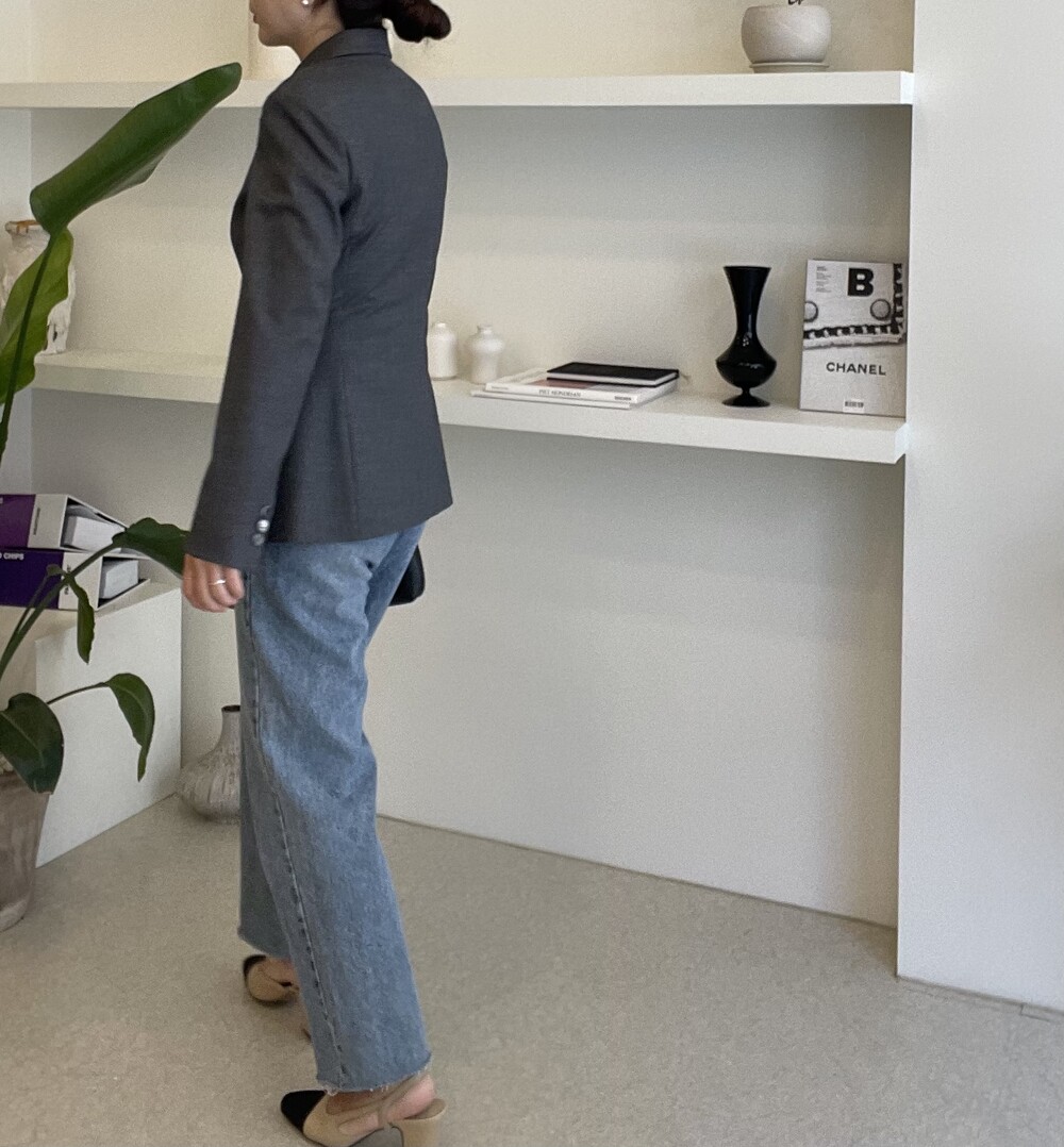 어깨선은 살짝 여유가 있고 전체적으로 슬림한 라인이 특징적인 자켓입니다.