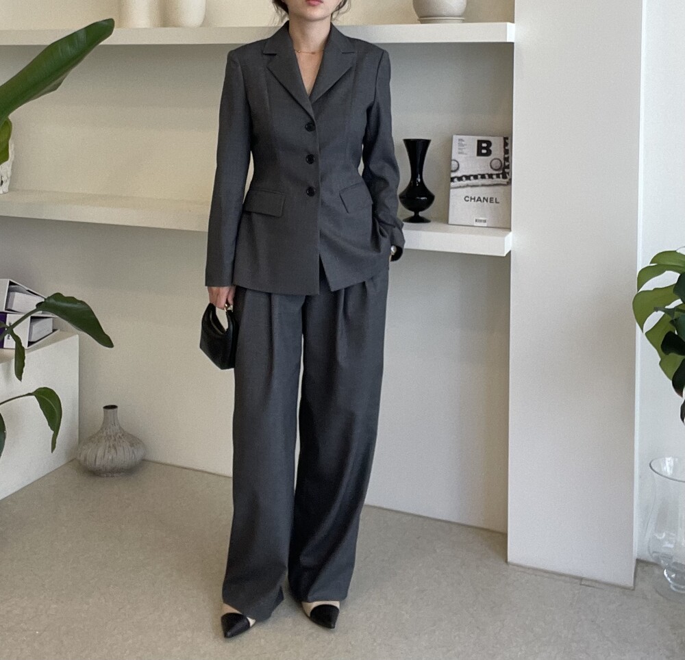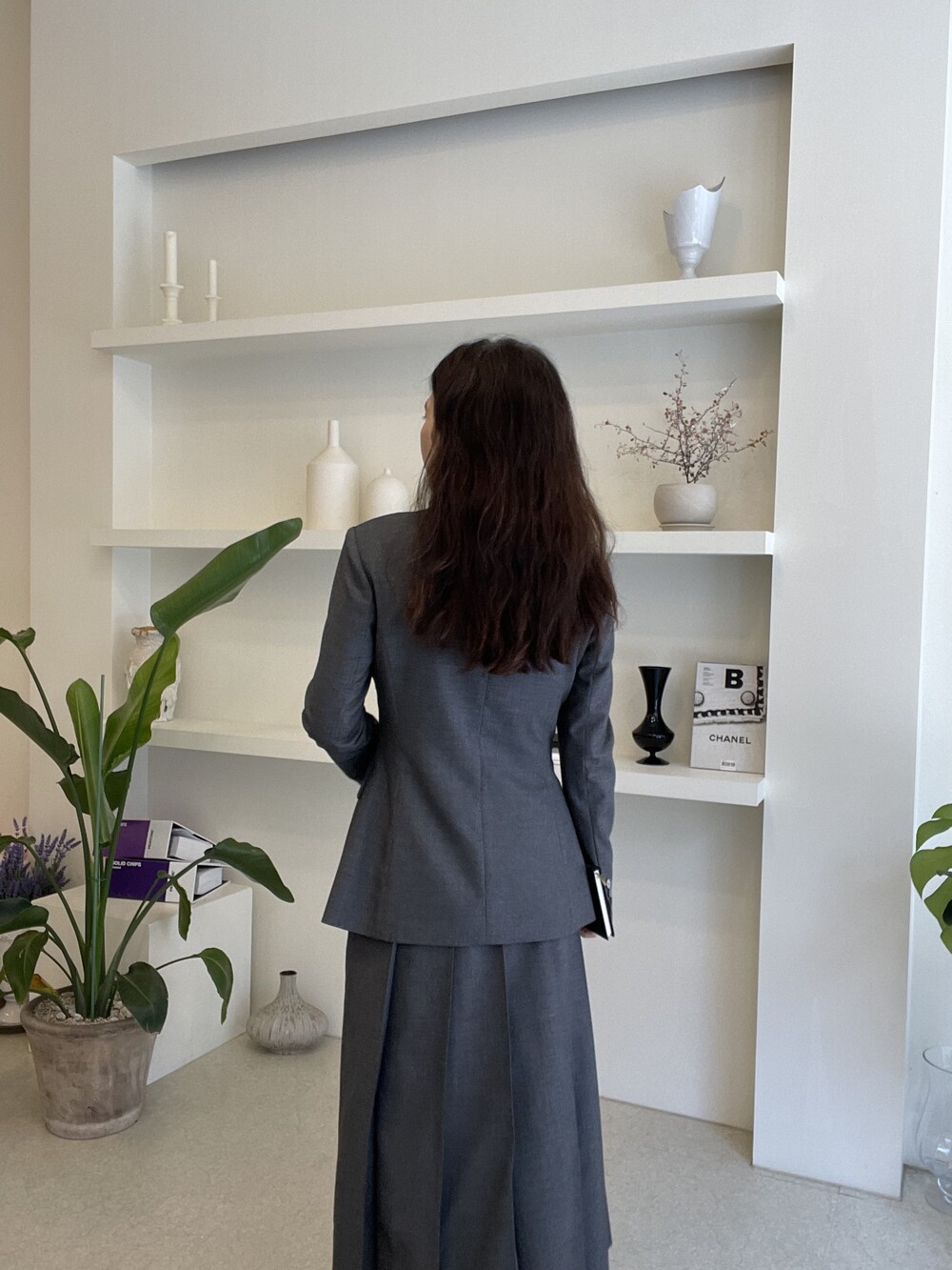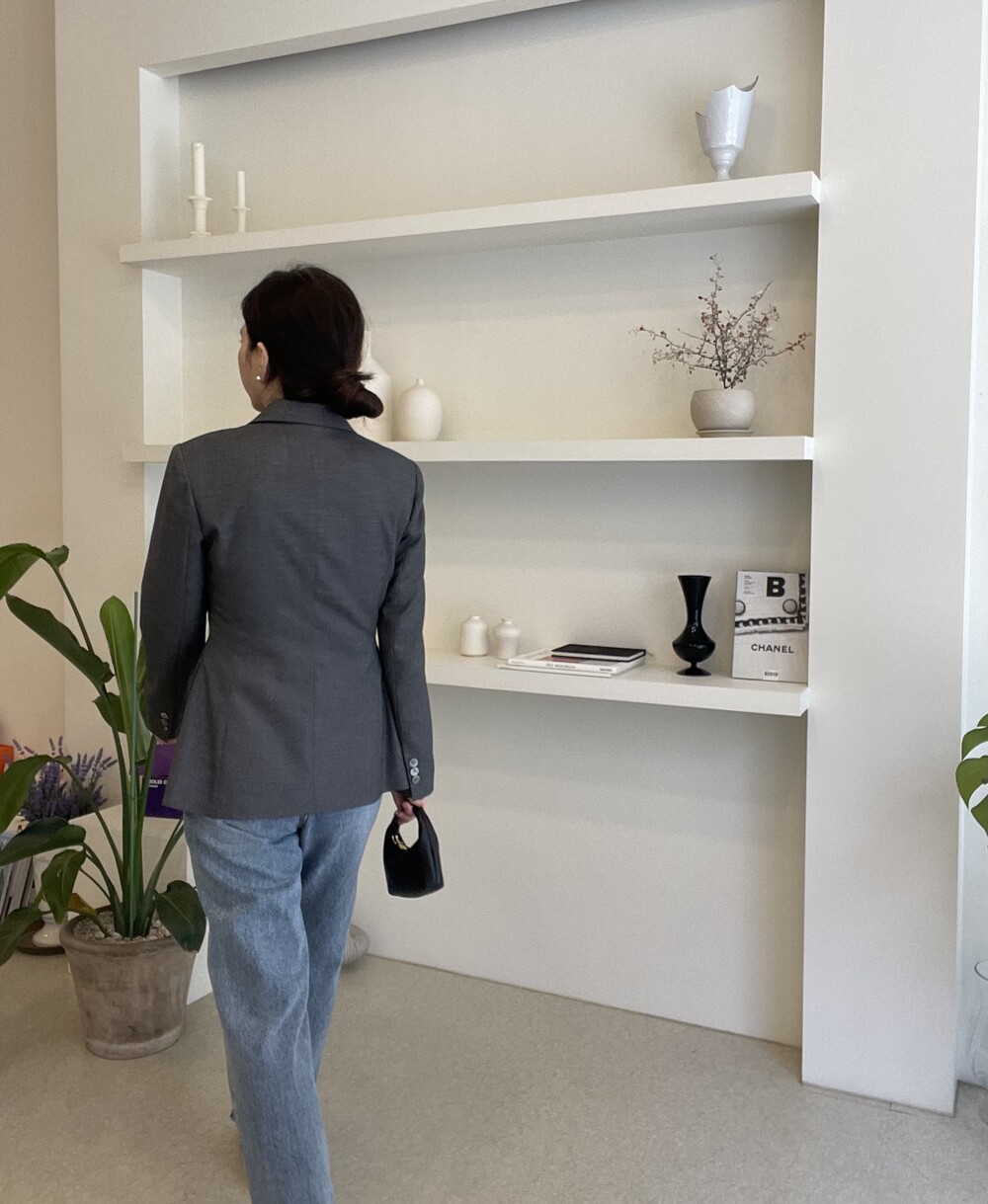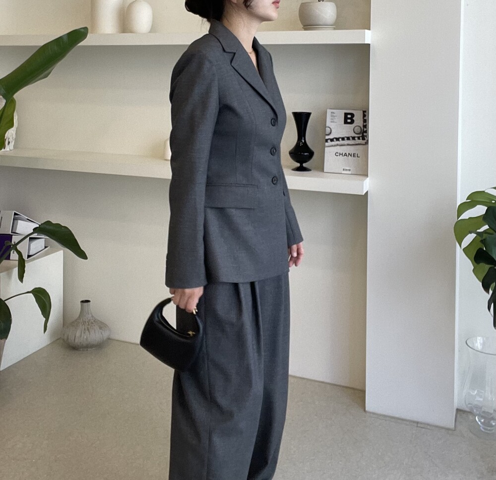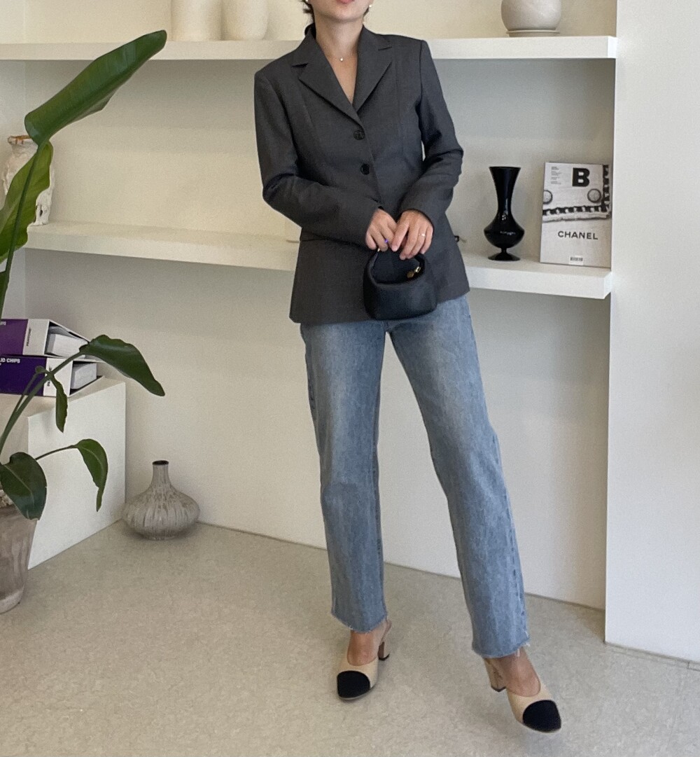어깨선은 살짝 여유가 있고 전체적으로 슬림한 라인이 특징적인 자켓입니다.