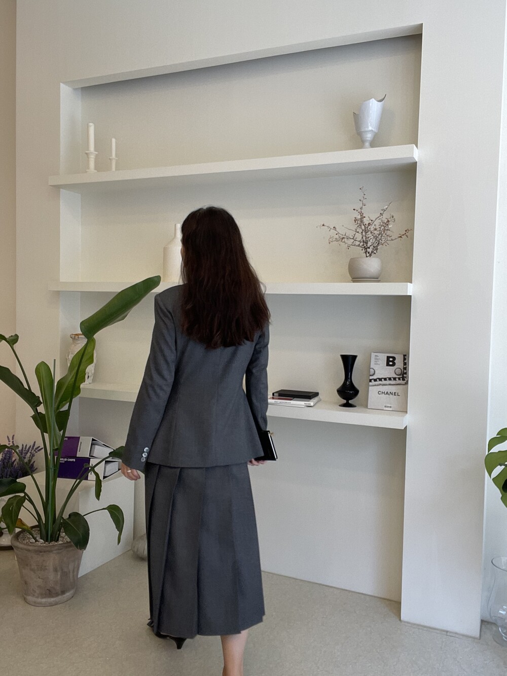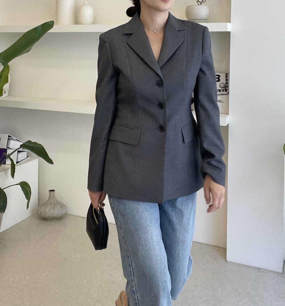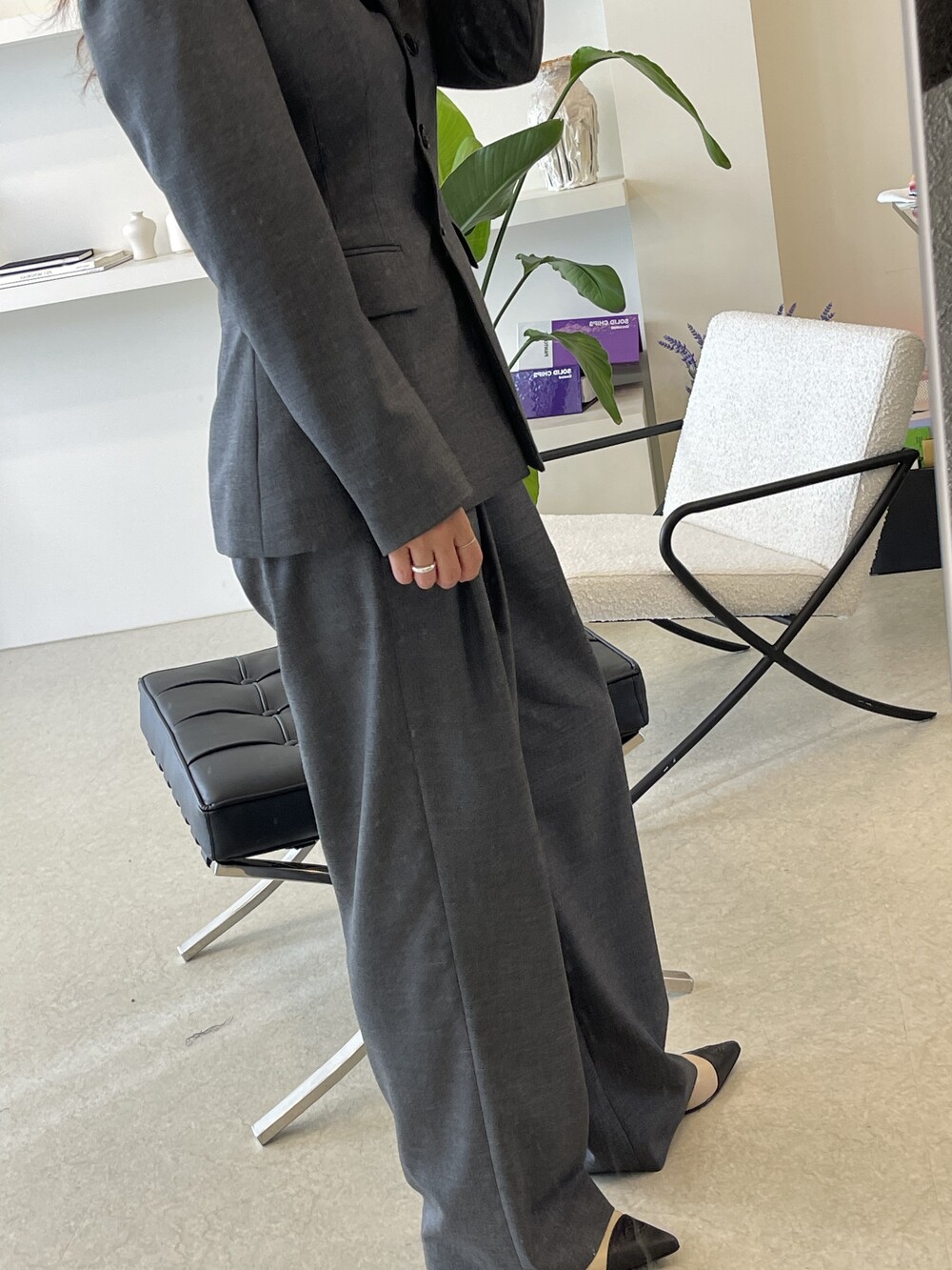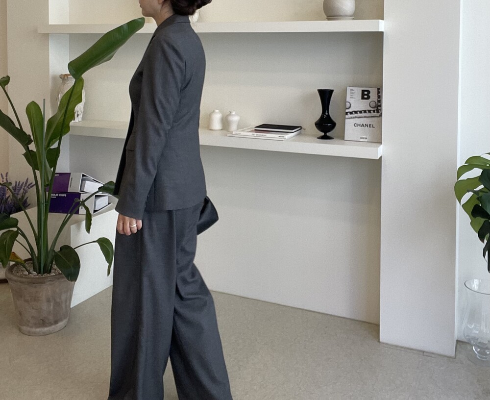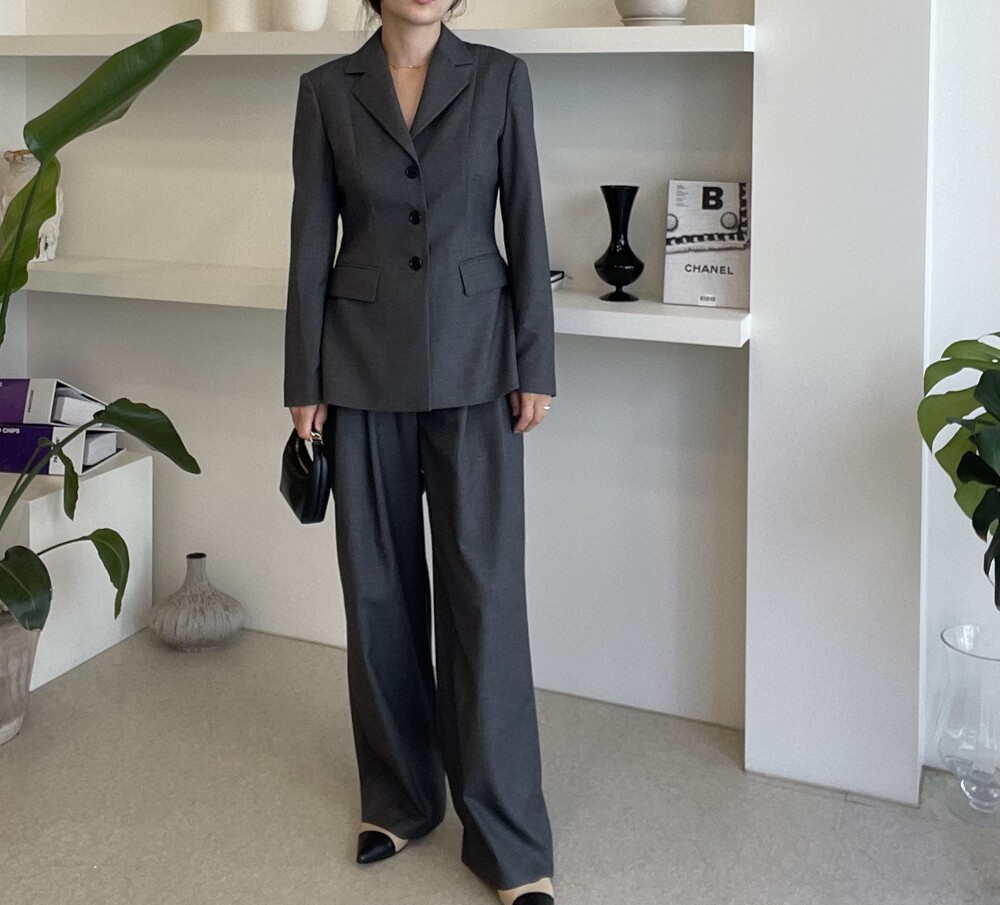 어깨선은 살짝 여유가 있고 전체적으로 슬림한 라인이 특징적인 자켓입니다.
