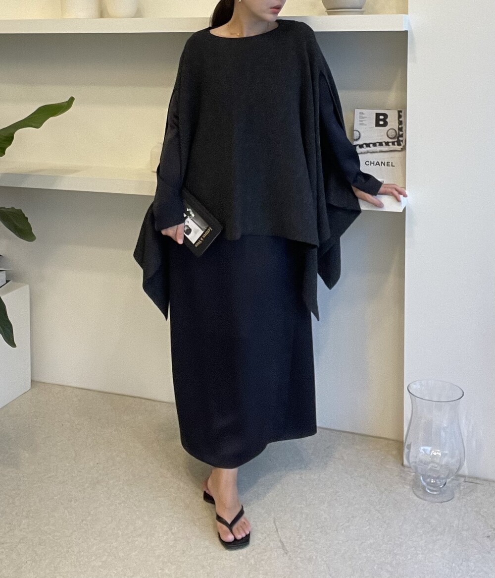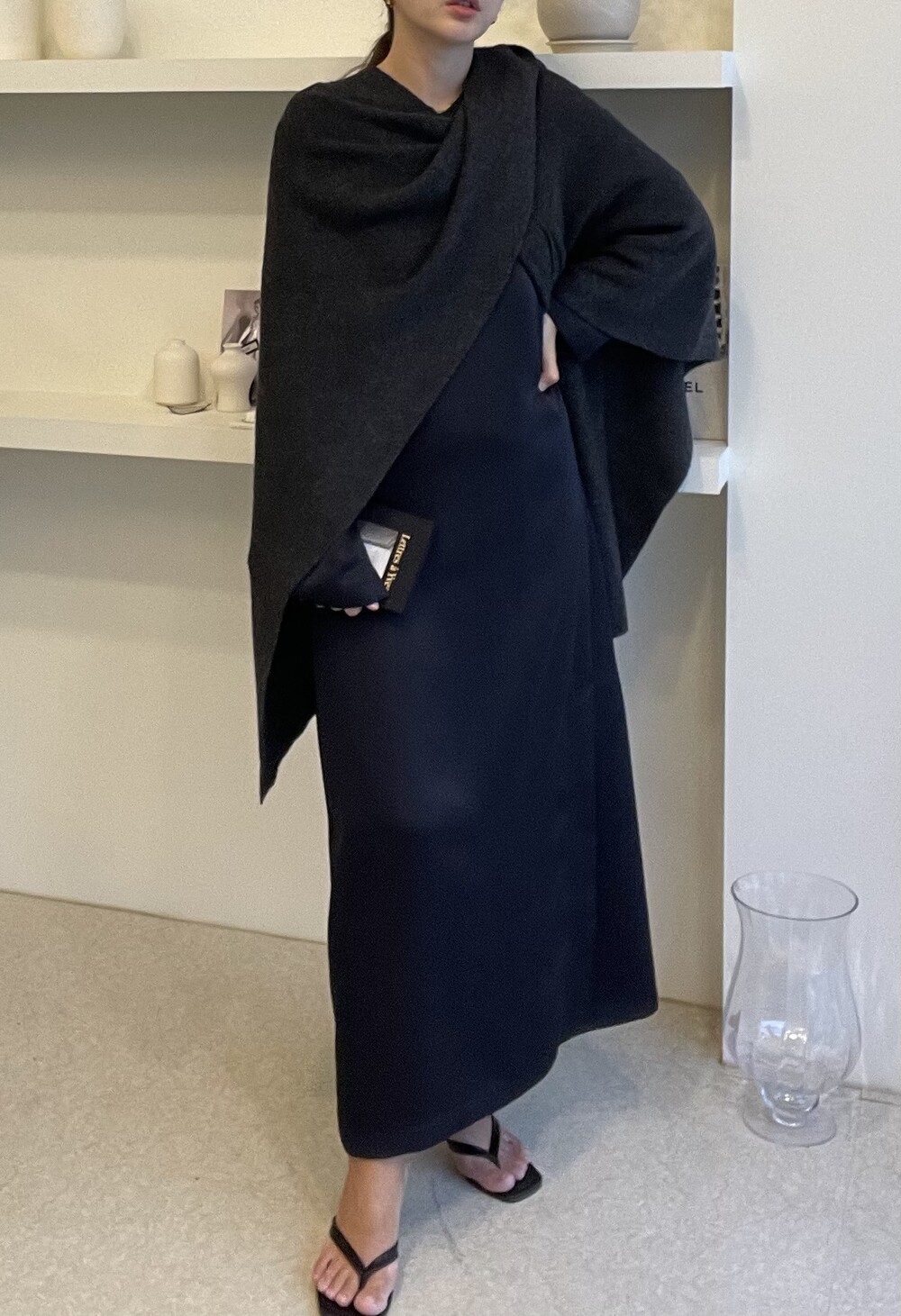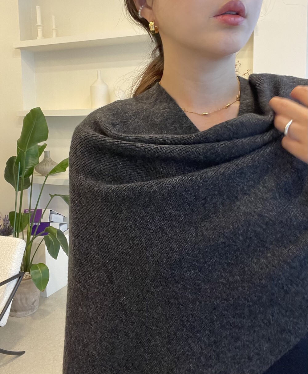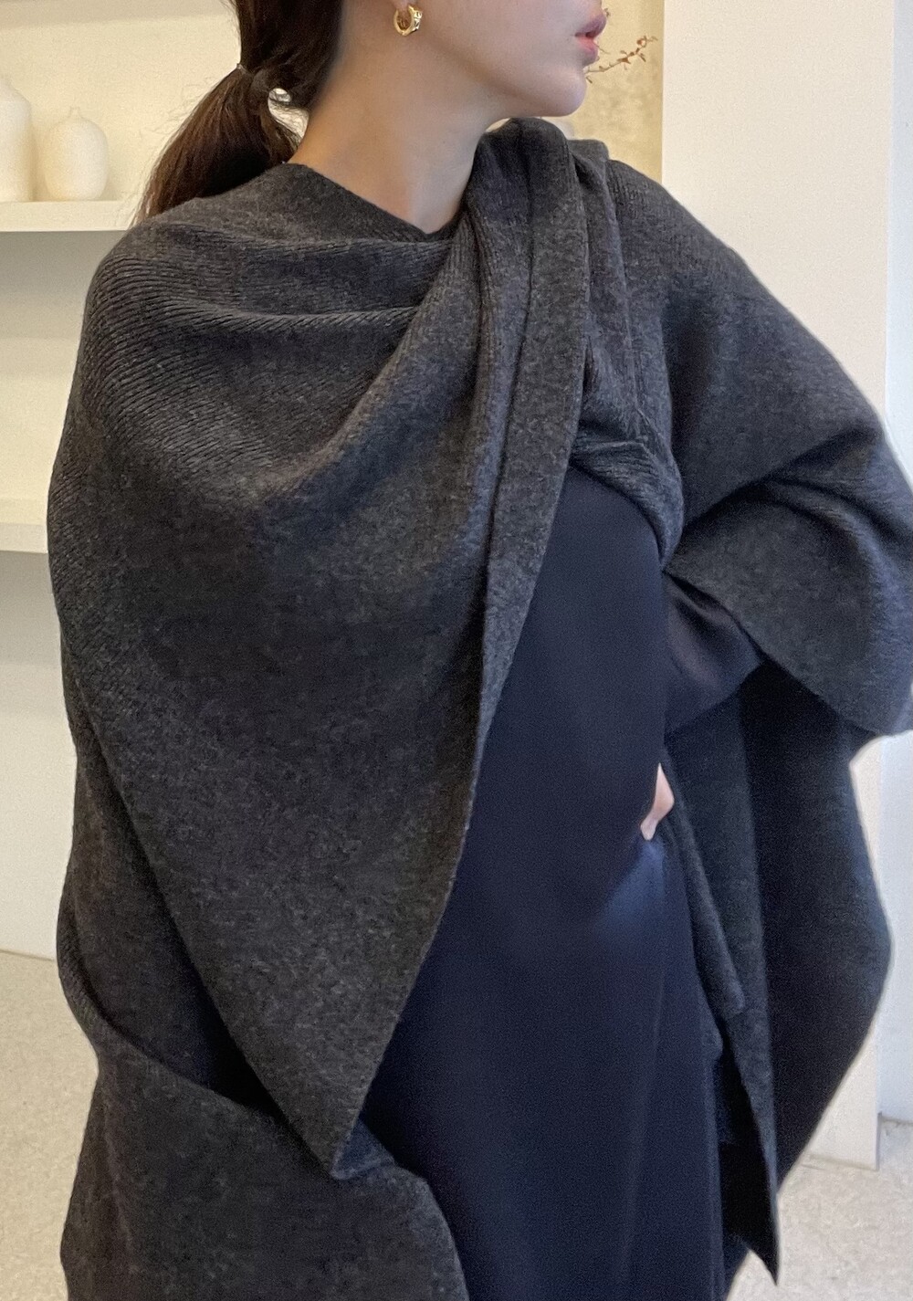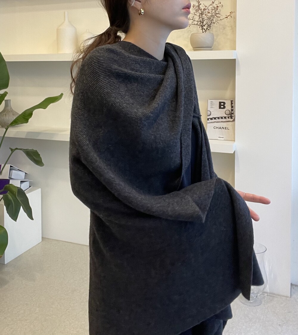 특히 목선을 V 선으로 연출하면 더 롱한 기장감을 느낄 수 있고, 이 상태에서 한쪽을 옆으로 넘겨주시면 드레이프 느낌이 더 살아나는 숄 연출이 완성됩니다.