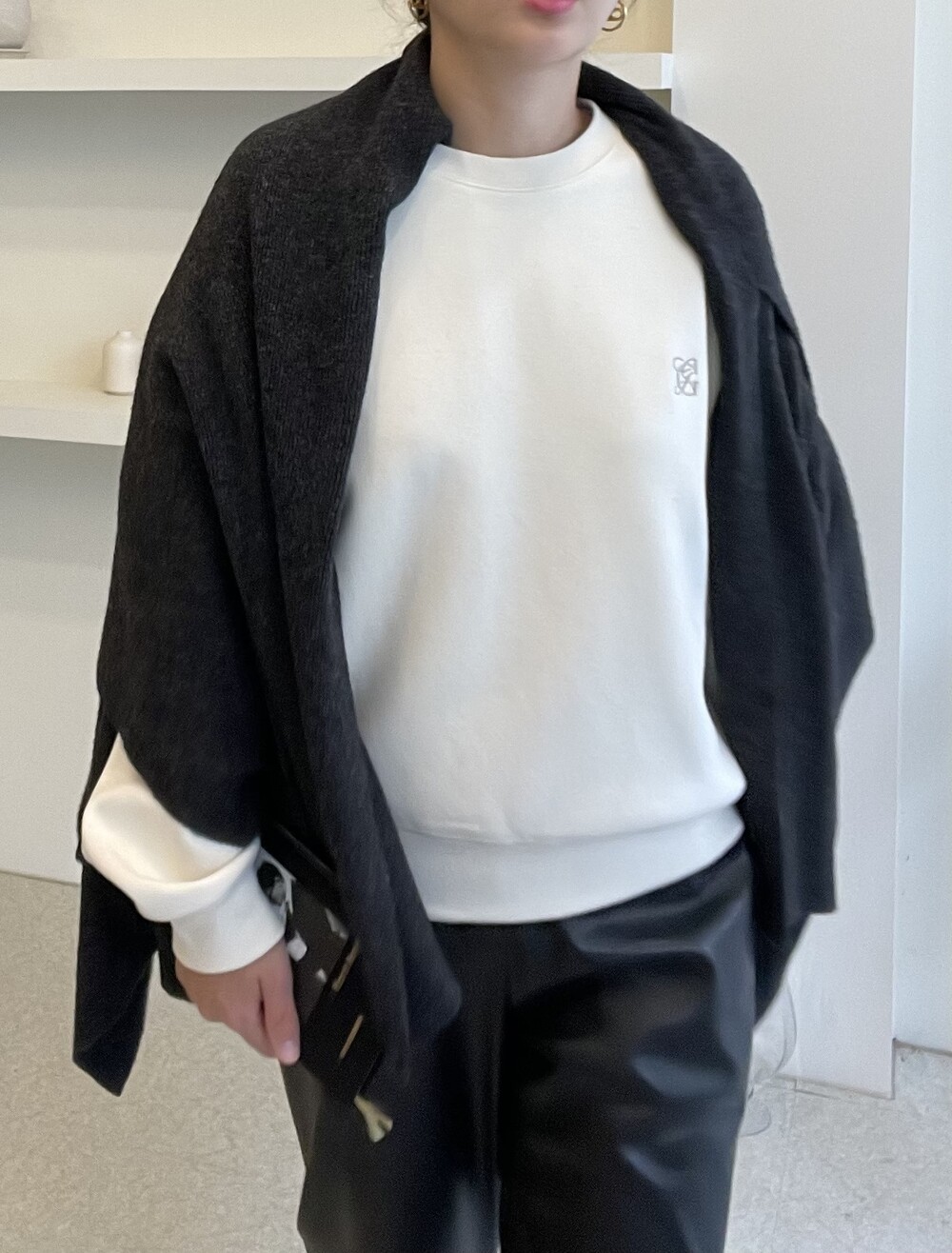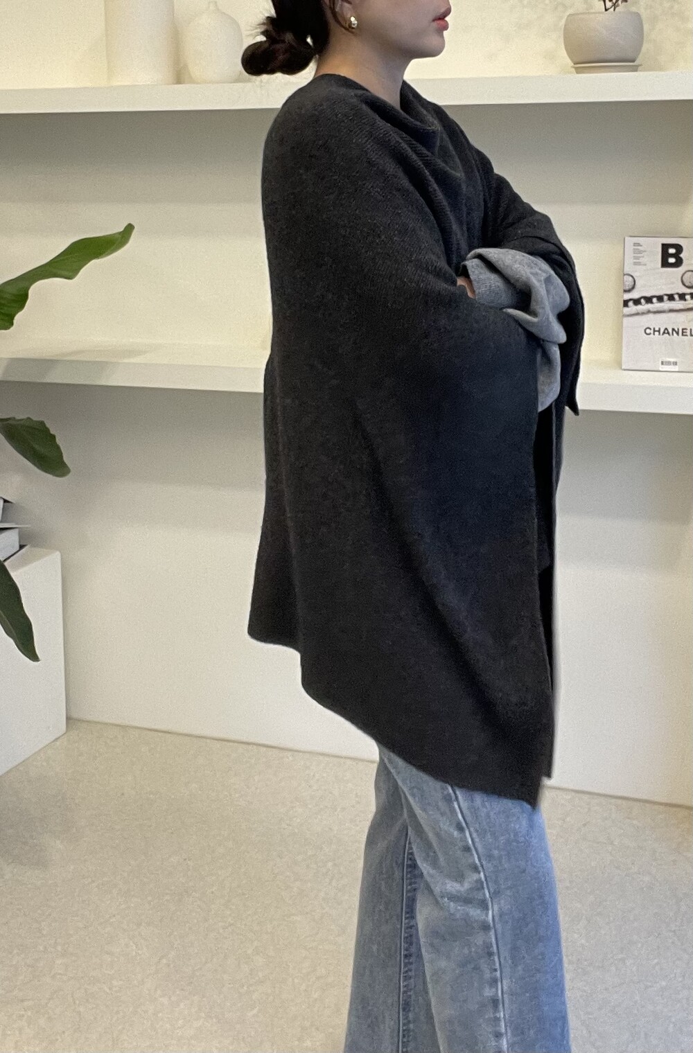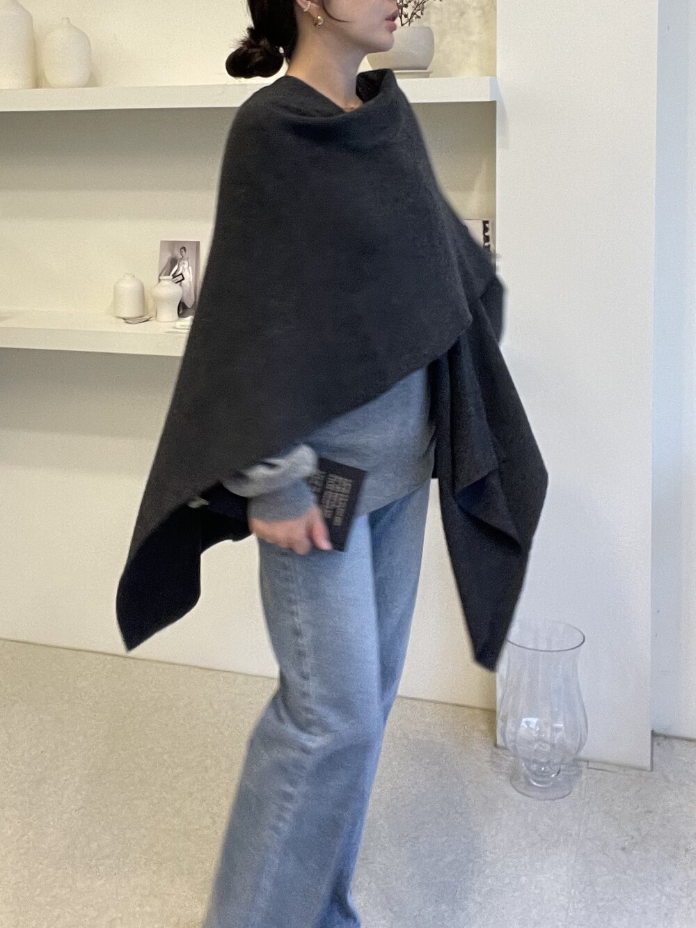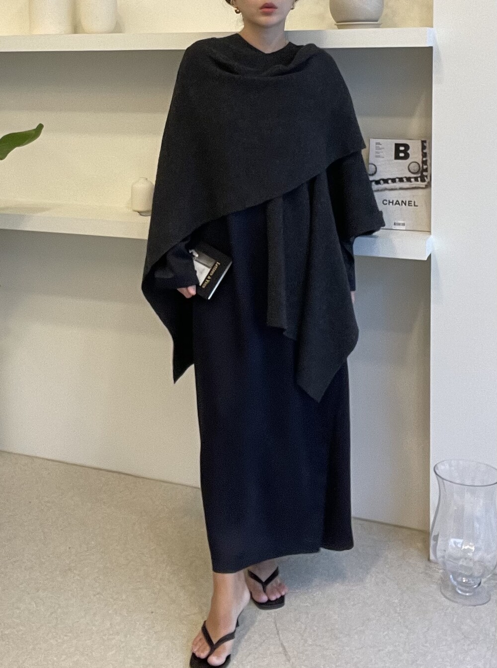 특히 목선을 V 선으로 연출하면 더 롱한 기장감을 느낄 수 있고, 이 상태에서 한쪽을 옆으로 넘겨주시면 드레이프 느낌이 더 살아나는 숄 연출이 완성됩니다.