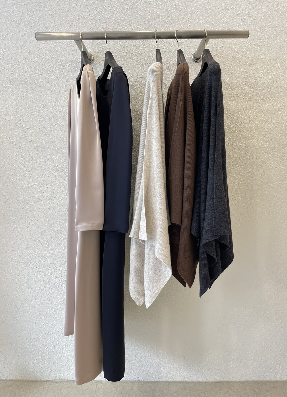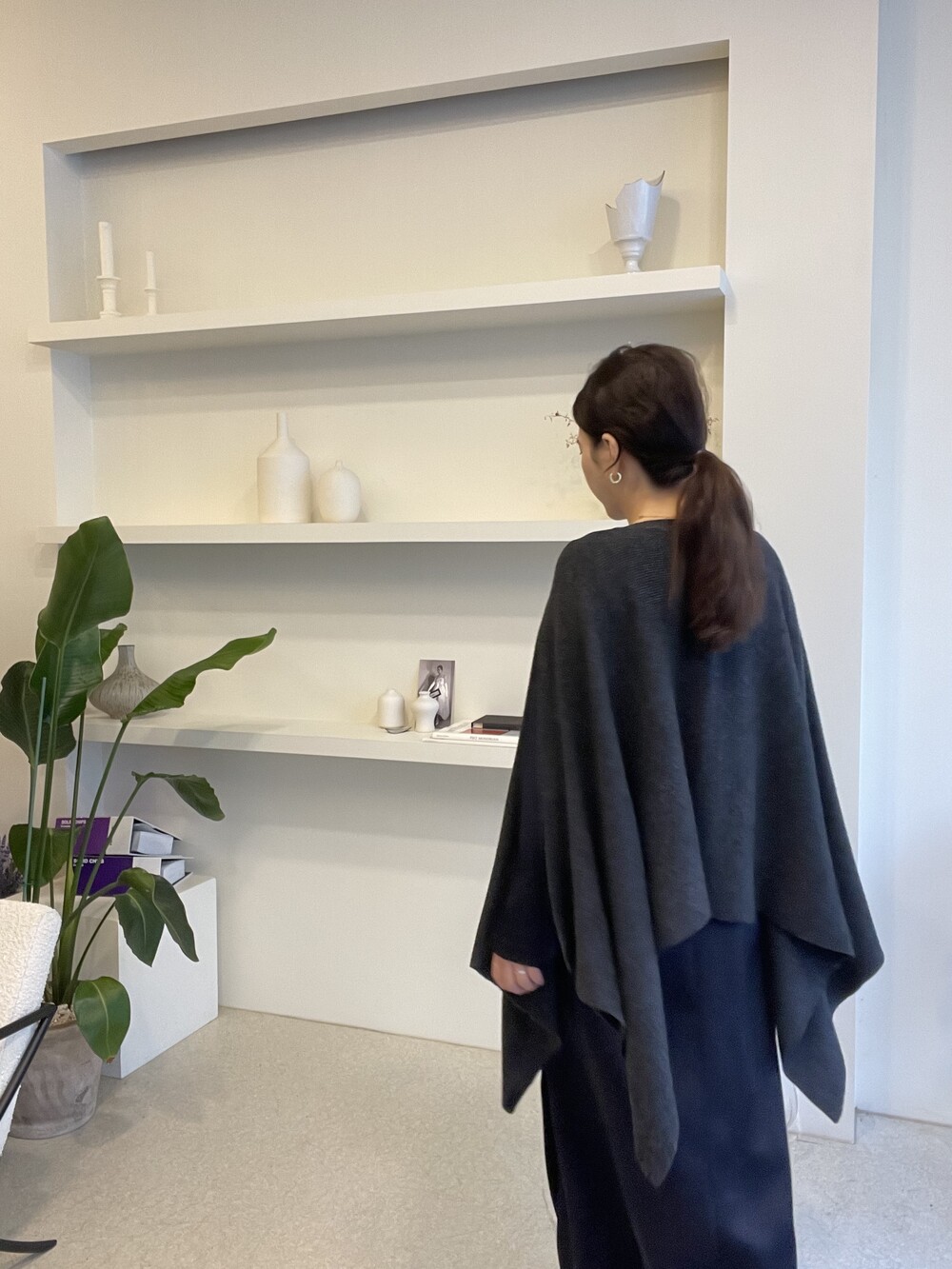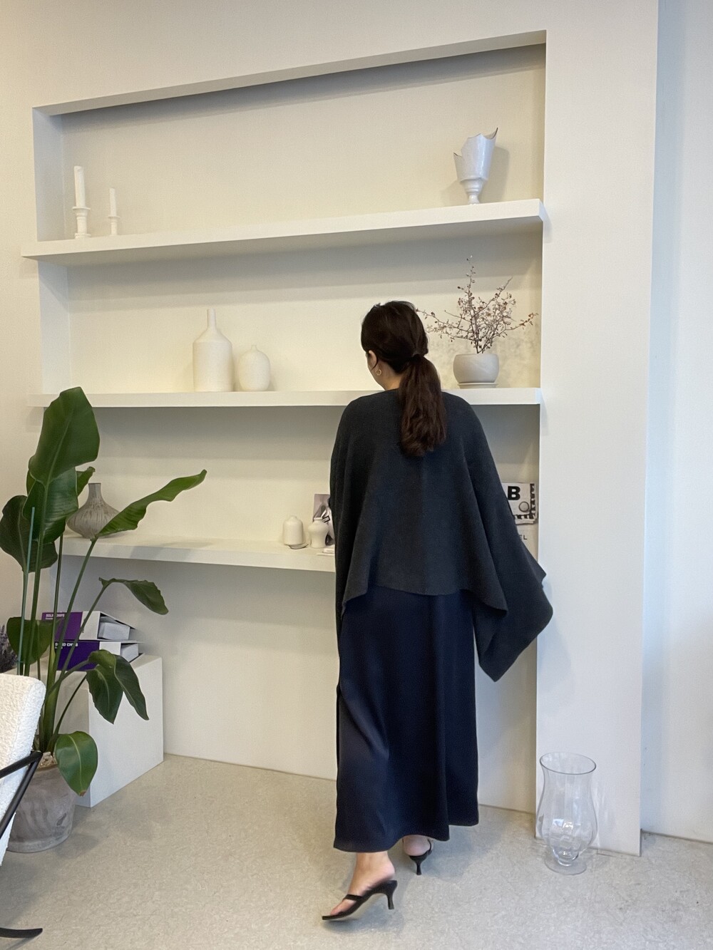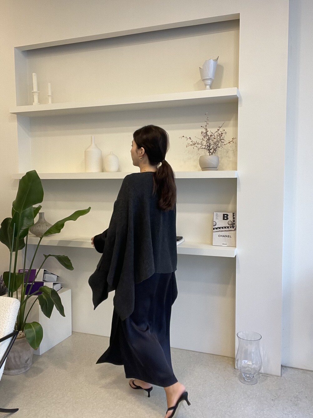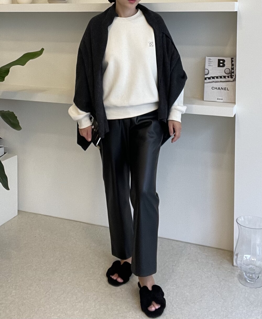 특히 목선을 V 선으로 연출하면 더 롱한 기장감을 느낄 수 있고, 이 상태에서 한쪽을 옆으로 넘겨주시면 드레이프 느낌이 더 살아나는 숄 연출이 완성됩니다.