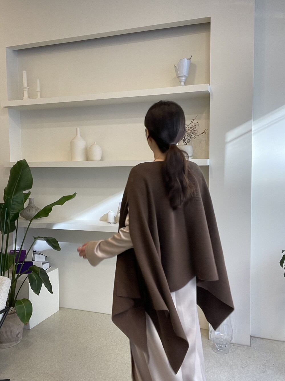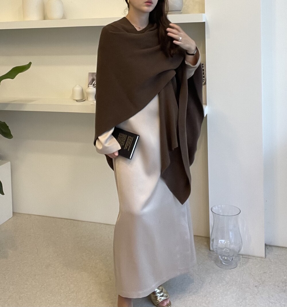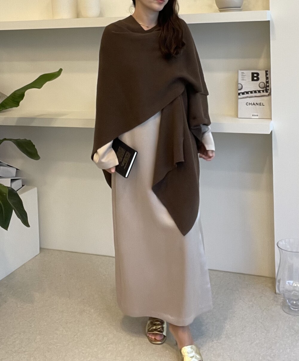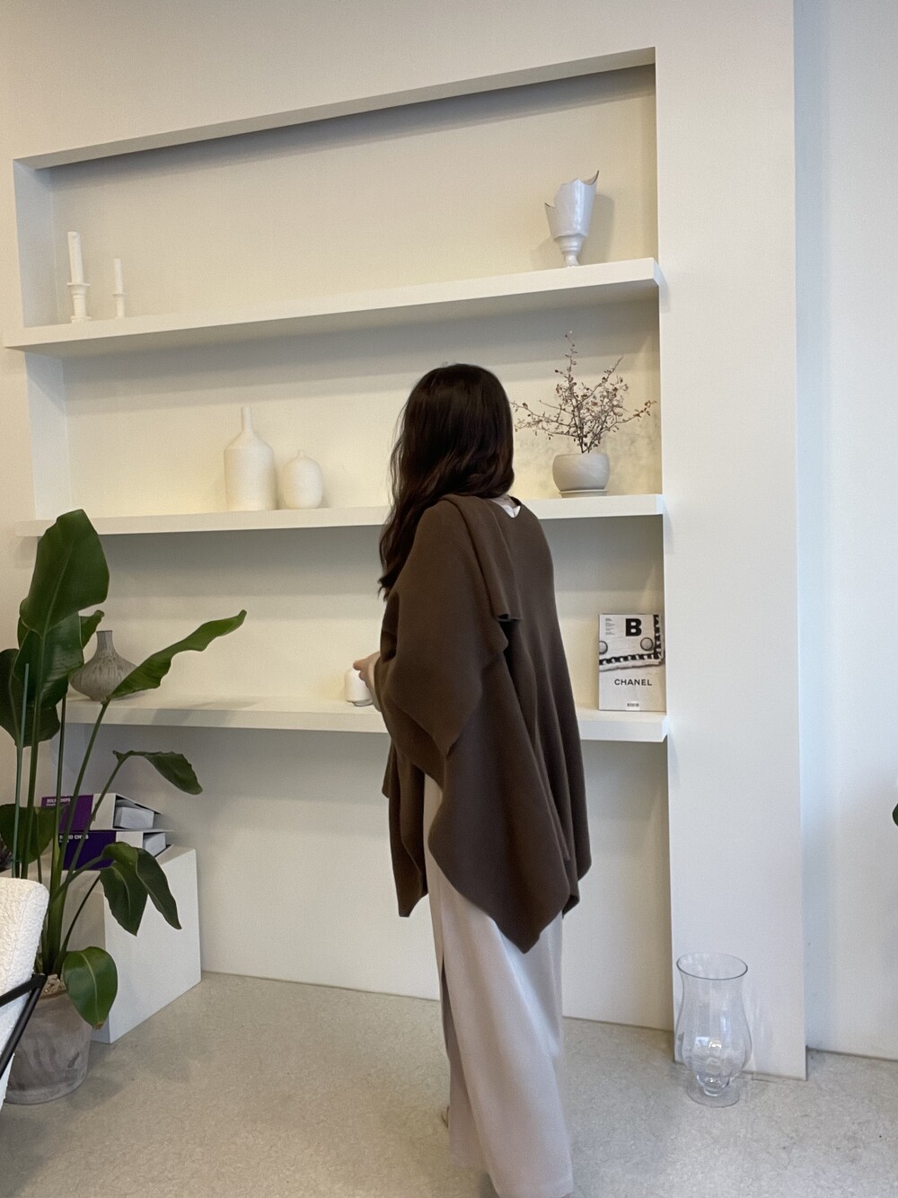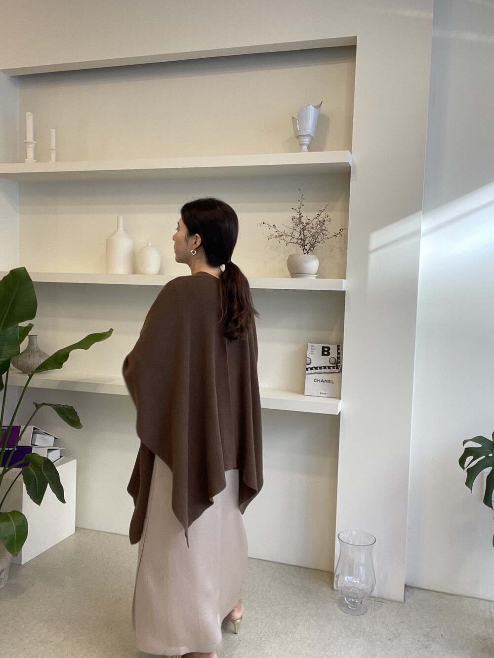 특히 목선을 V 선으로 연출하면 더 롱한 기장감을 느낄 수 있고, 이 상태에서 한쪽을 옆으로 넘겨주시면 드레이프 느낌이 더 살아나는 숄 연출이 완성됩니다.