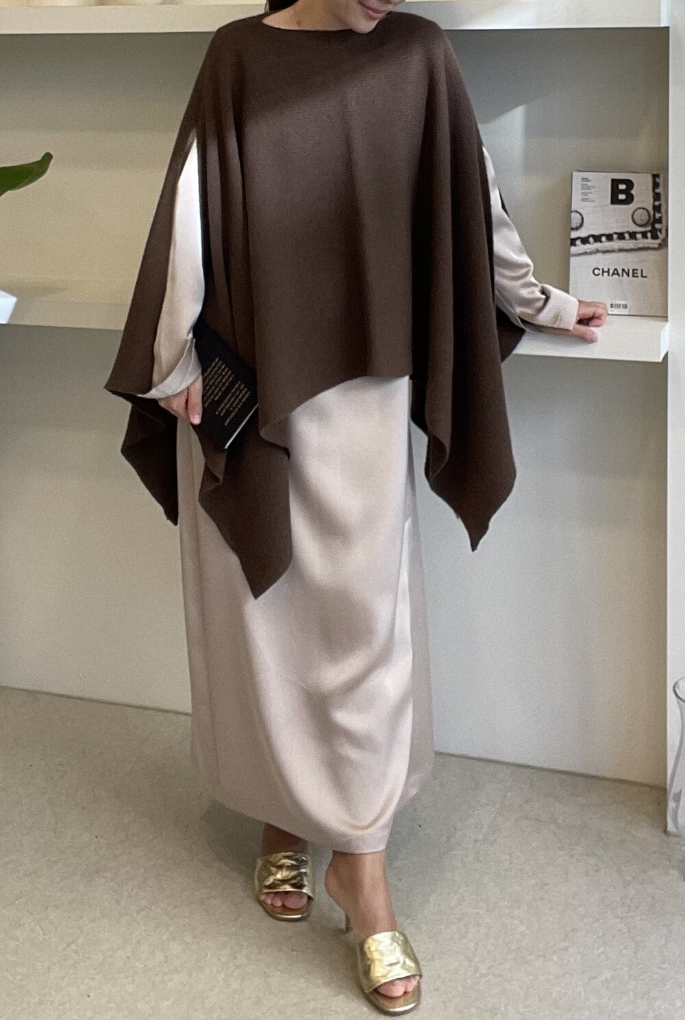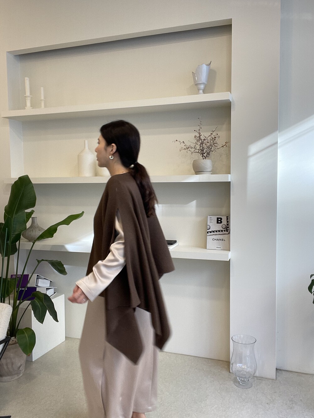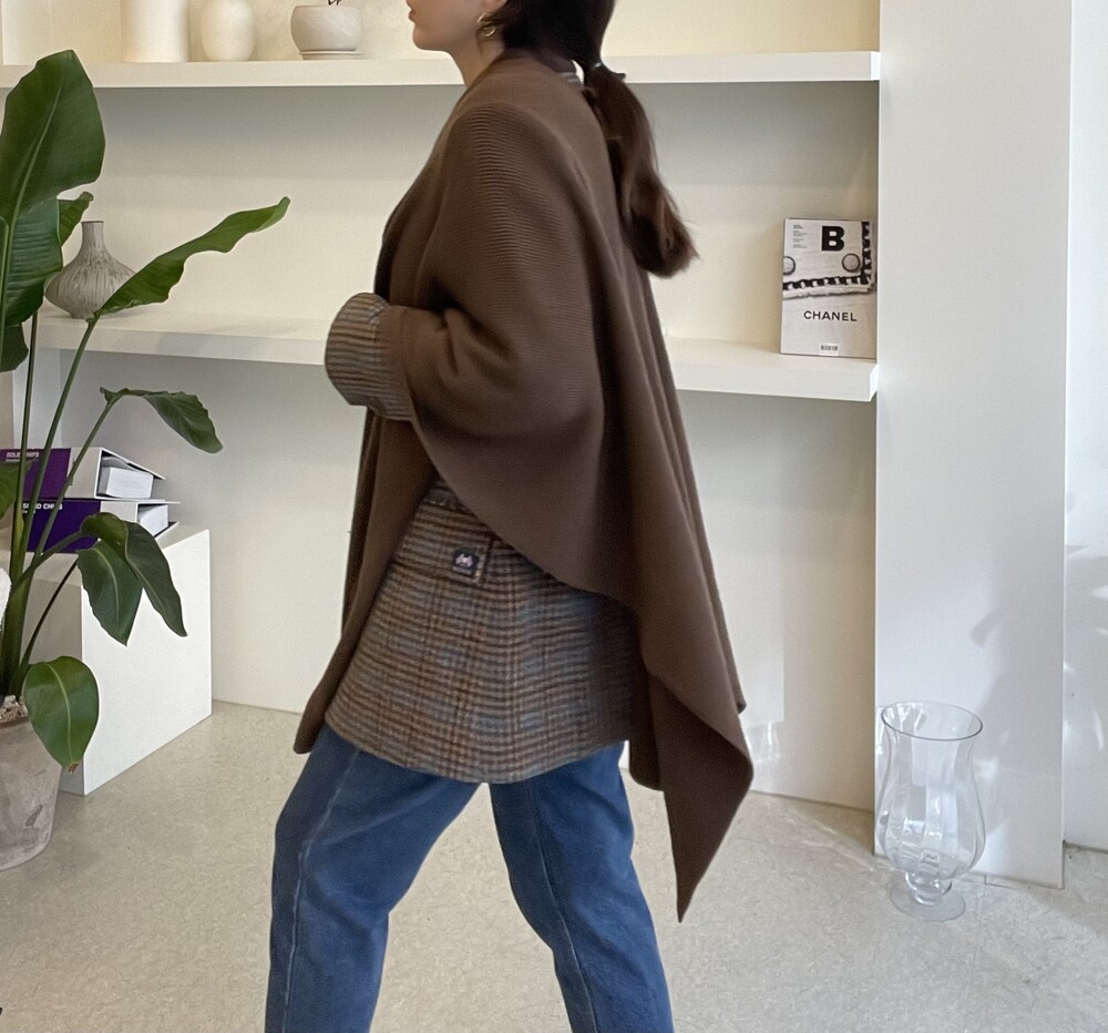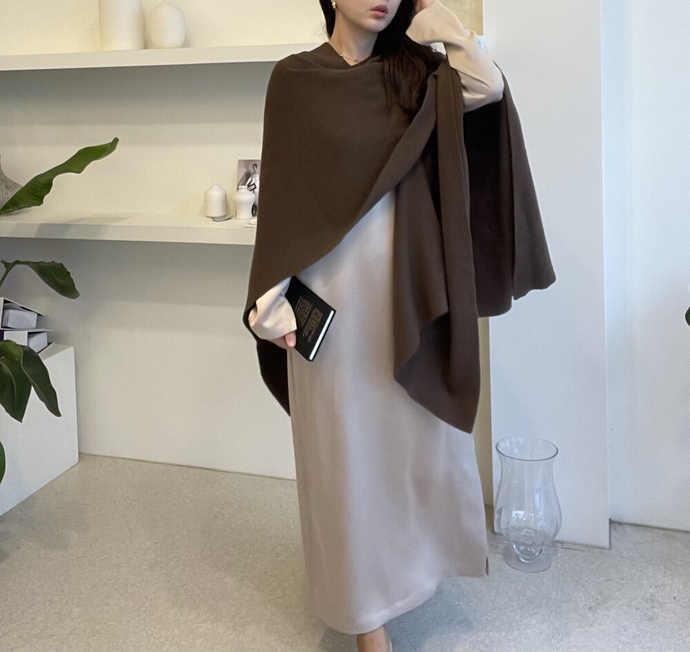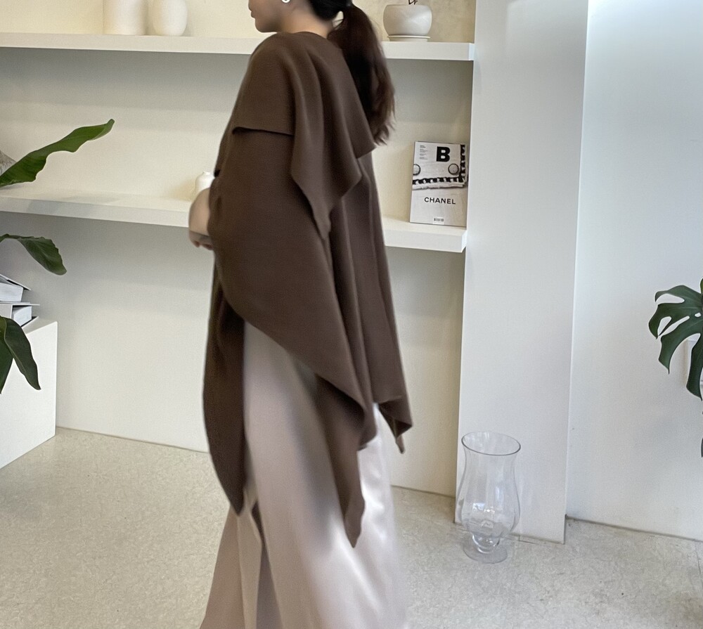 특히 목선을 V 선으로 연출하면 더 롱한 기장감을 느낄 수 있고, 이 상태에서 한쪽을 옆으로 넘겨주시면 드레이프 느낌이 더 살아나는 숄 연출이 완성됩니다.