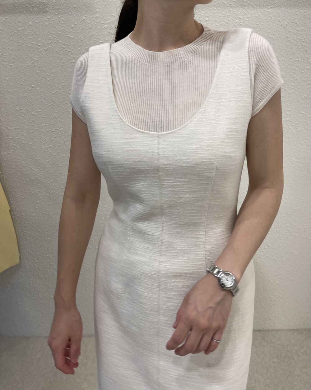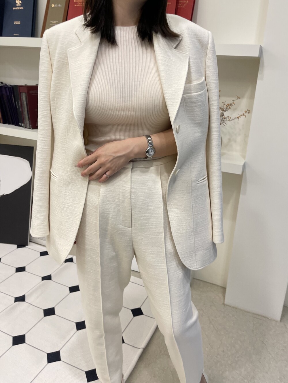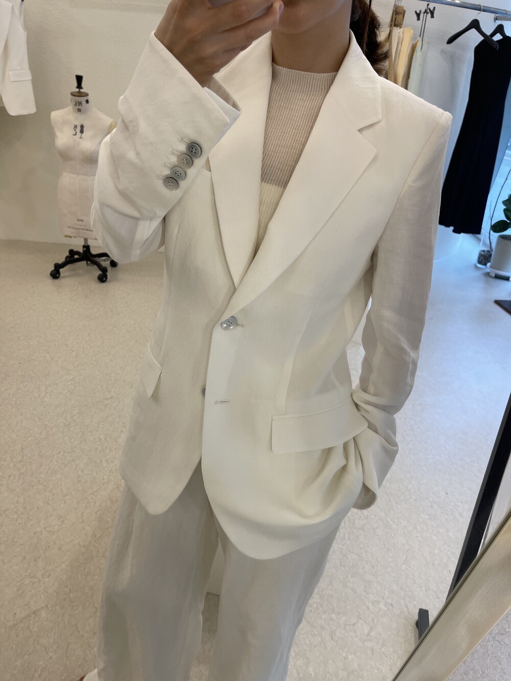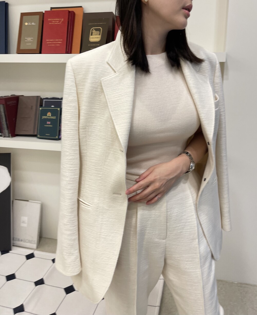 오프 화이트 컬러는 쨍한 화이트 속옷과 매치시 비침이 있으니, 은은한 스킨 컬러의 속옷과 매치해주세요.