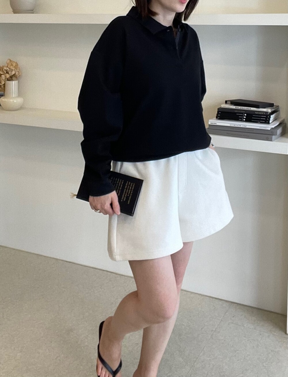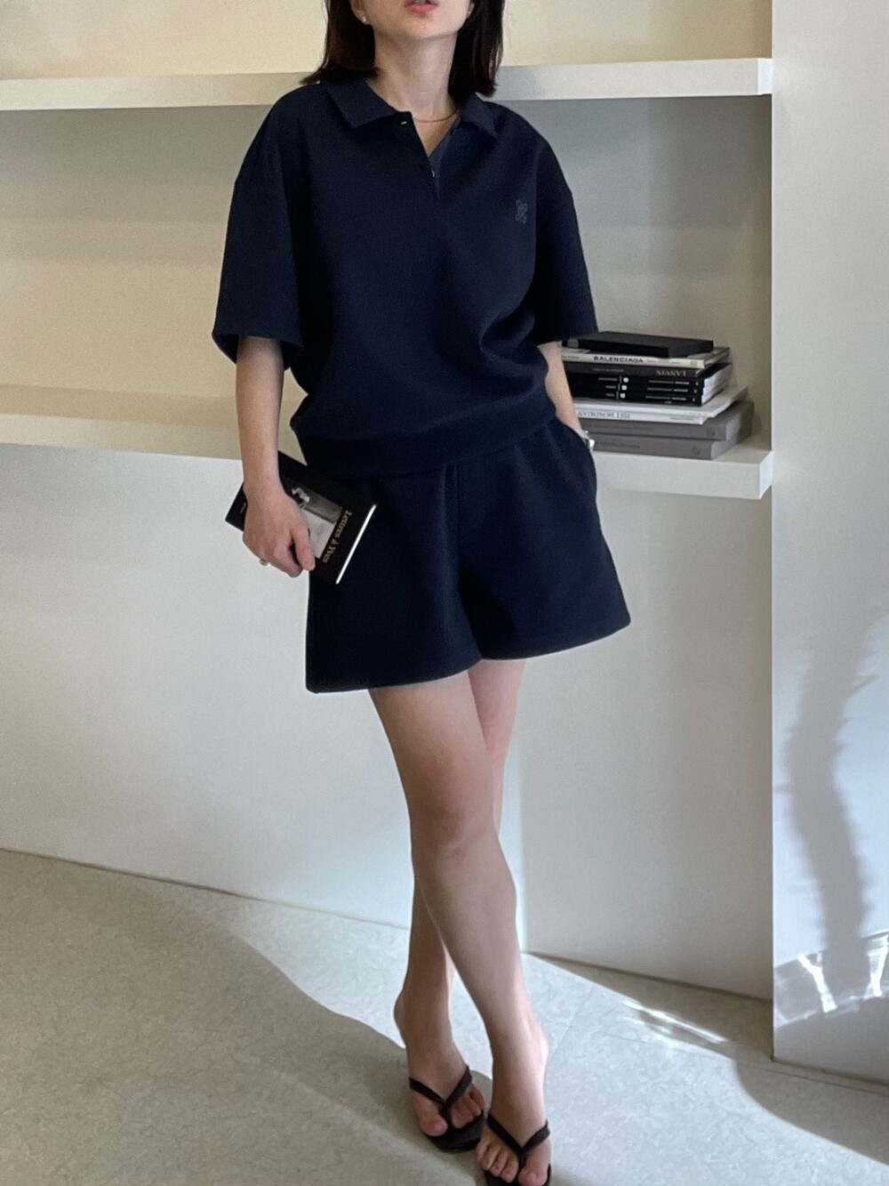에어리한 소재로 출시된 크림 & 네이비 컬러의 반바지와 동일 핏입니다.