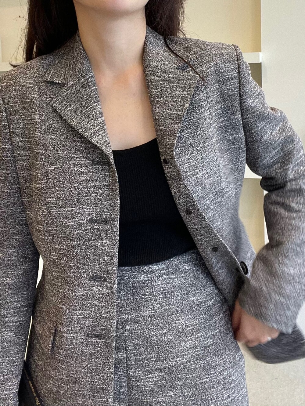 매우 가벼운 타소재 혼방의 섬세한 트위드 조직이 돋보이는 소재 입니다.