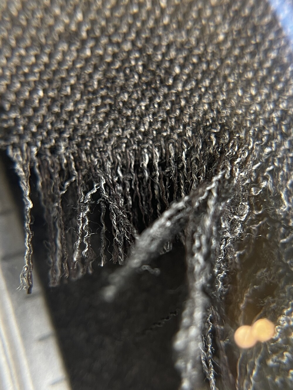 멜란지사를 사용한 계단식 짜임의 직조감과 탄력감을 많이 부여한 꼬임을 좀 더 자세하게 보실 수 있어요.