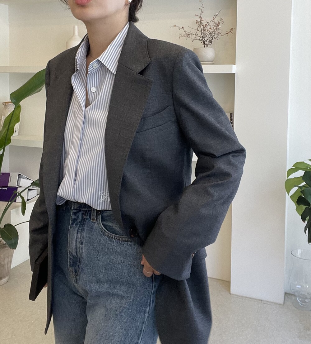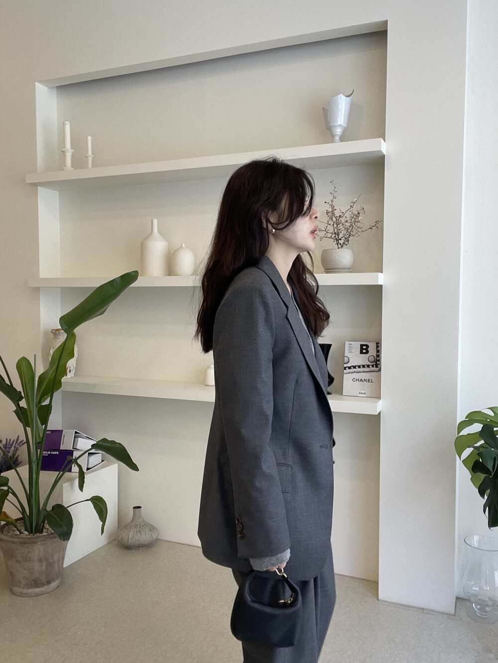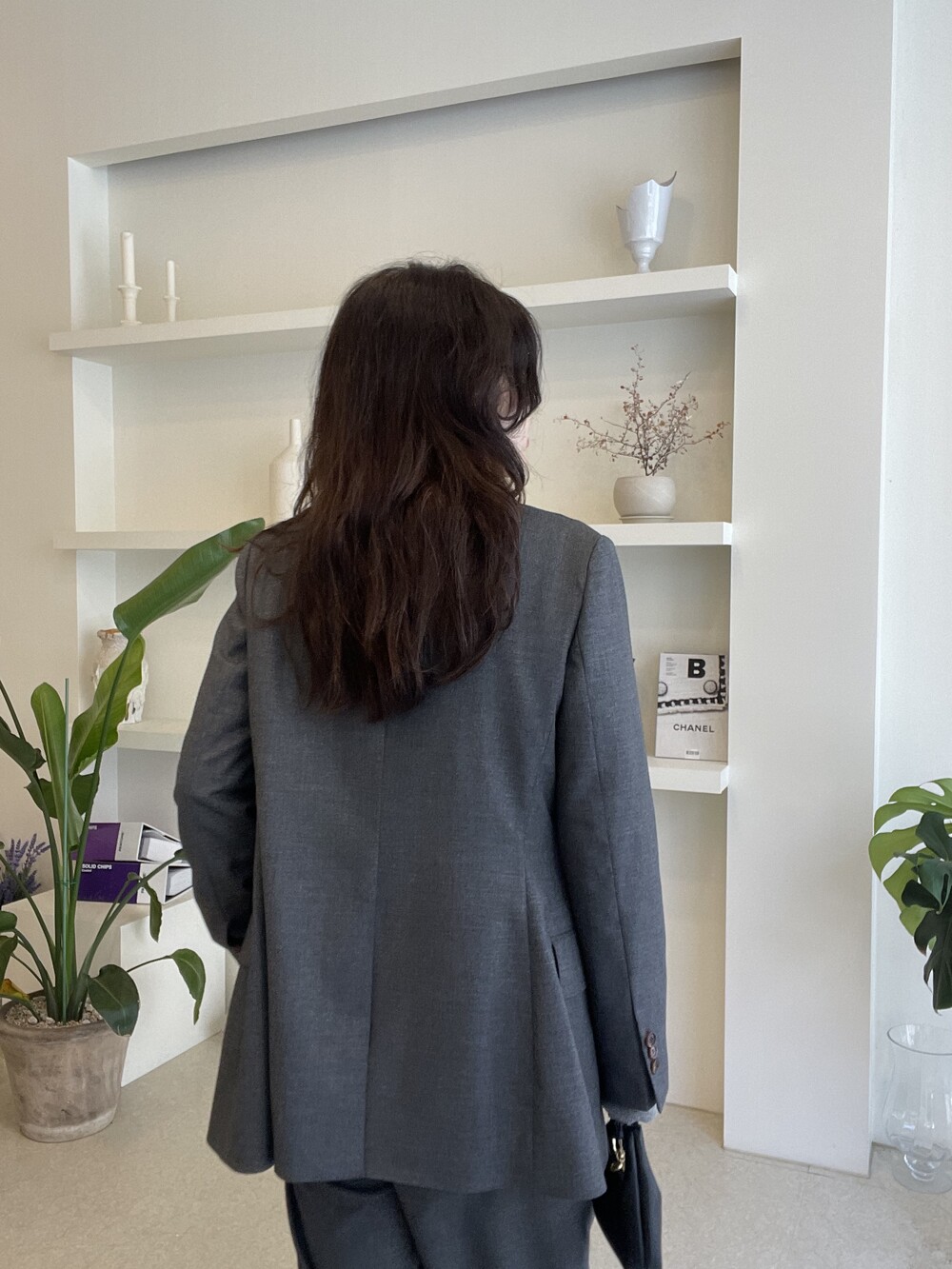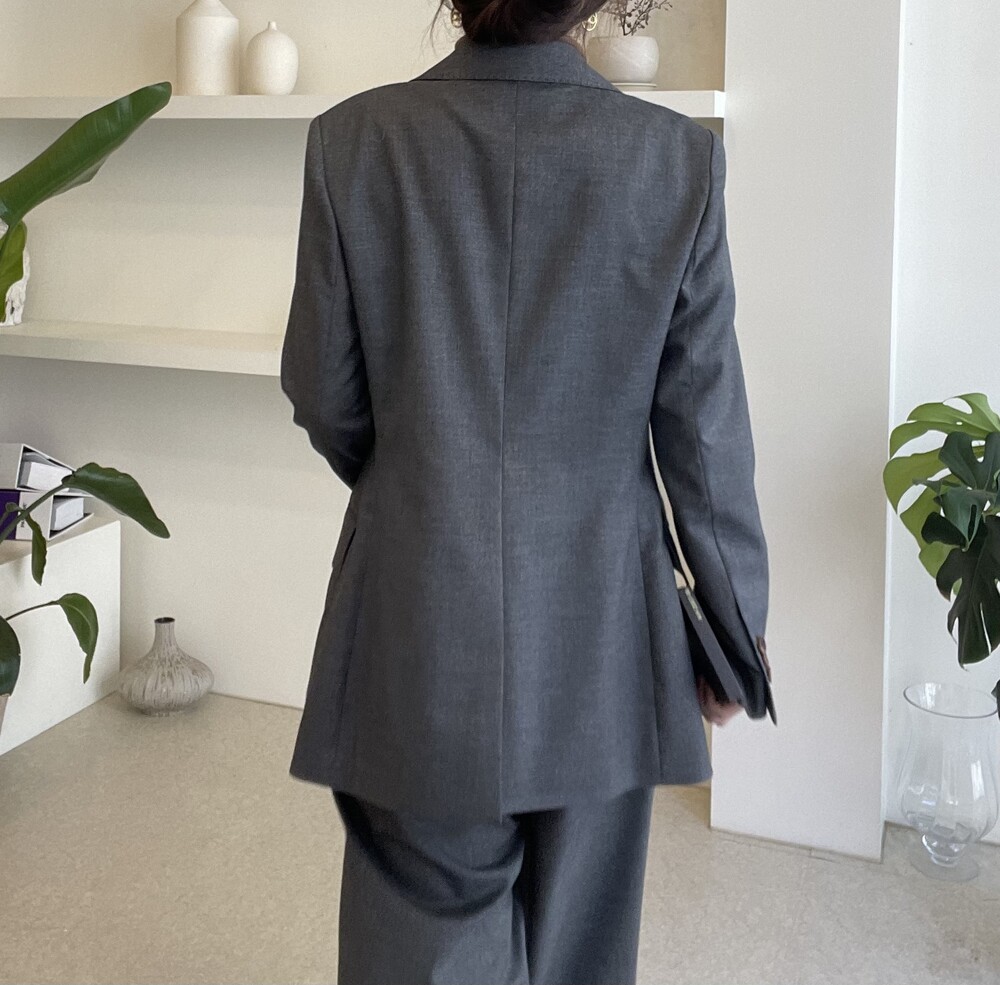 1버튼 클래식 시그니처 자켓이며, 기존에 보여드렸던 총장에서 2cm 정도 짧게 진행되며, 앞단추 / 소매단추 보이는 디자인입니다.