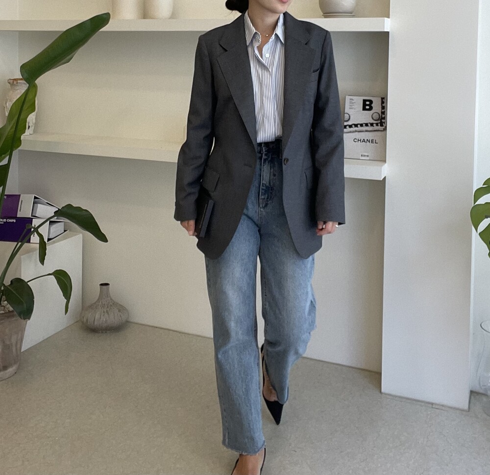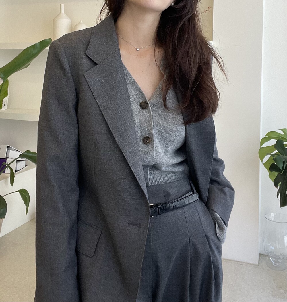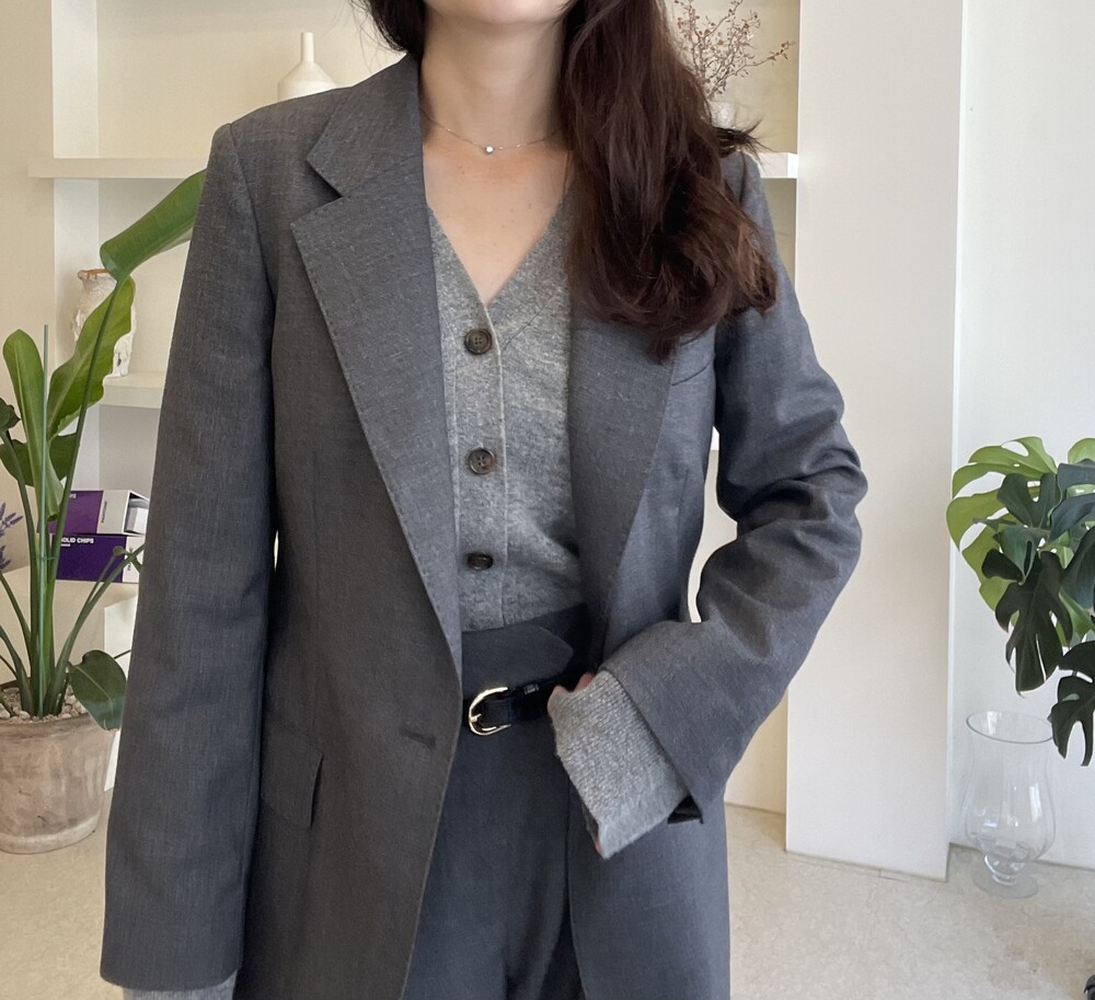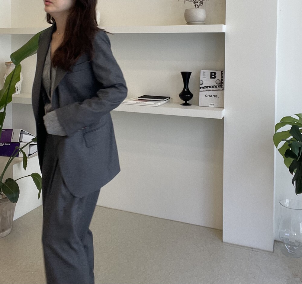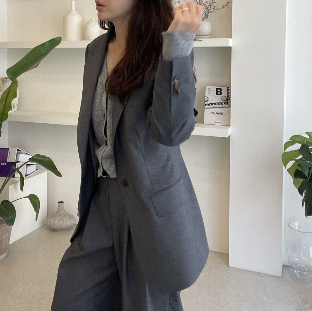 1버튼 클래식 시그니처 자켓이며, 기존에 보여드렸던 총장에서 2cm 정도 짧게 진행되며, 앞단추 / 소매단추 보이는 디자인입니다.