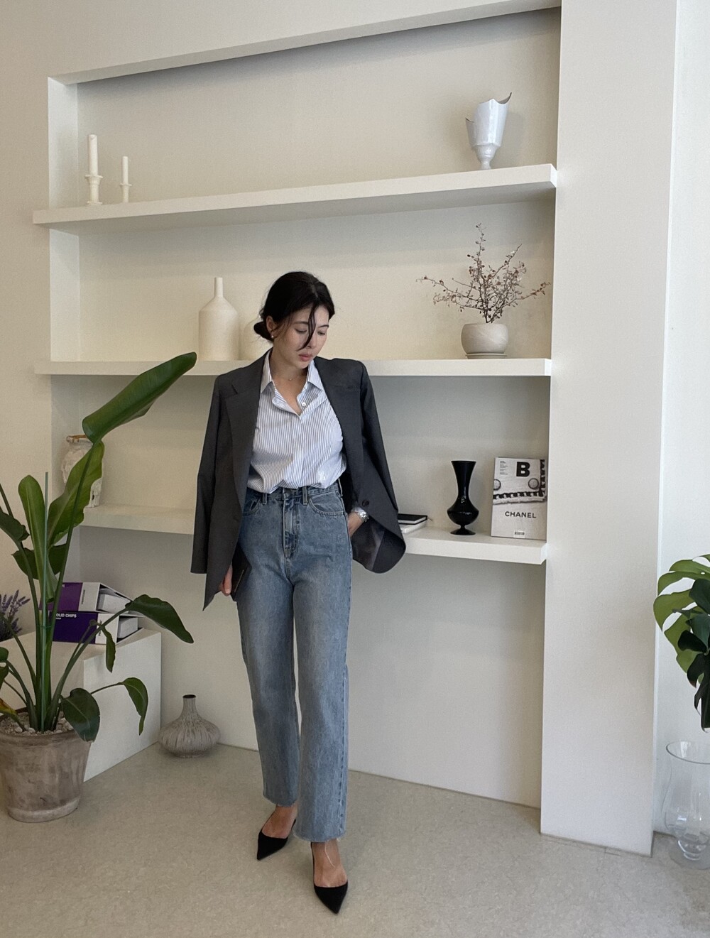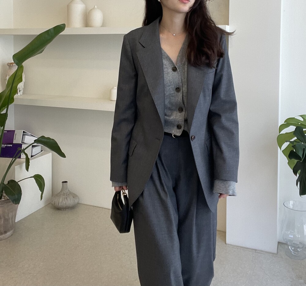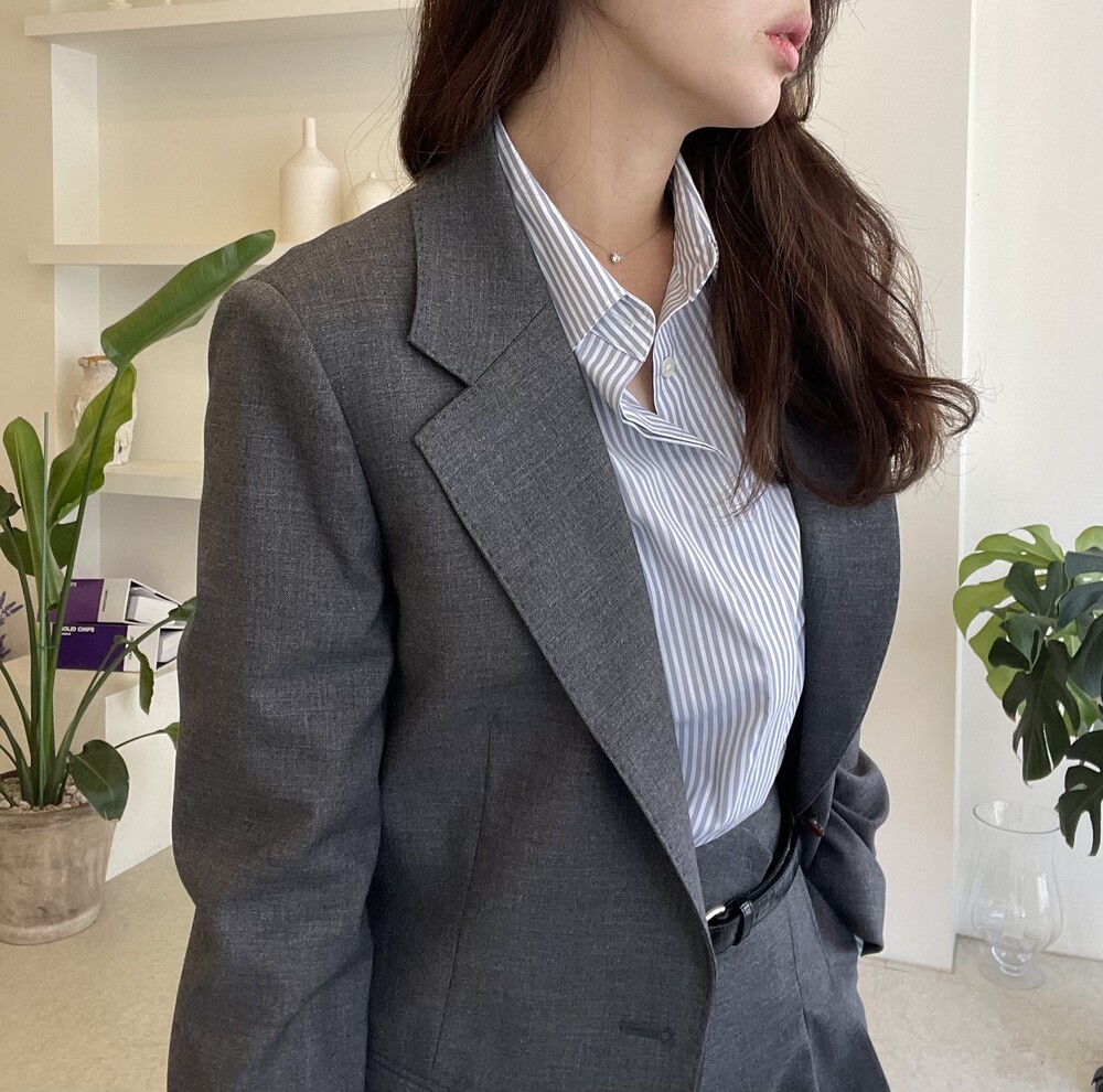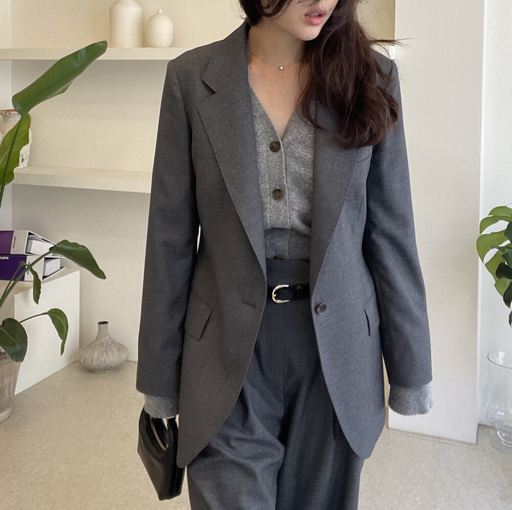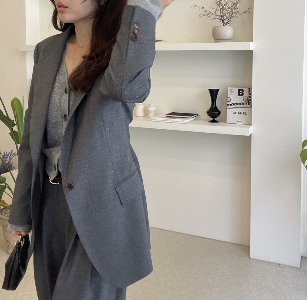 1버튼 클래식 시그니처 자켓이며, 기존에 보여드렸던 총장에서 2cm 정도 짧게 진행되며, 앞단추 / 소매단추 보이는 디자인입니다.