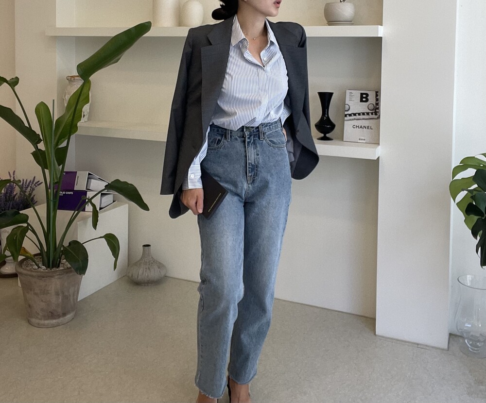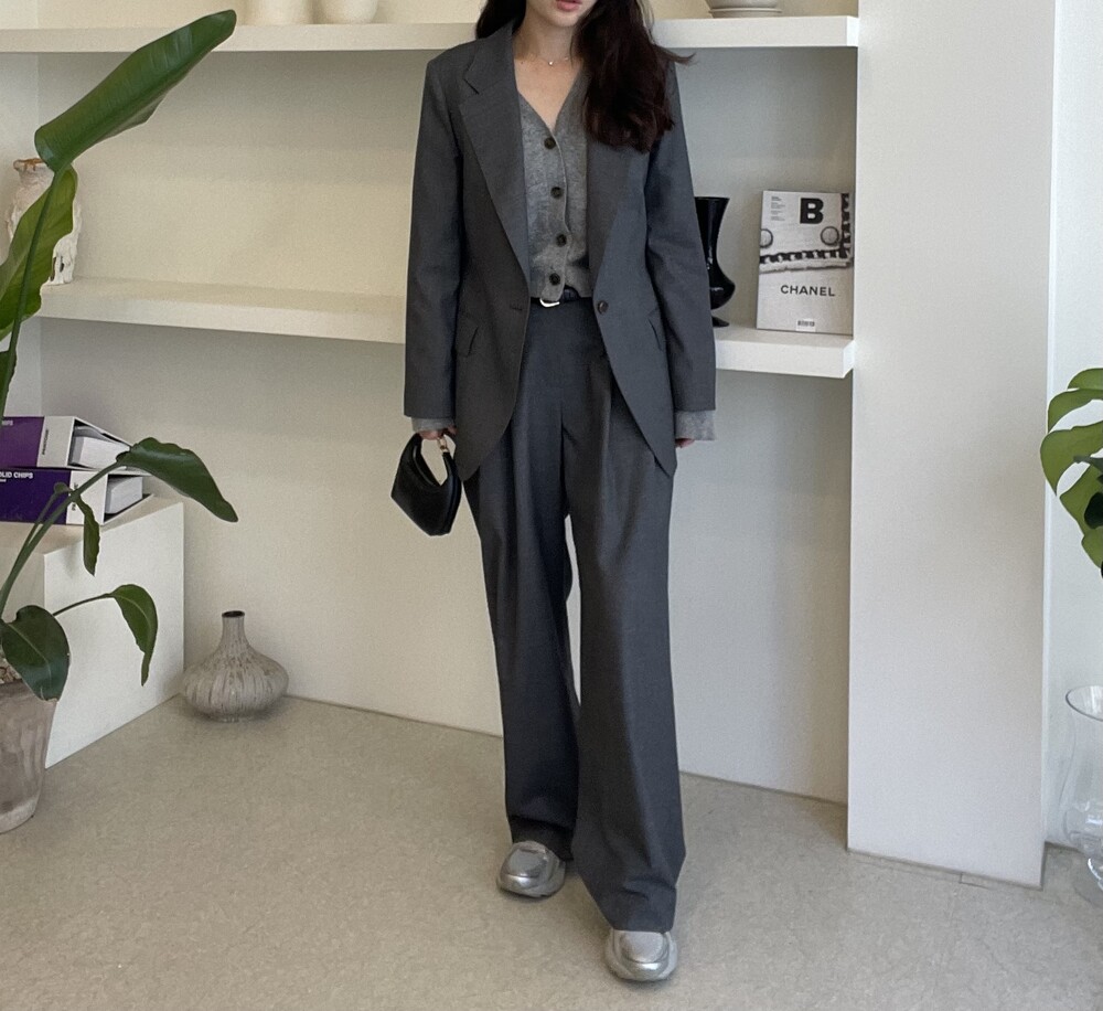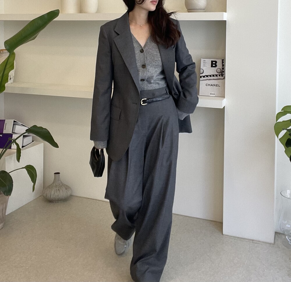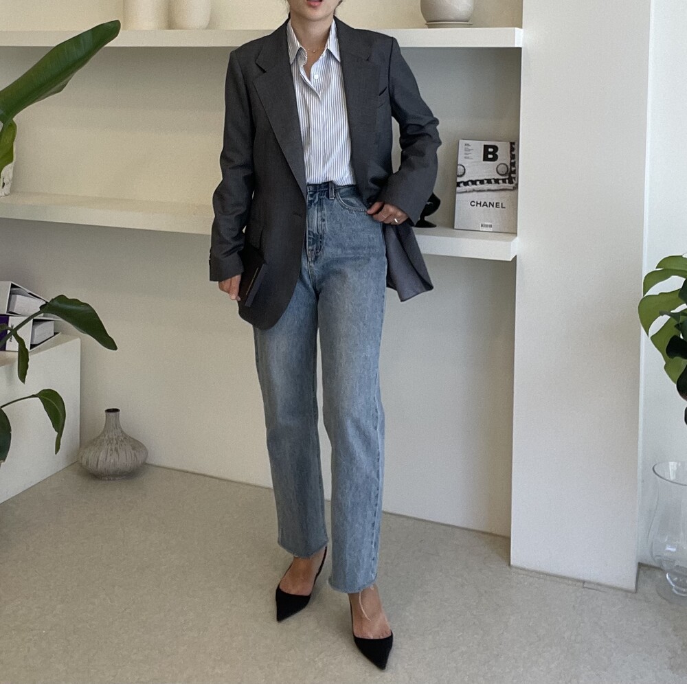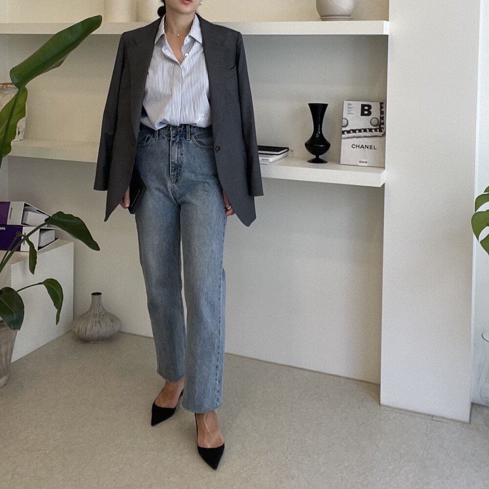 1버튼 클래식 시그니처 자켓이며, 기존에 보여드렸던 총장에서 2cm 정도 짧게 진행되며, 앞단추 / 소매단추 보이는 디자인입니다.