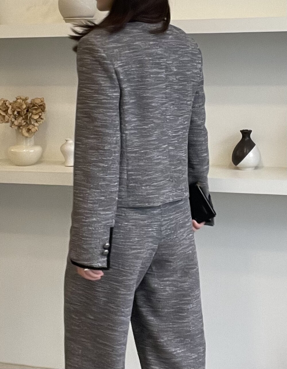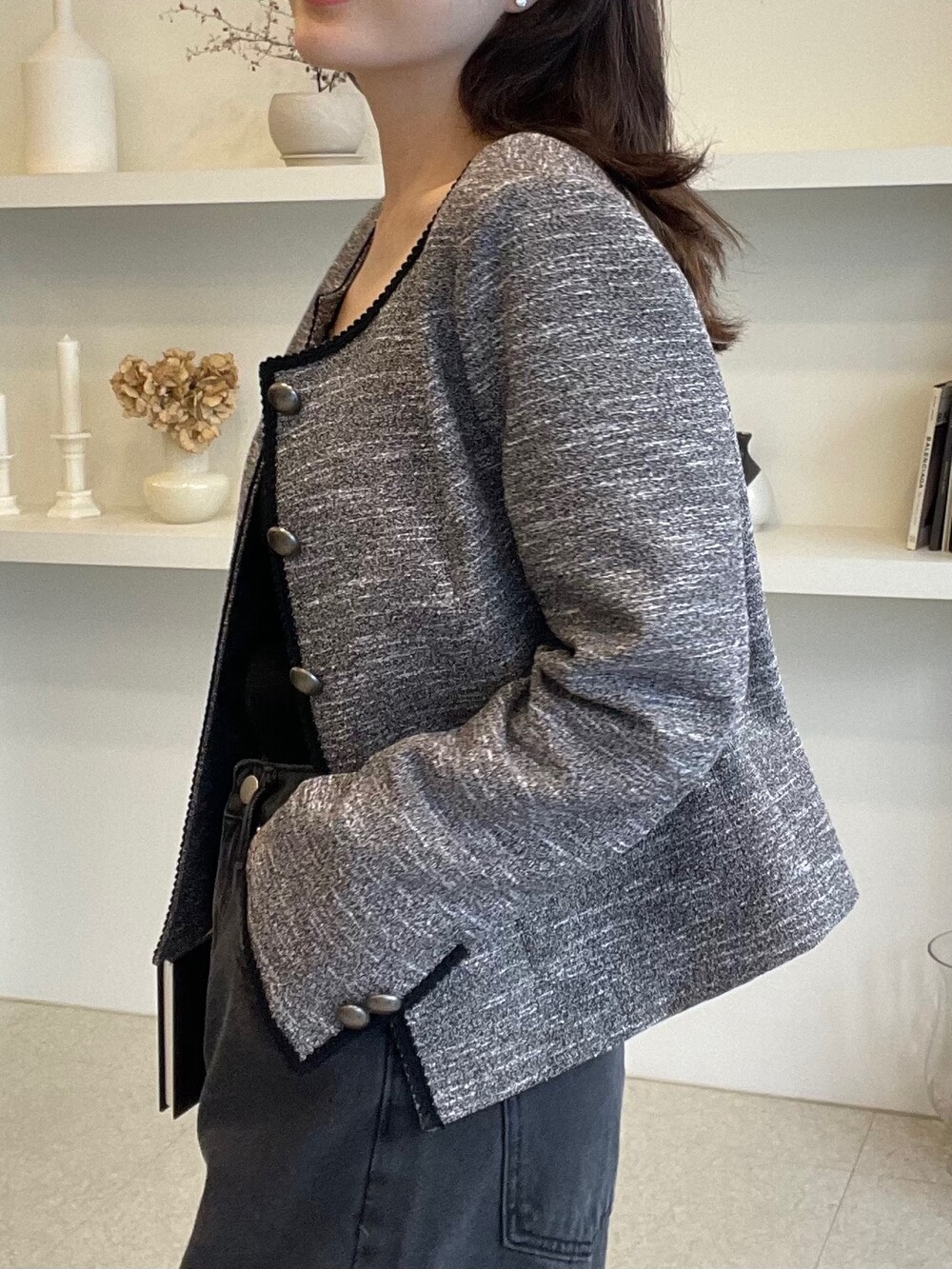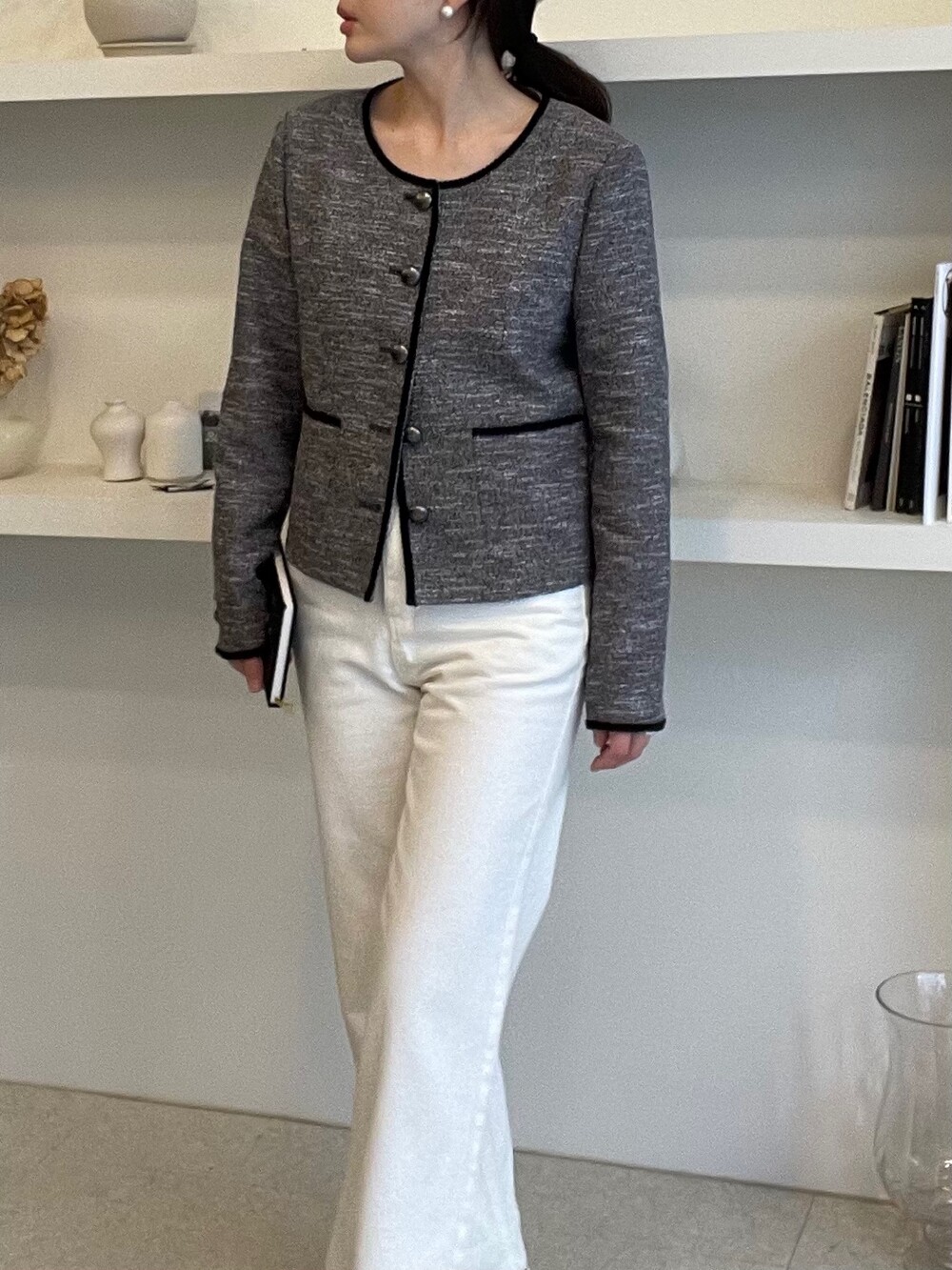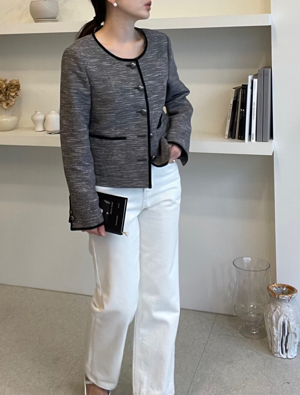 여유있고 경쾌하게 재해석된 그레이스제이만의 NEW 라운드넥 자켓은 다소 깊게 굴려진 라운드넥이 답답하지 않고 목선이 길어보이도록 연출됩니다.
