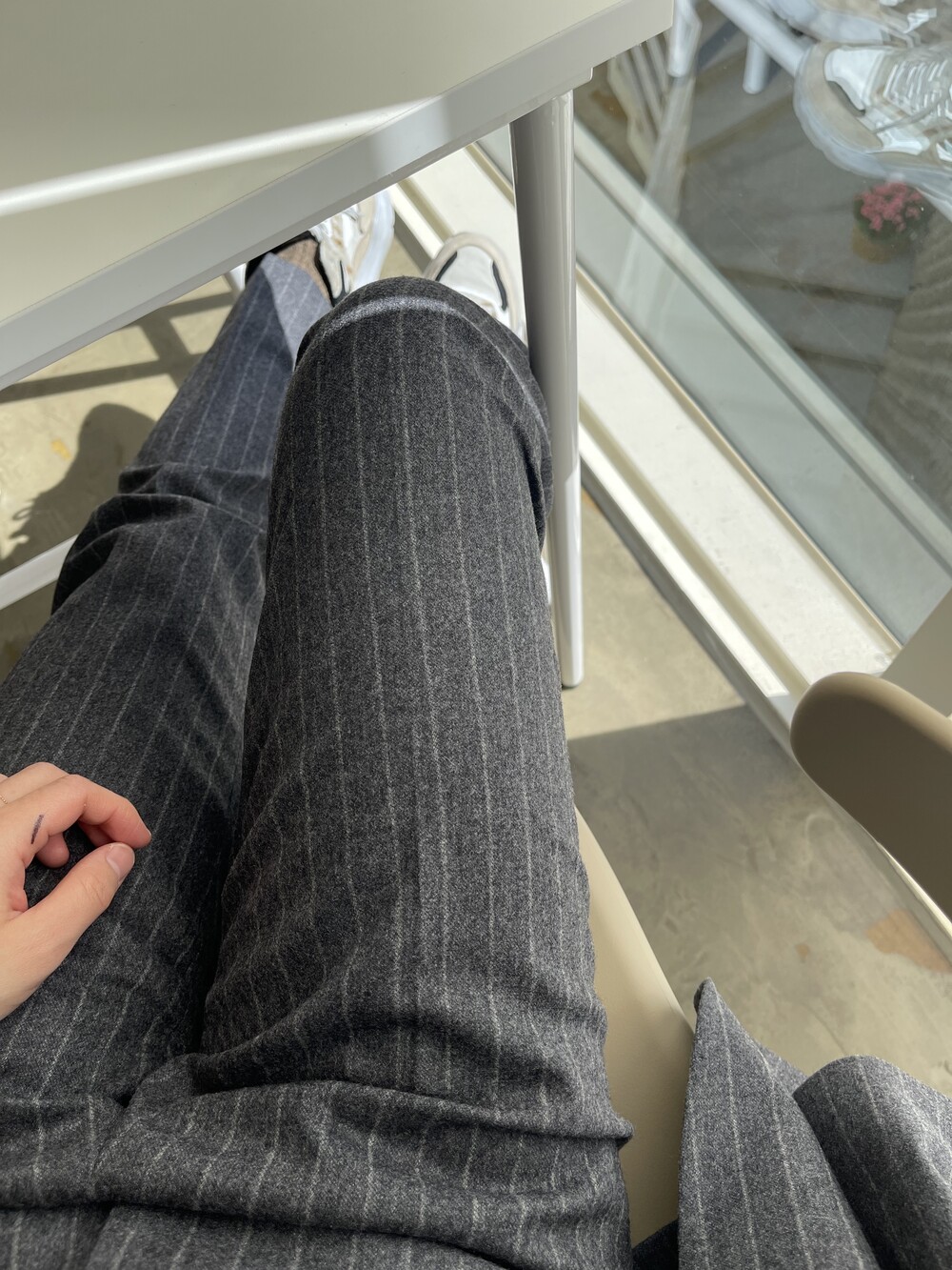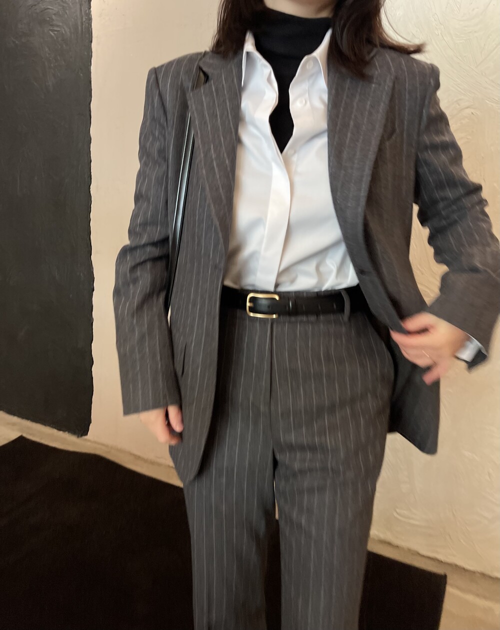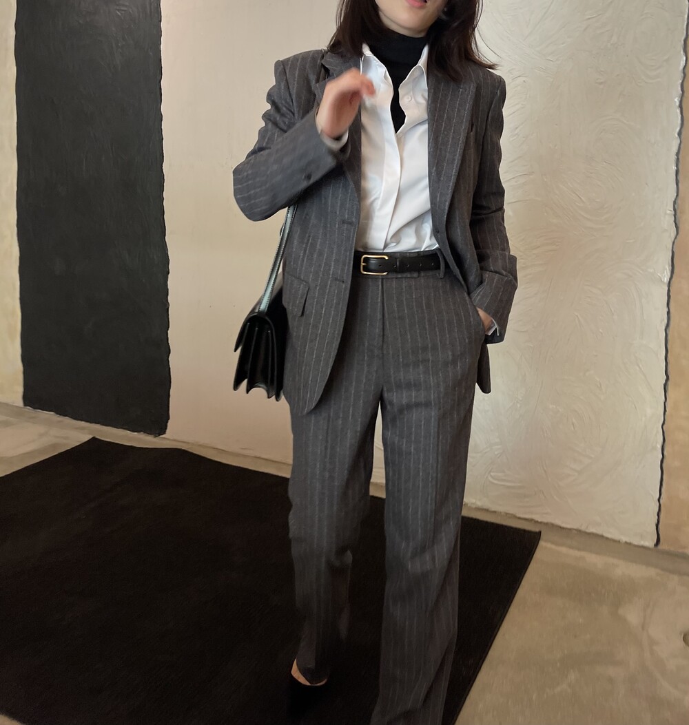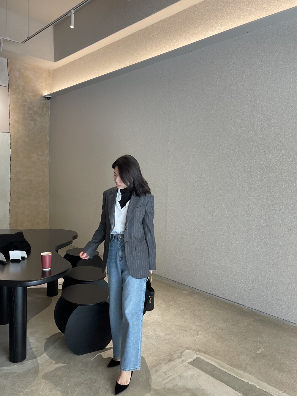실제로는 더 은은한 느낌의 스트라이프라서 자켓은 원피스와도 잘 어우러지고 팬츠는 맨투맨 같은 캐쥬얼한
