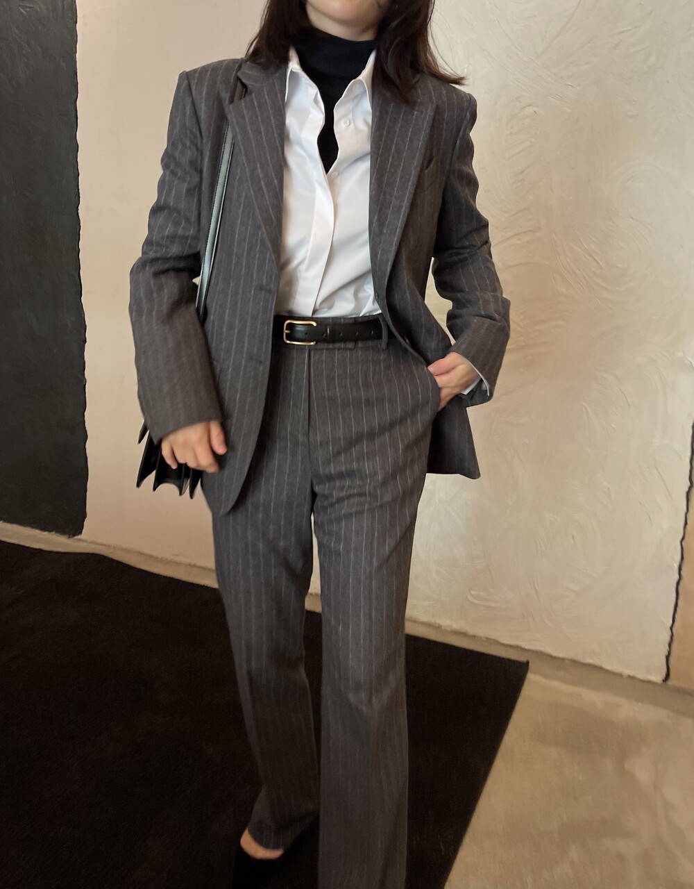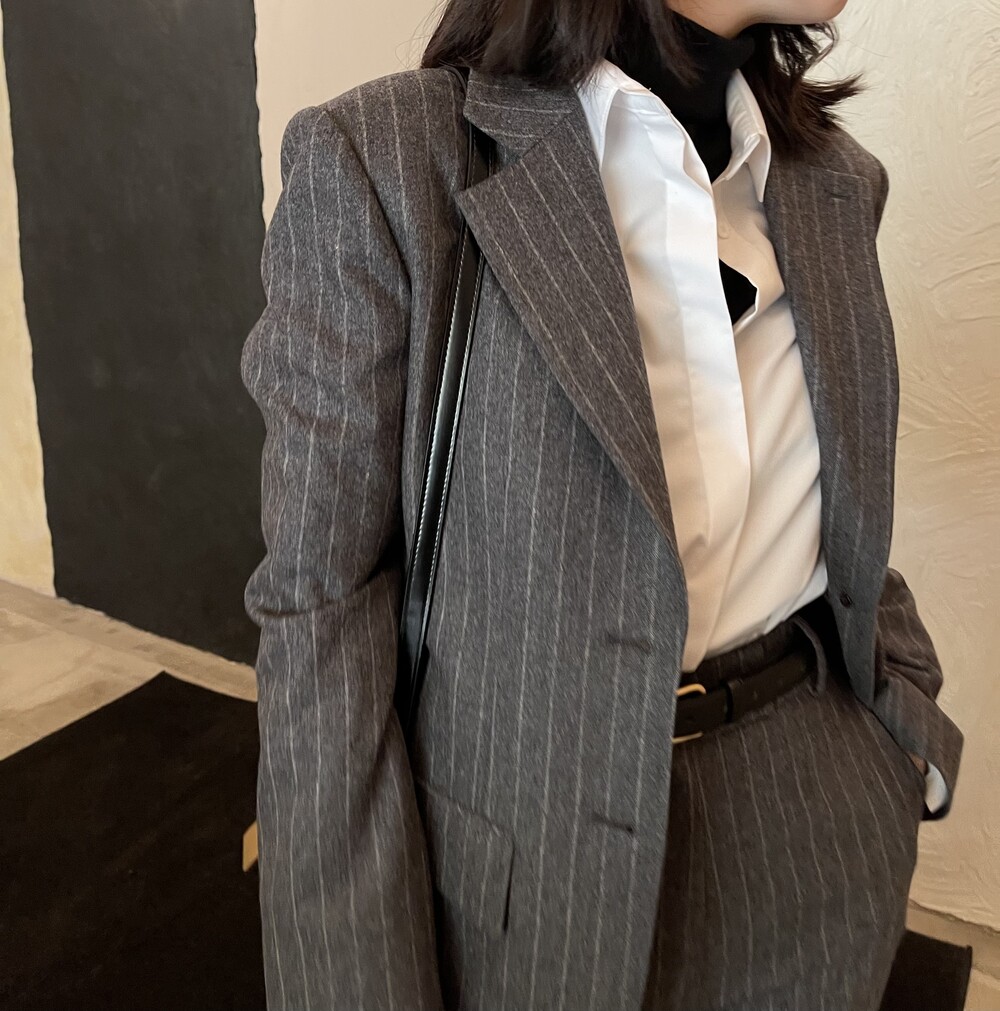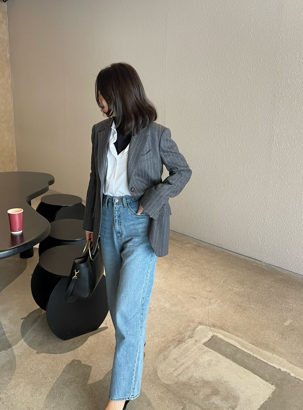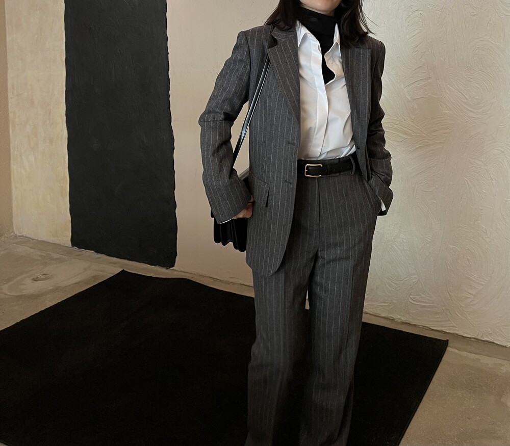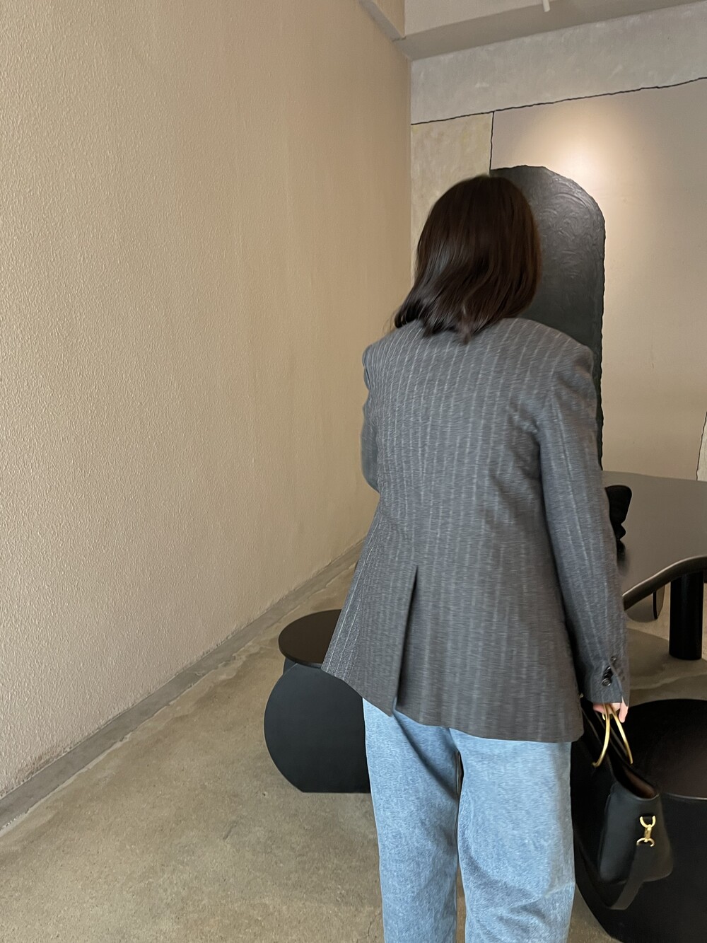 실제로는 더 은은한 느낌의 스트라이프라서 자켓은 원피스와도 잘 어우러지고 팬츠는 맨투맨 같은 캐쥬얼한