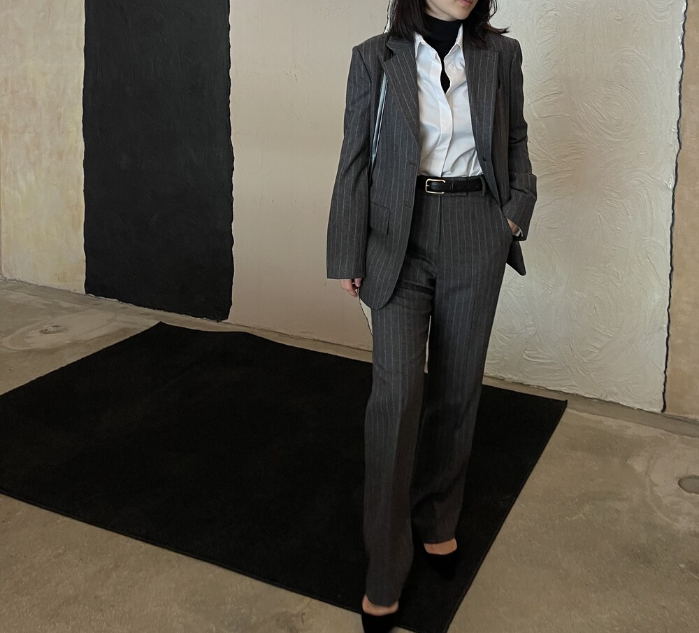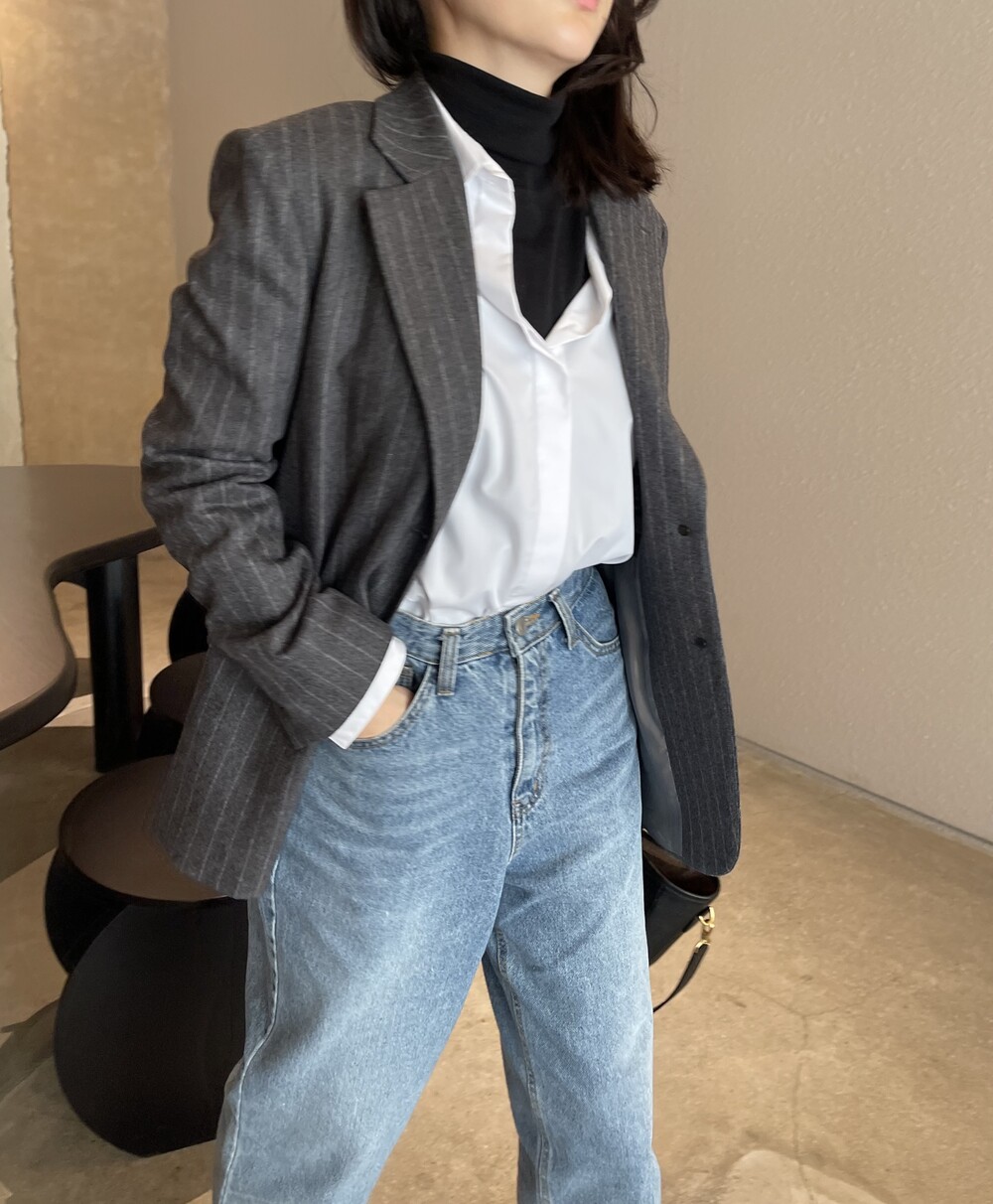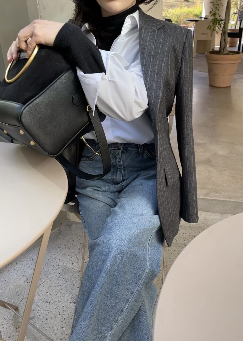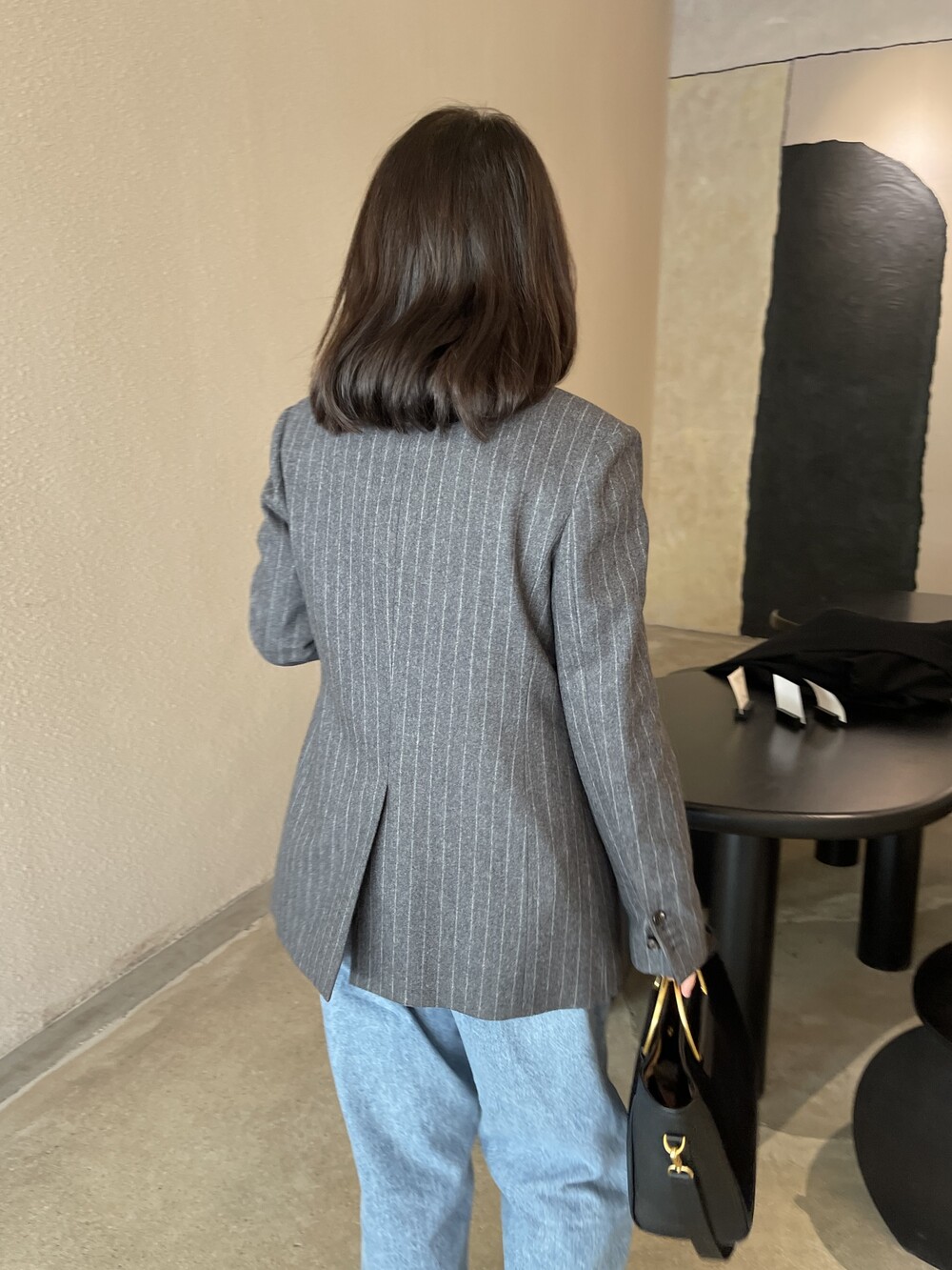 실제로는 더 은은한 느낌의 스트라이프라서 자켓은 원피스와도 잘 어우러지고 팬츠는 맨투맨 같은 캐쥬얼한