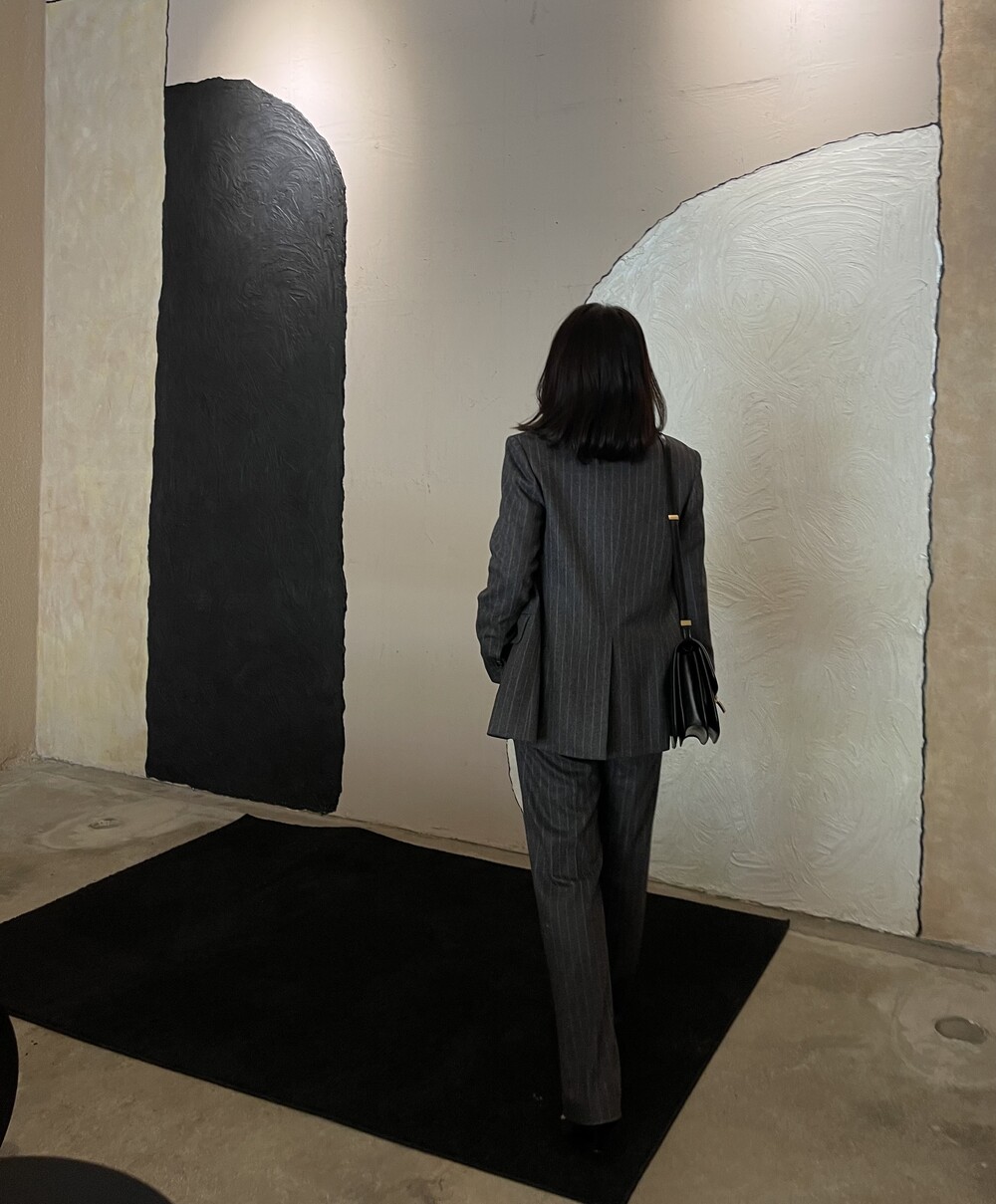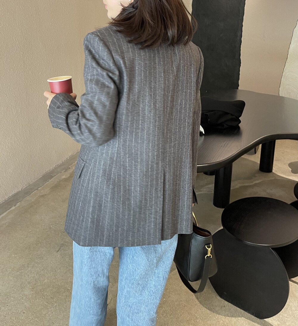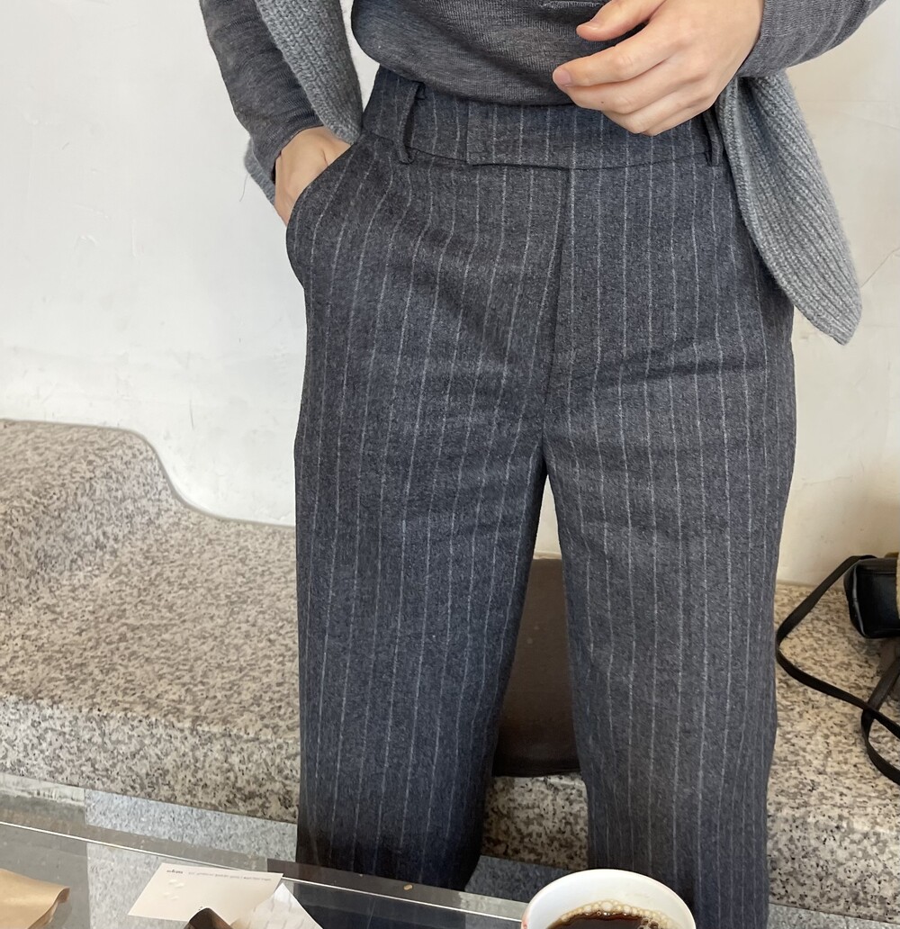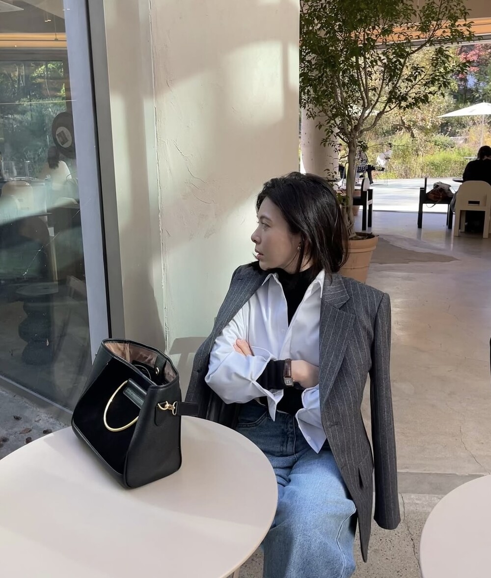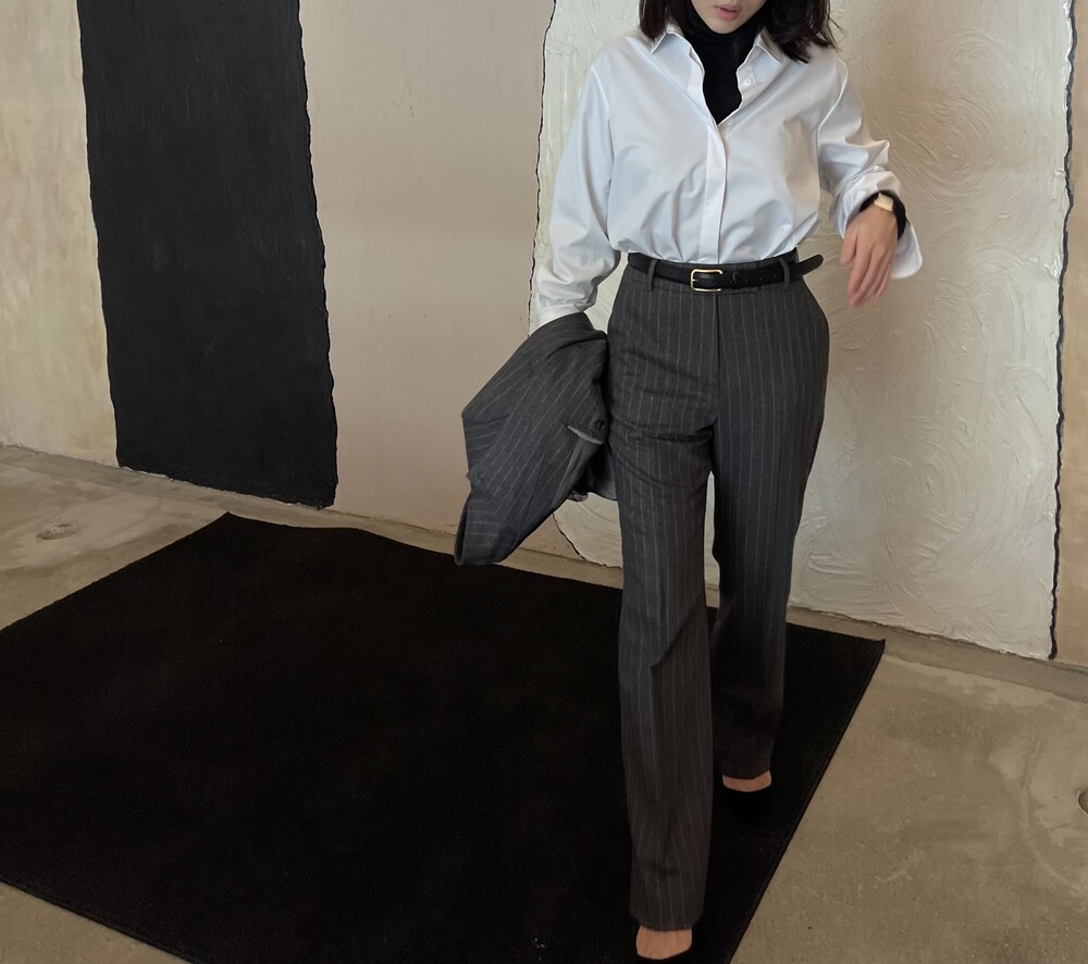 실제로는 더 은은한 느낌의 스트라이프라서 자켓은 원피스와도 잘 어우러지고 팬츠는 맨투맨 같은 캐쥬얼한