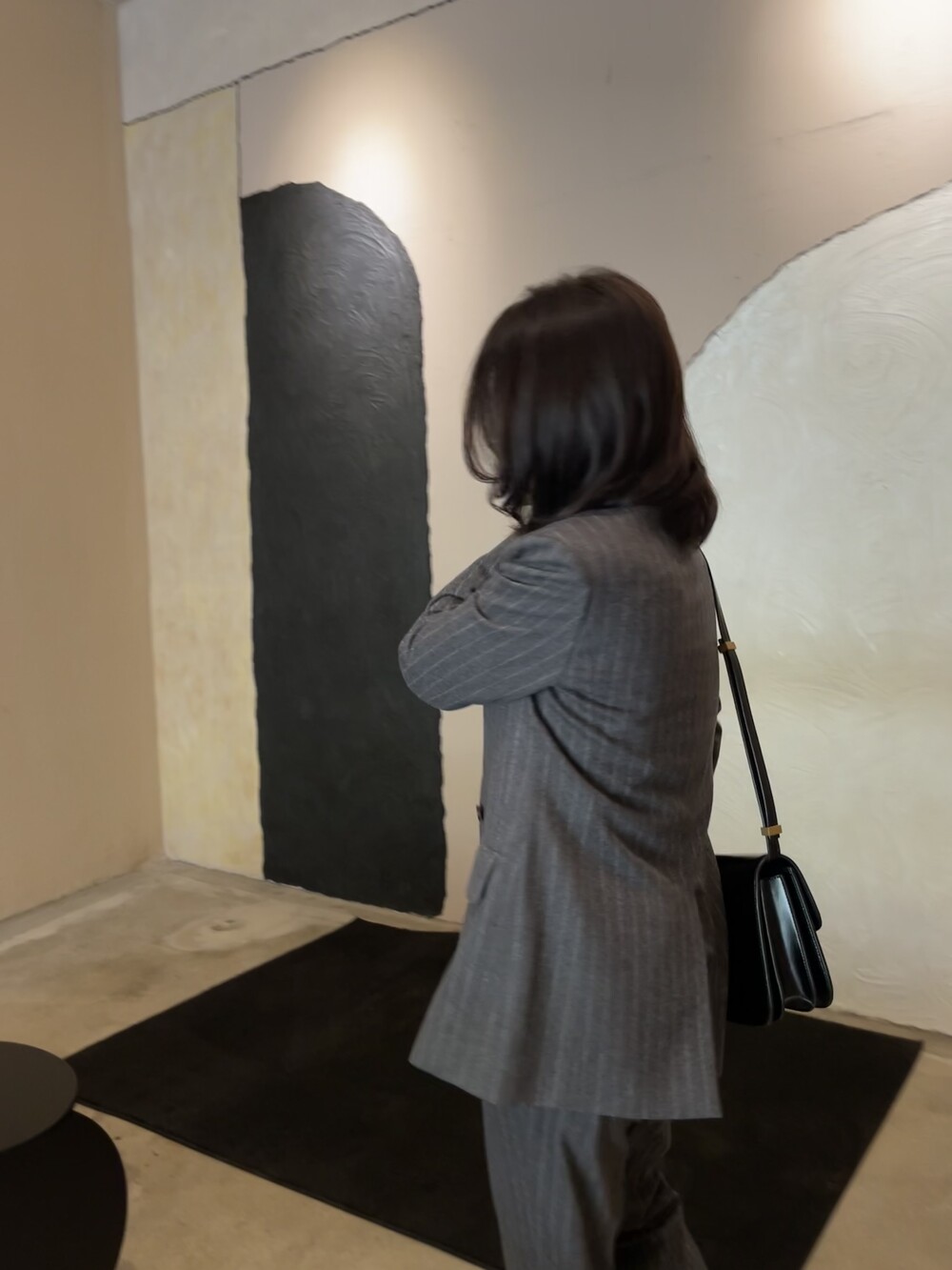 어깨선은 오버핏 느낌까지는 아니지만 살짝 드롭되어 그레이스제이만의 리치하고 여유있는 세련미를 주고,