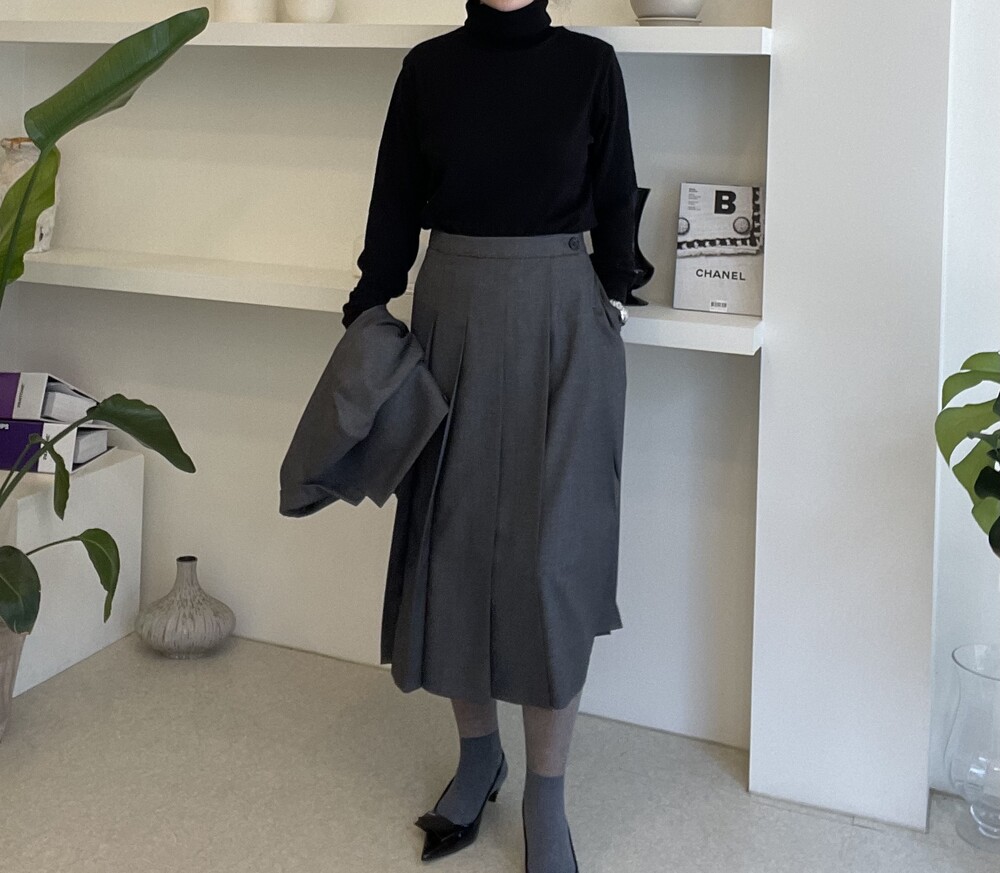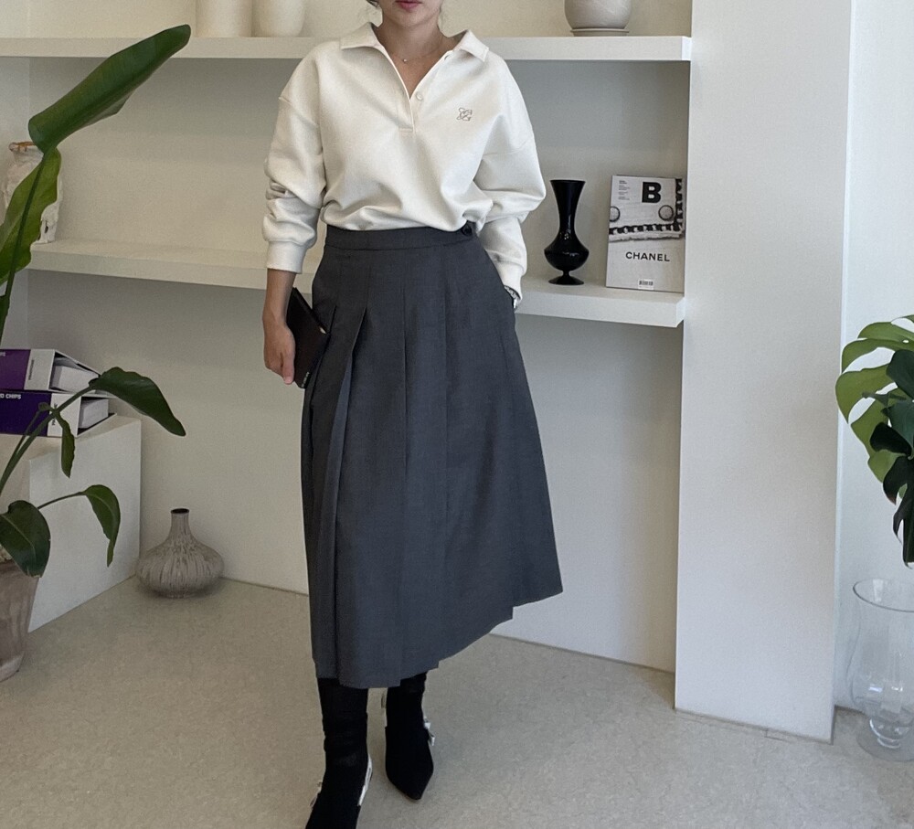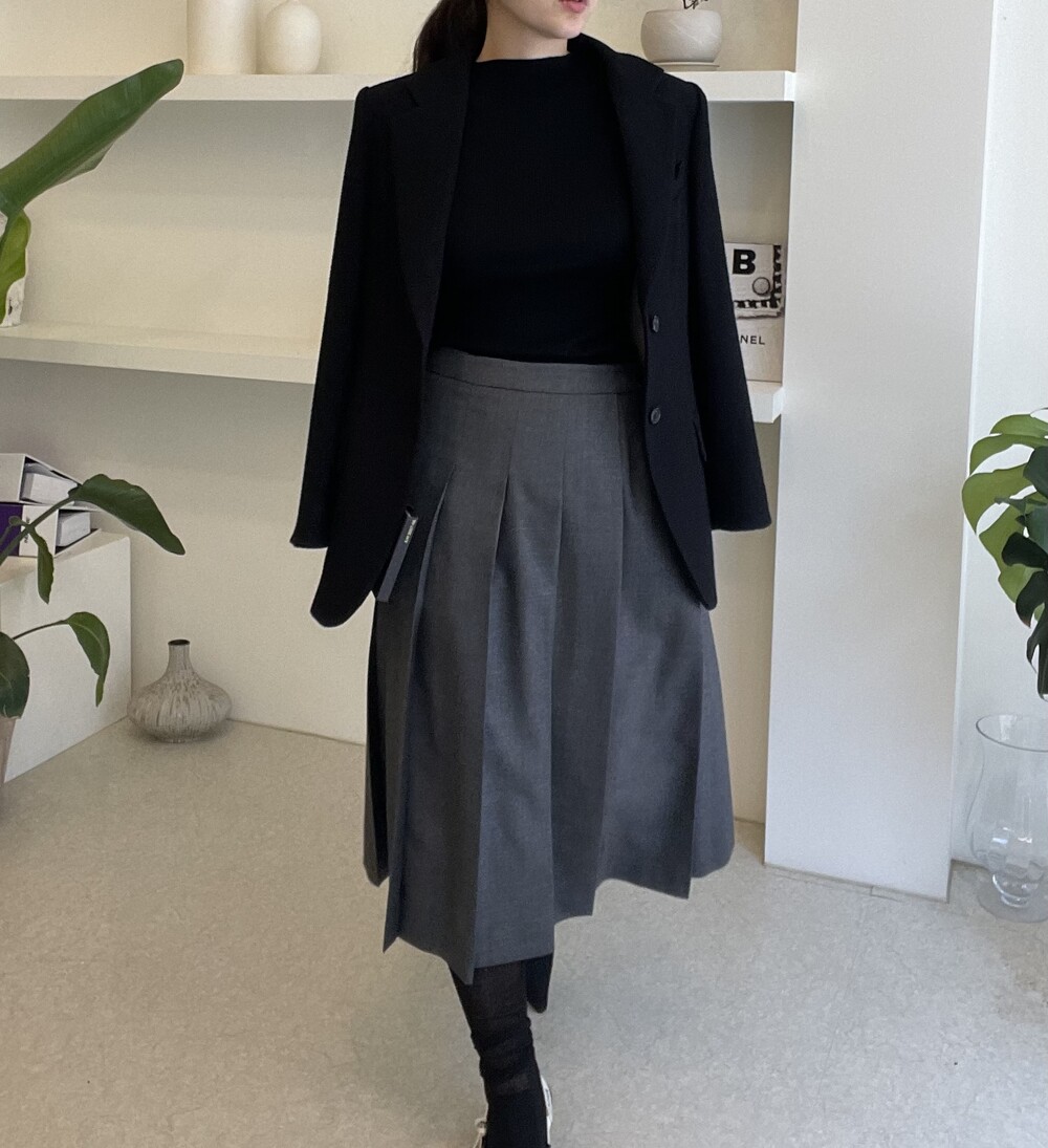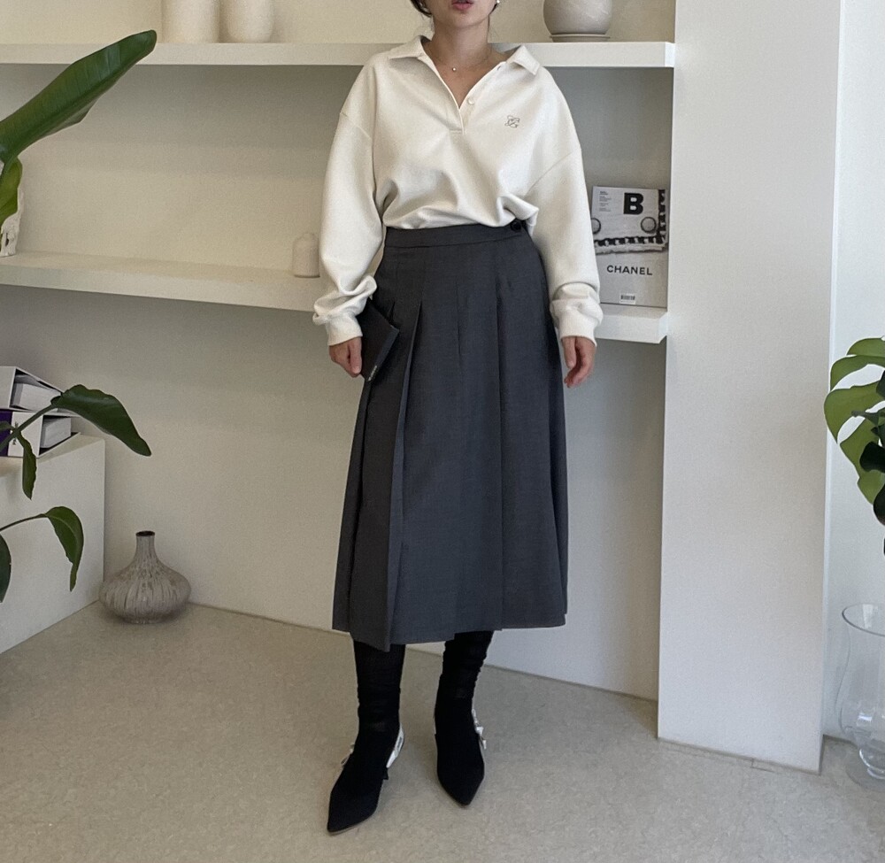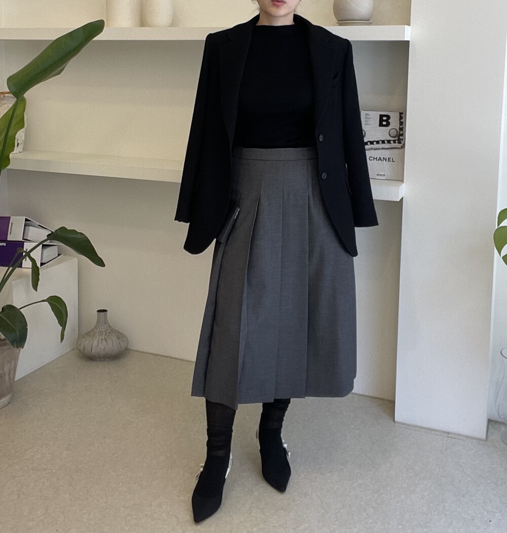 미디움 길이의 wrap 주름 스커트로 자켓과 함께 하는 스타일링 외에도 캐쥬얼하게 즐겨보세요.