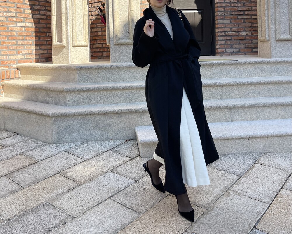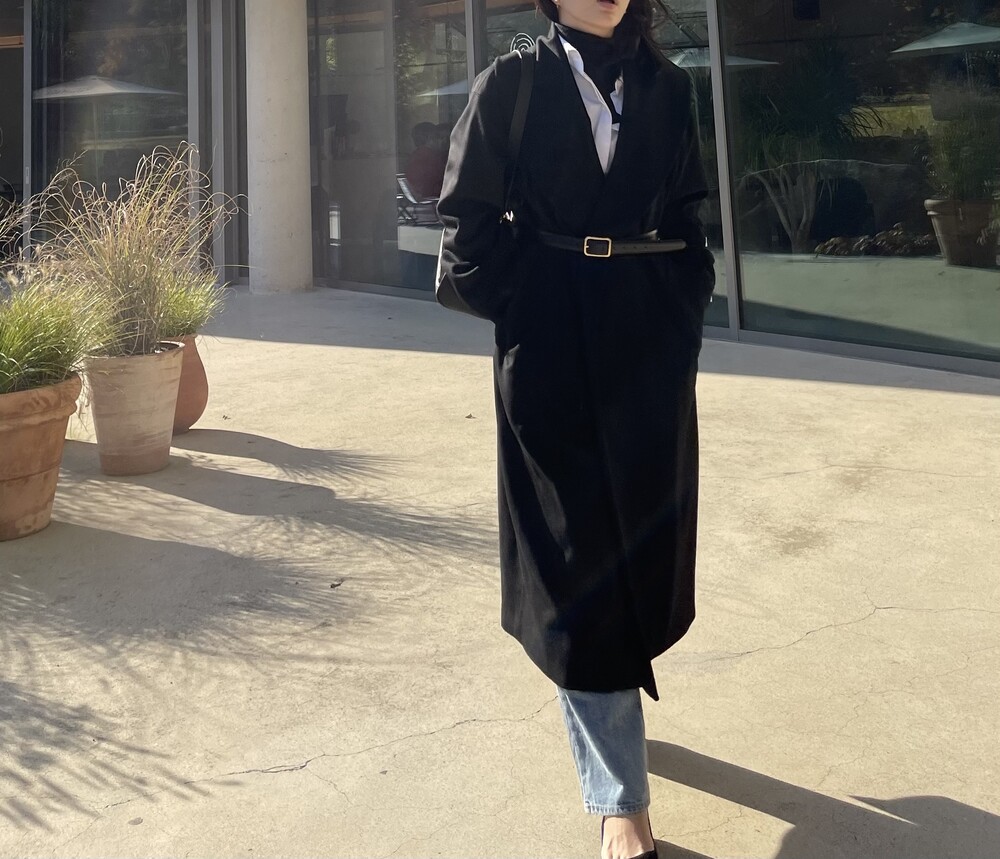 벨트를 이용하여 테일러드 카라를 좀 더 넓게 좁게 연출이 가능하며, 전체 오픈 해도 라인이 단정하게 떨어집니다.