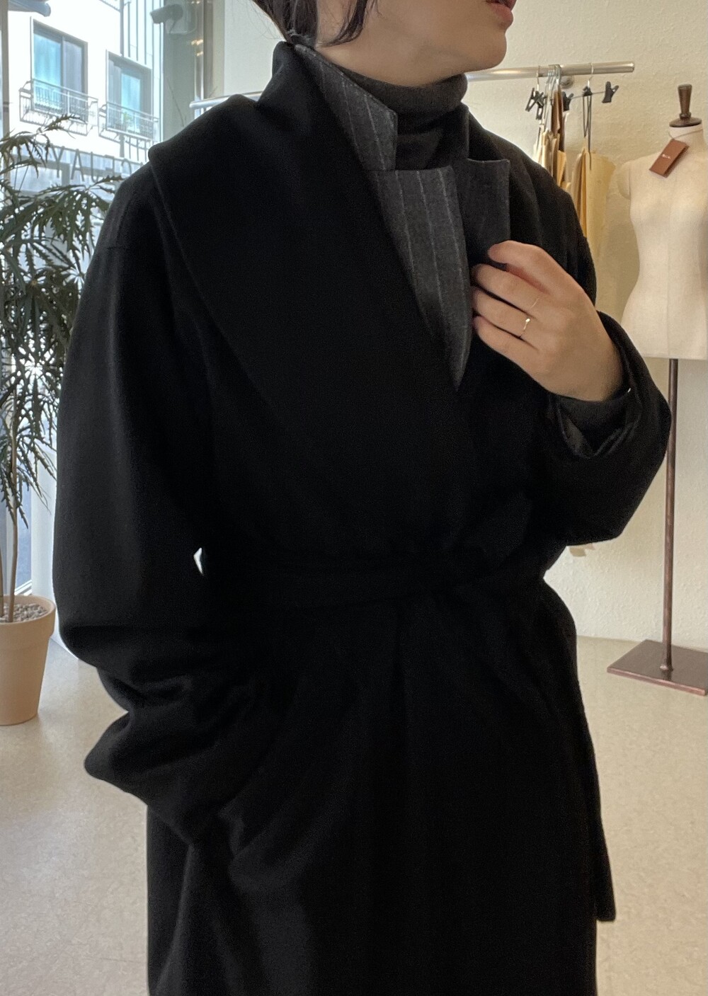 넓고 깊은 숄카라는 어떻게 매무새를 잡아주냐에 따라 다양한 외관으로 연출 됩니다.