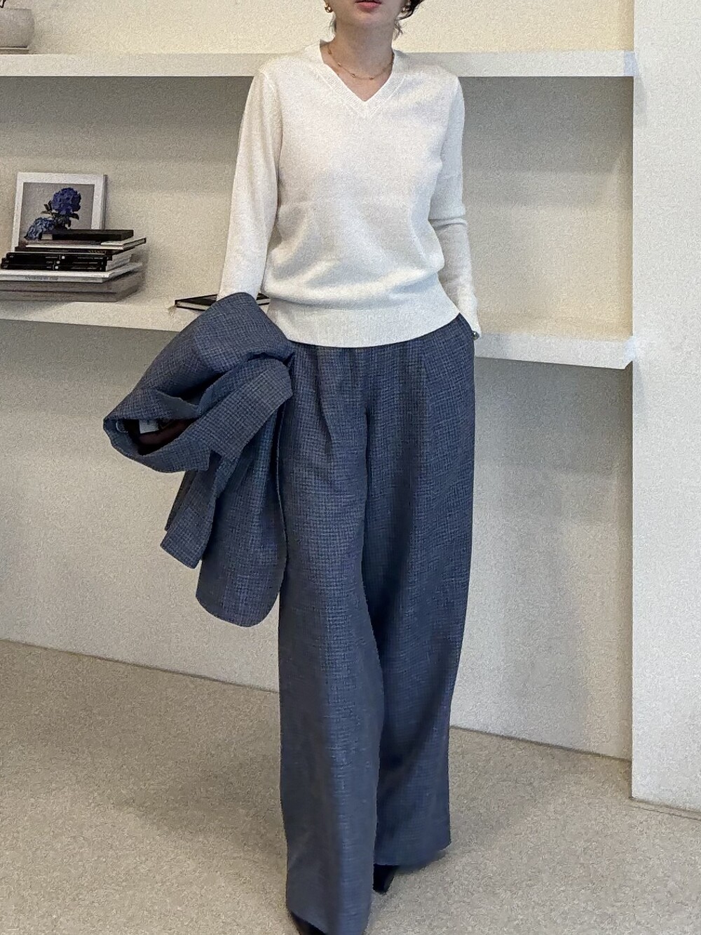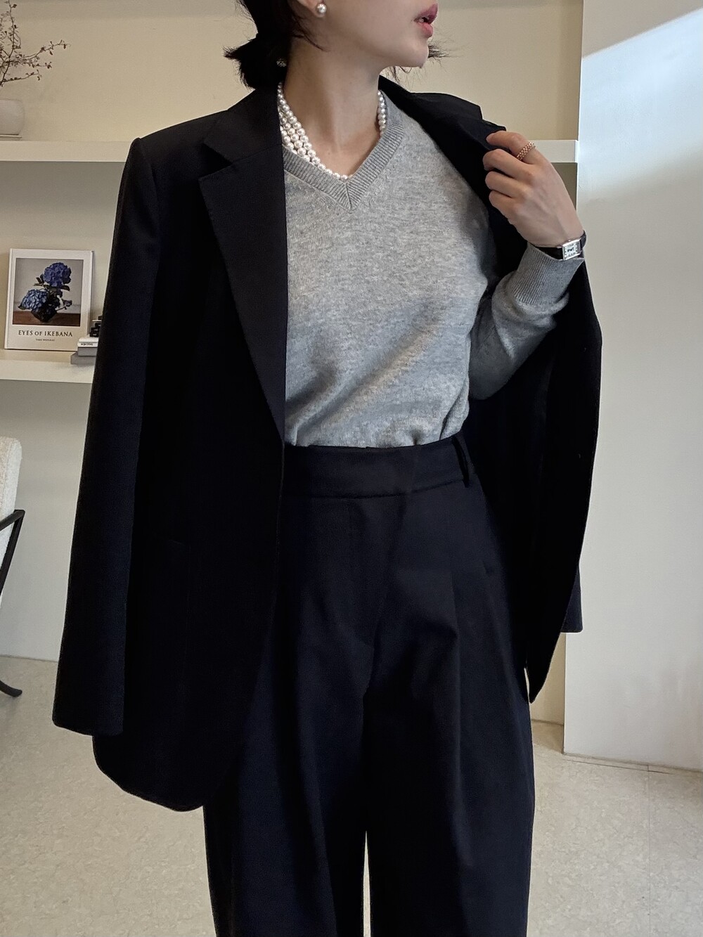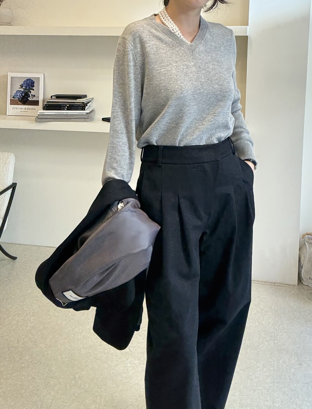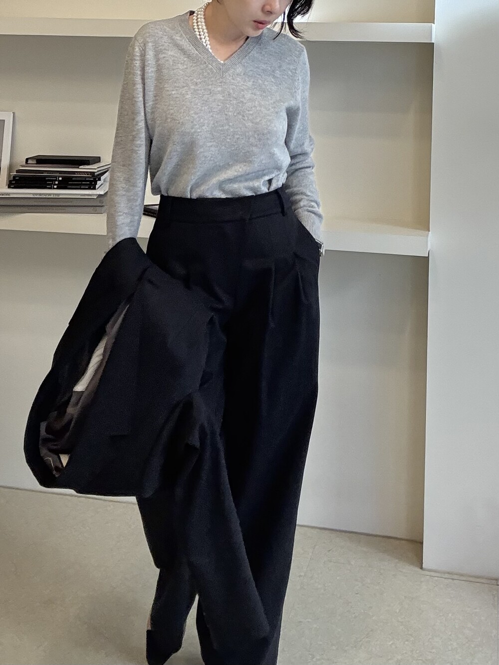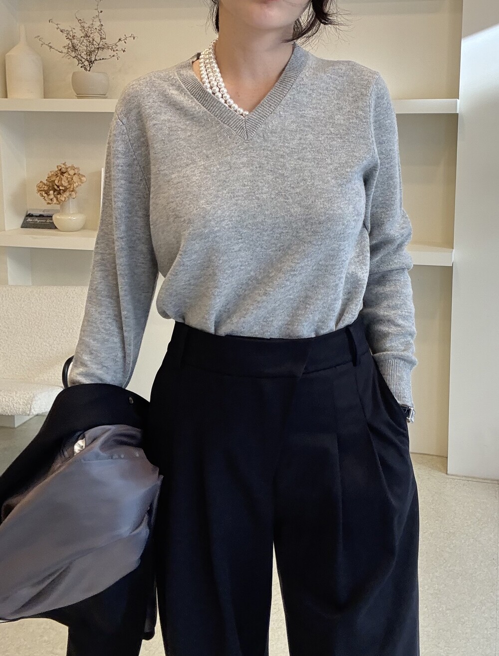 V넥 선이 깊지 않으며, 자켓 속에 코디해서 입기 좋으며, 총 3가지의 사이즈로 스탠다드하게 입는 핏을 추천드립니다.
