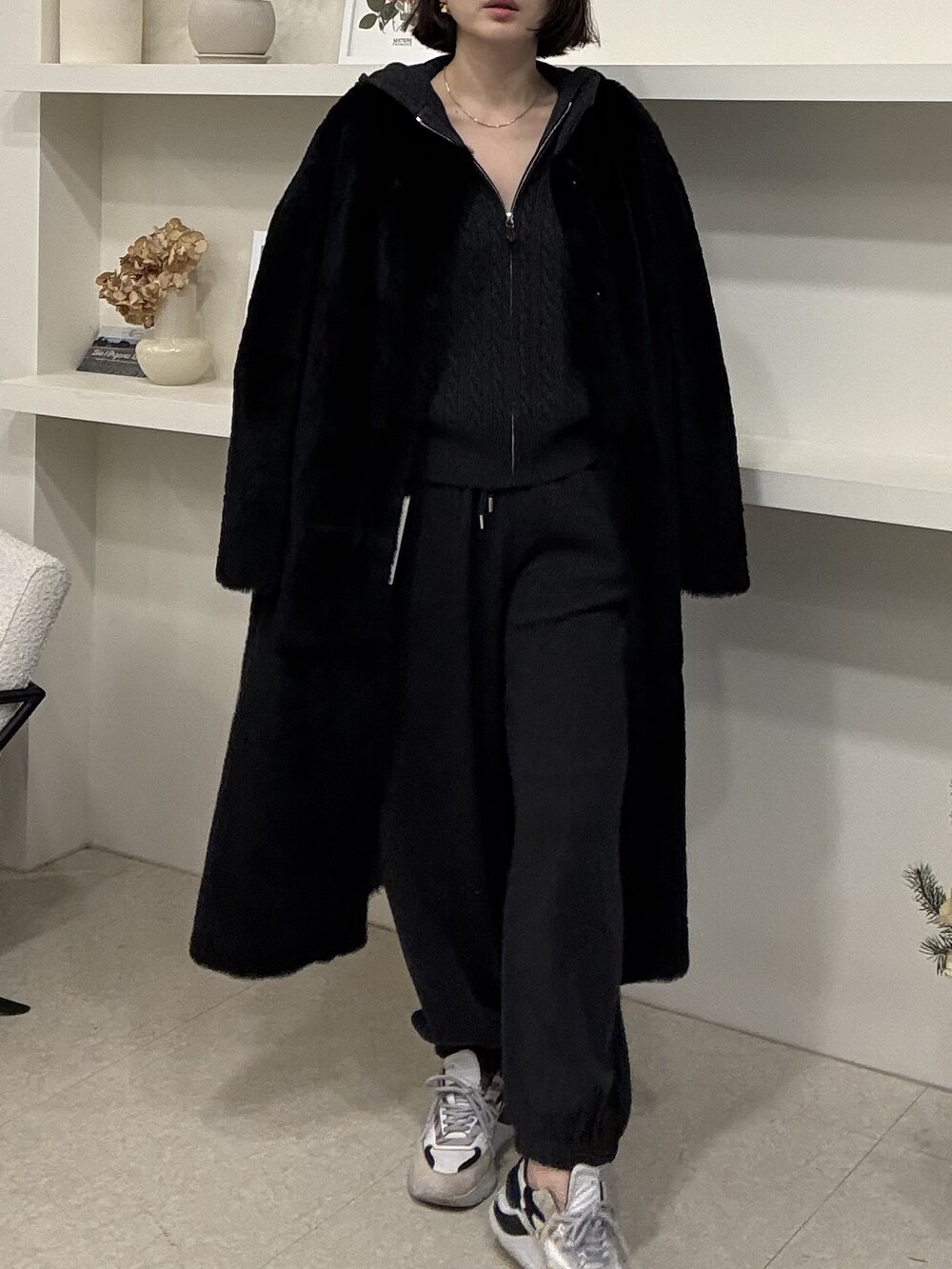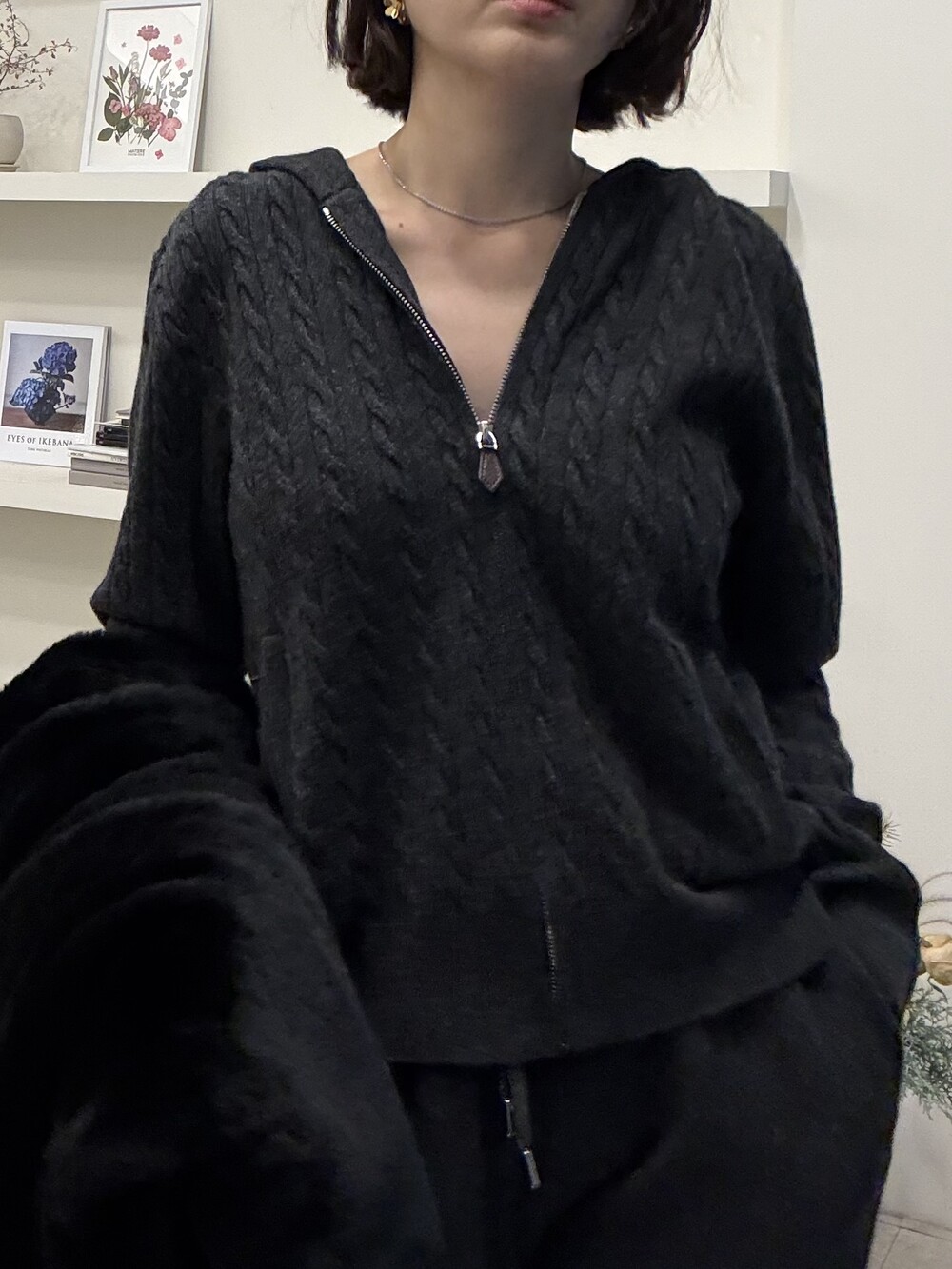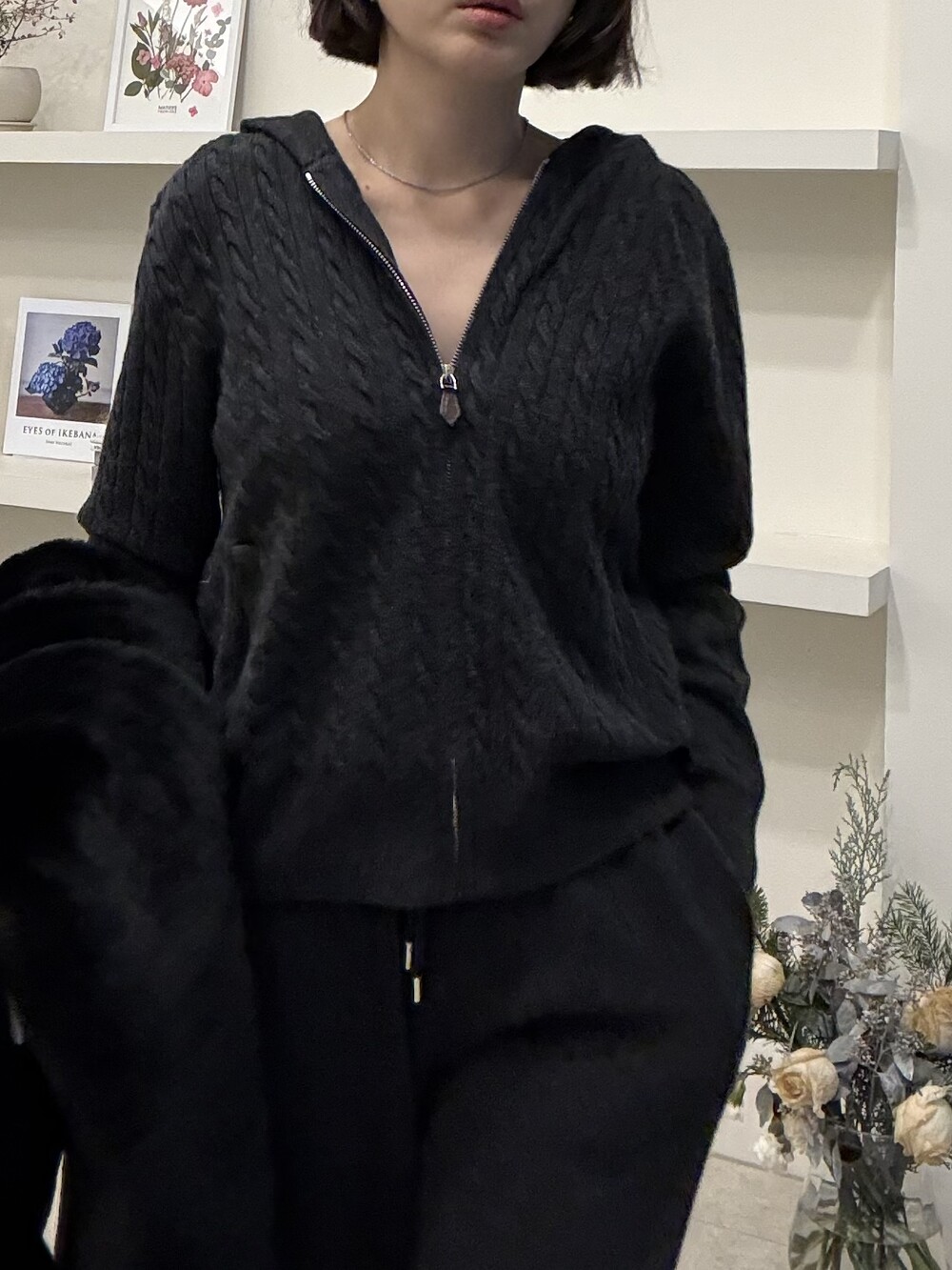 후드형태의 캐쥬얼한 아웃라인을 담고 있지만 우아하고 기품있는 포멀룩으로 연출하기 좋도록 만들어진 니트입니다.