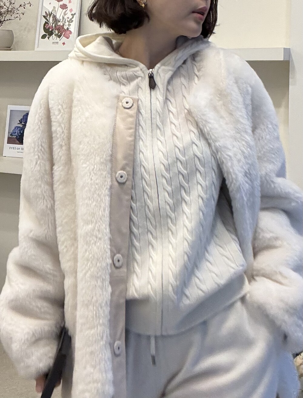맨살에 닿는 느낌이 매우 부드러운 캐시미어 100% 원료로 짜여진 후드집업 형태의 블루종니트 입니다.