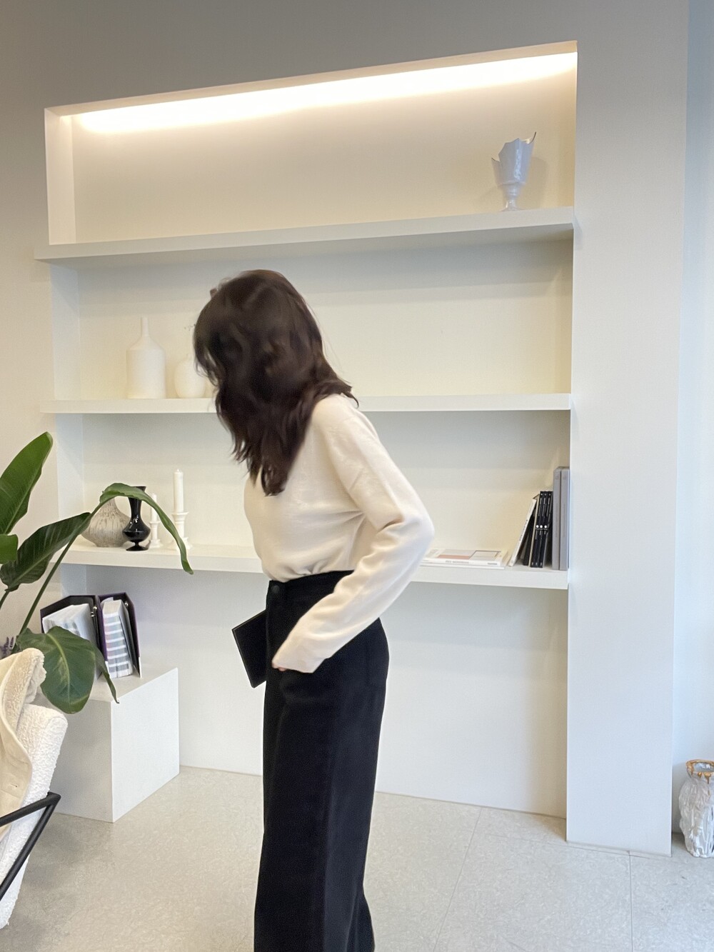 특히 보트넥과 라운드넥 중간의 경계 모양의 라운드 넥이 특징적이며, 홀가먼트 봉제 방식으로 작업 되어 봉제선이 없으며 어깨와 암홀라인에는 고급 헤라시 조직 포인트가 있습니다.
