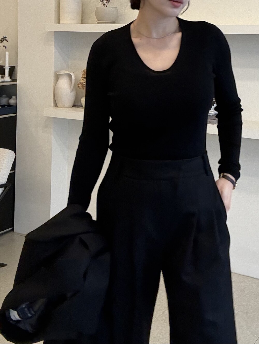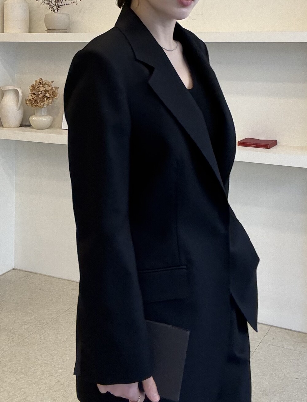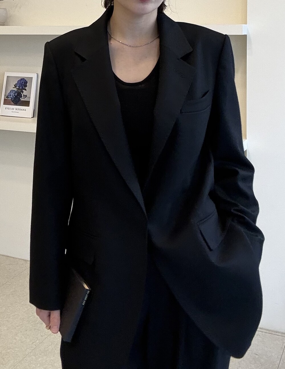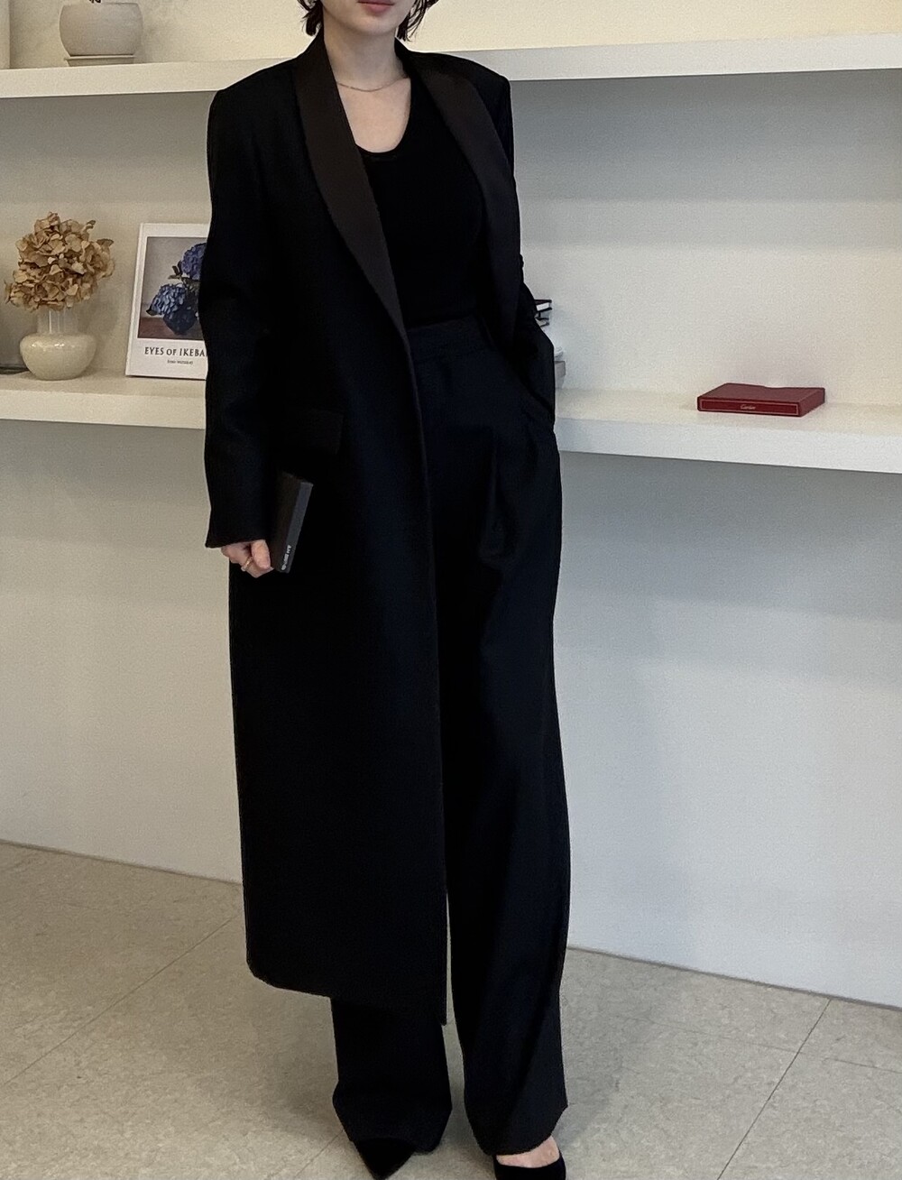 부드럽고 포근한 외관을 자랑하는 세련된 블랙으로 , 울90% 캐시미어10% 혼용으로 2합 80수의 소모 소재로 제안됩니다. 두껍지 않고 그리고 얇지도 않은 질감이 가장 특징적이며, 때문에 시즌을 길게 확보해서 연출하실 수 있도록 준비했습니다.