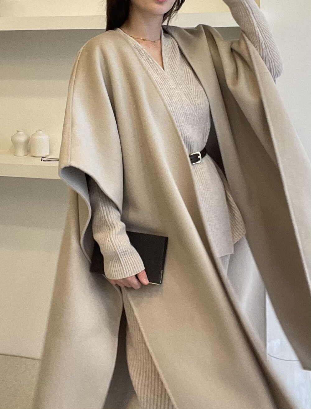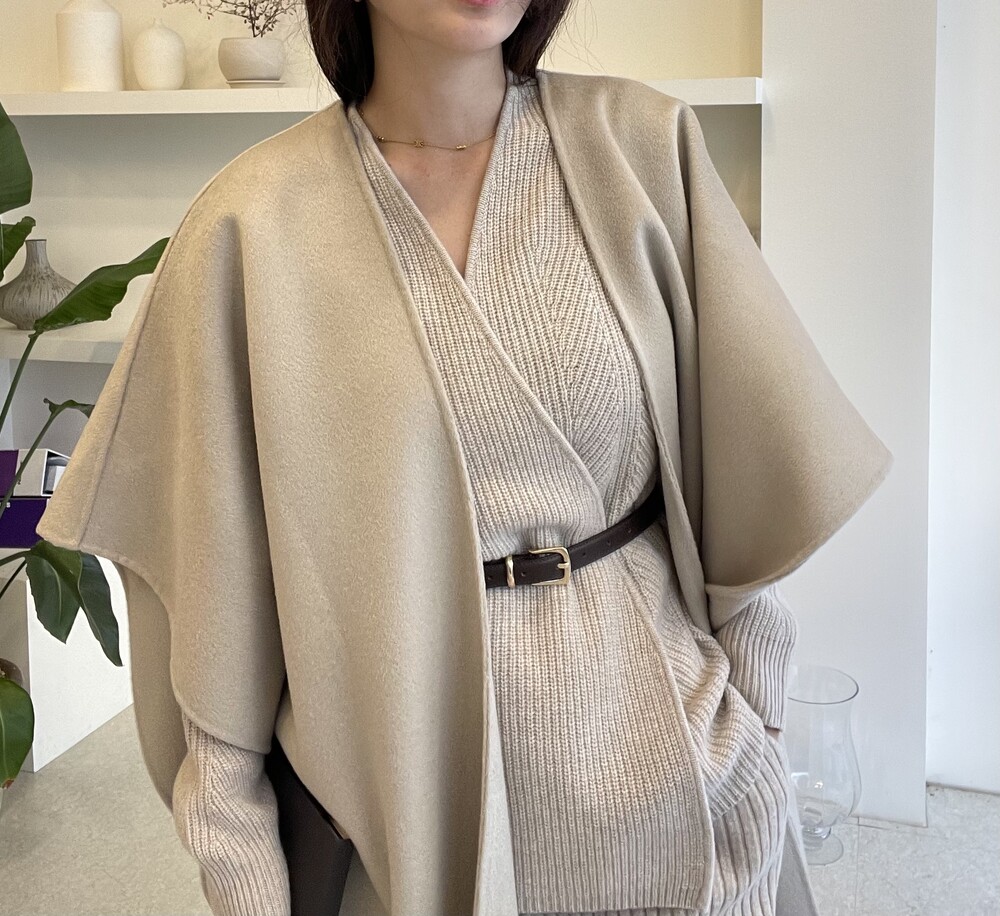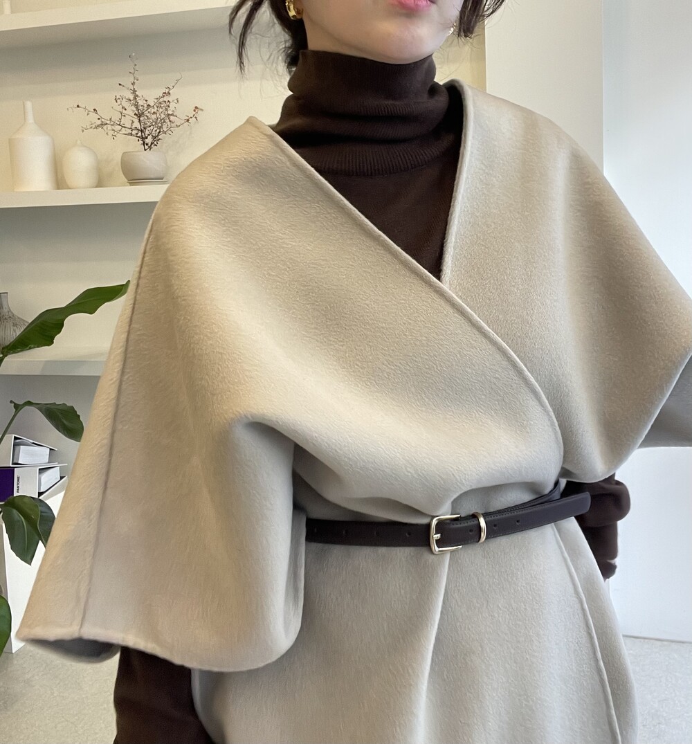 소프트하고 부드러운 텍스처가 돋보이는 메리노울 90% 캐시미어 10% 혼방의 케이프 코트입니다.