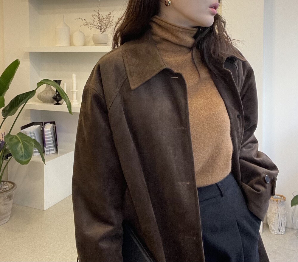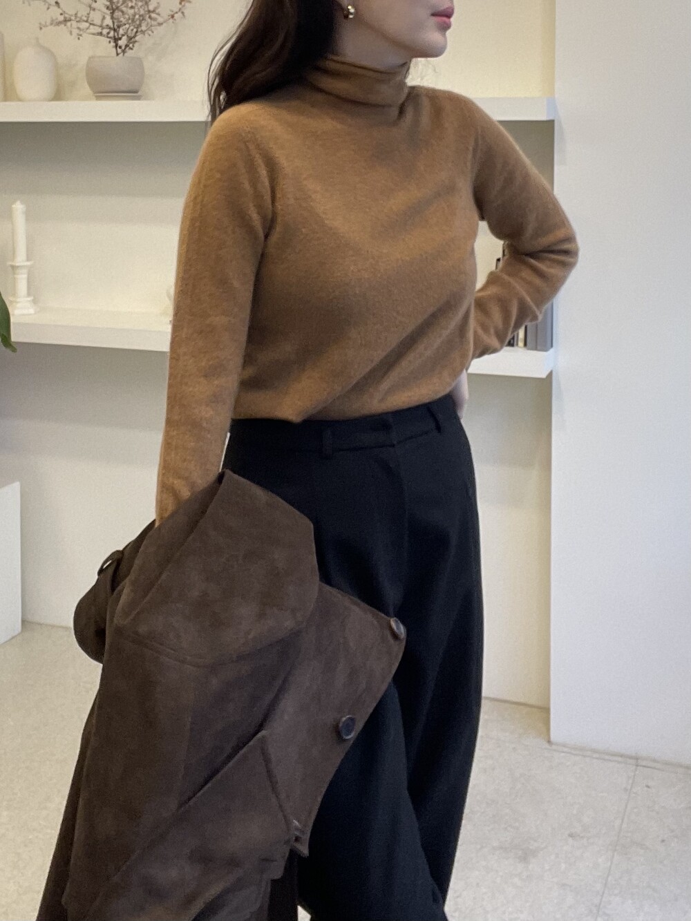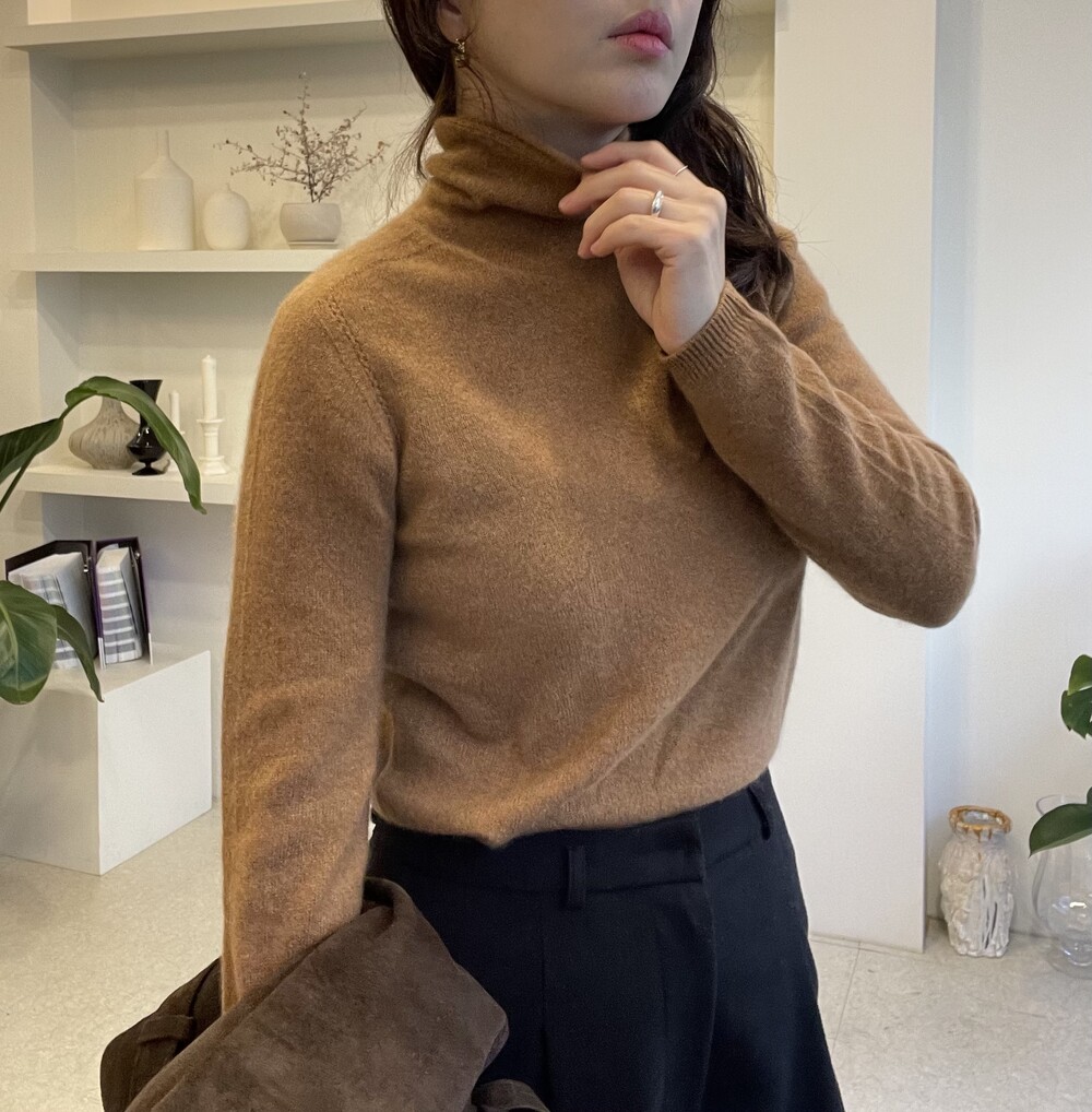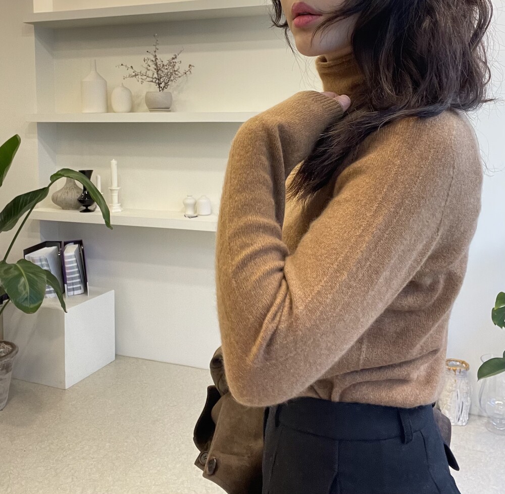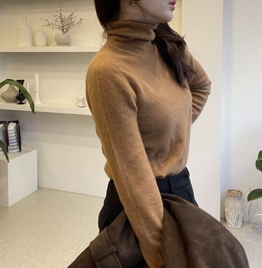 자연스럽게 모양이 잡히고 흘러내리는 루즈함으로 목선이 슬림해 보이는 효과를 주는 터틀넥이라서 더욱 특별합니다. 홀가먼트 봉제 방식으로 작업 되어 봉제선이 없으며 목과 허리단에는 세번수 조직감으로 포인트가 있습니다.