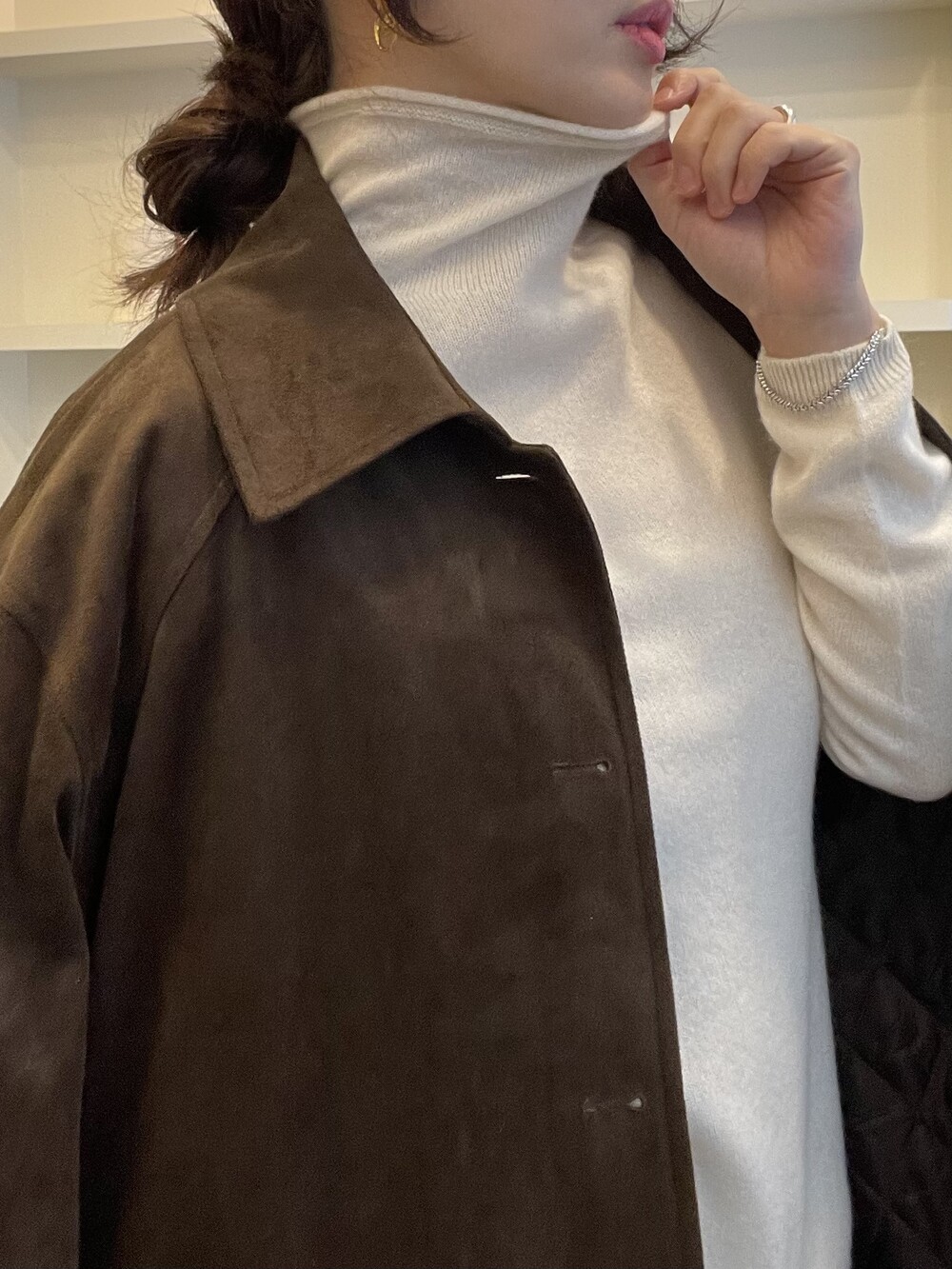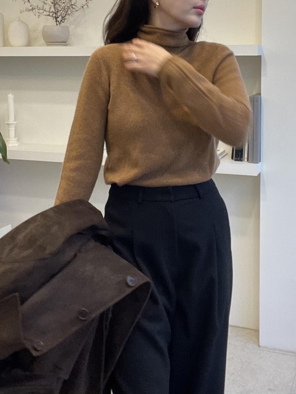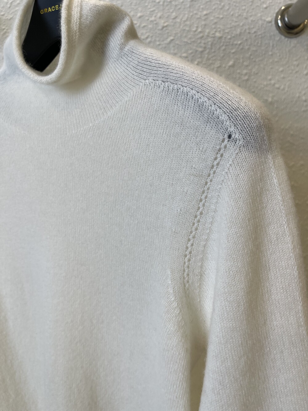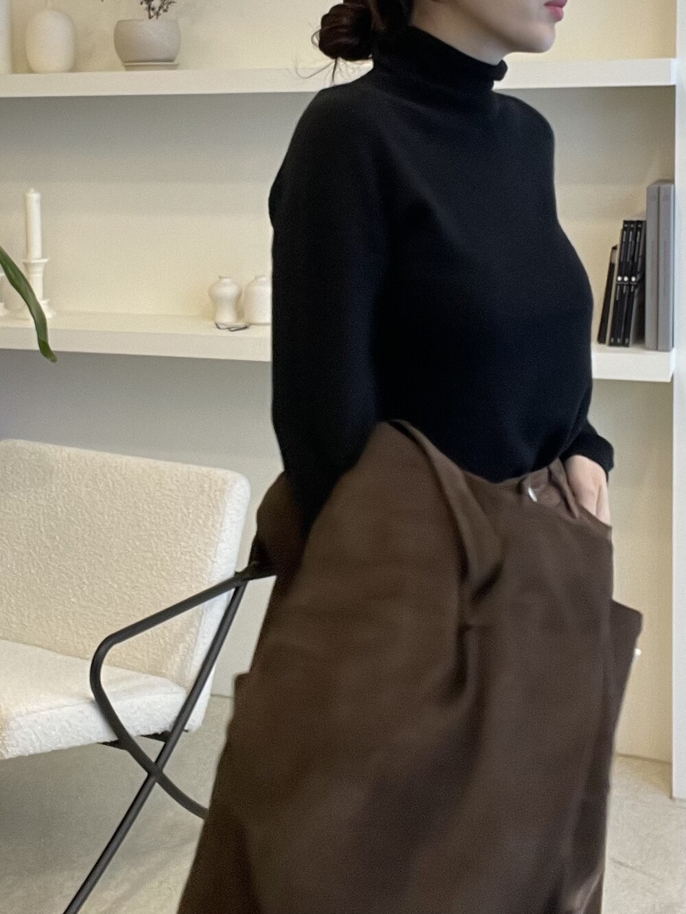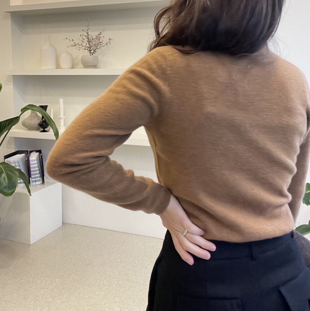 자연스럽게 모양이 잡히고 흘러내리는 루즈함으로 목선이 슬림해 보이는 효과를 주는 터틀넥이라서 더욱 특별합니다. 홀가먼트 봉제 방식으로 작업 되어 봉제선이 없으며 목과 허리단에는 세번수 조직감으로 포인트가 있습니다.