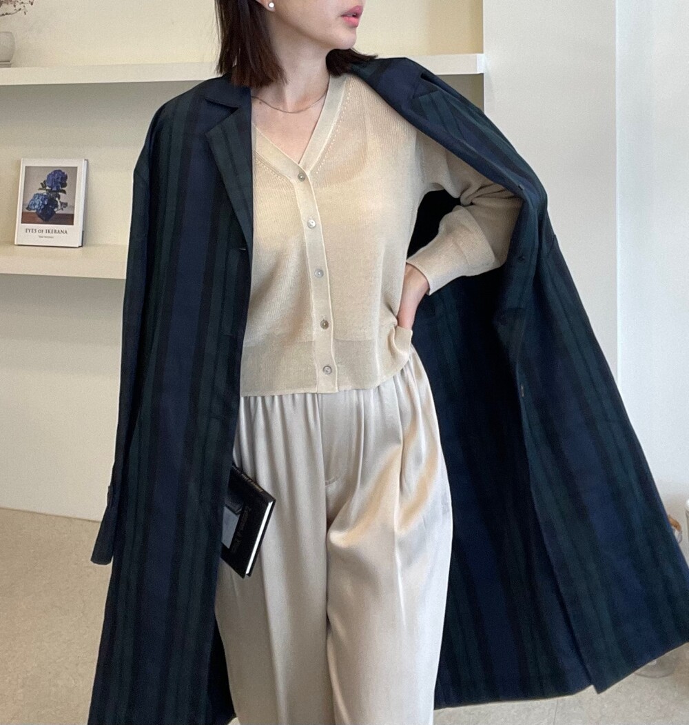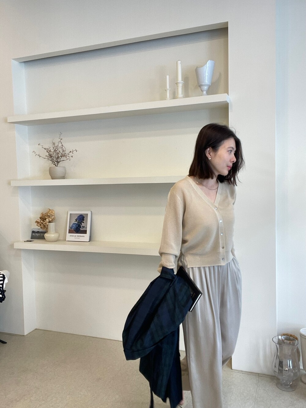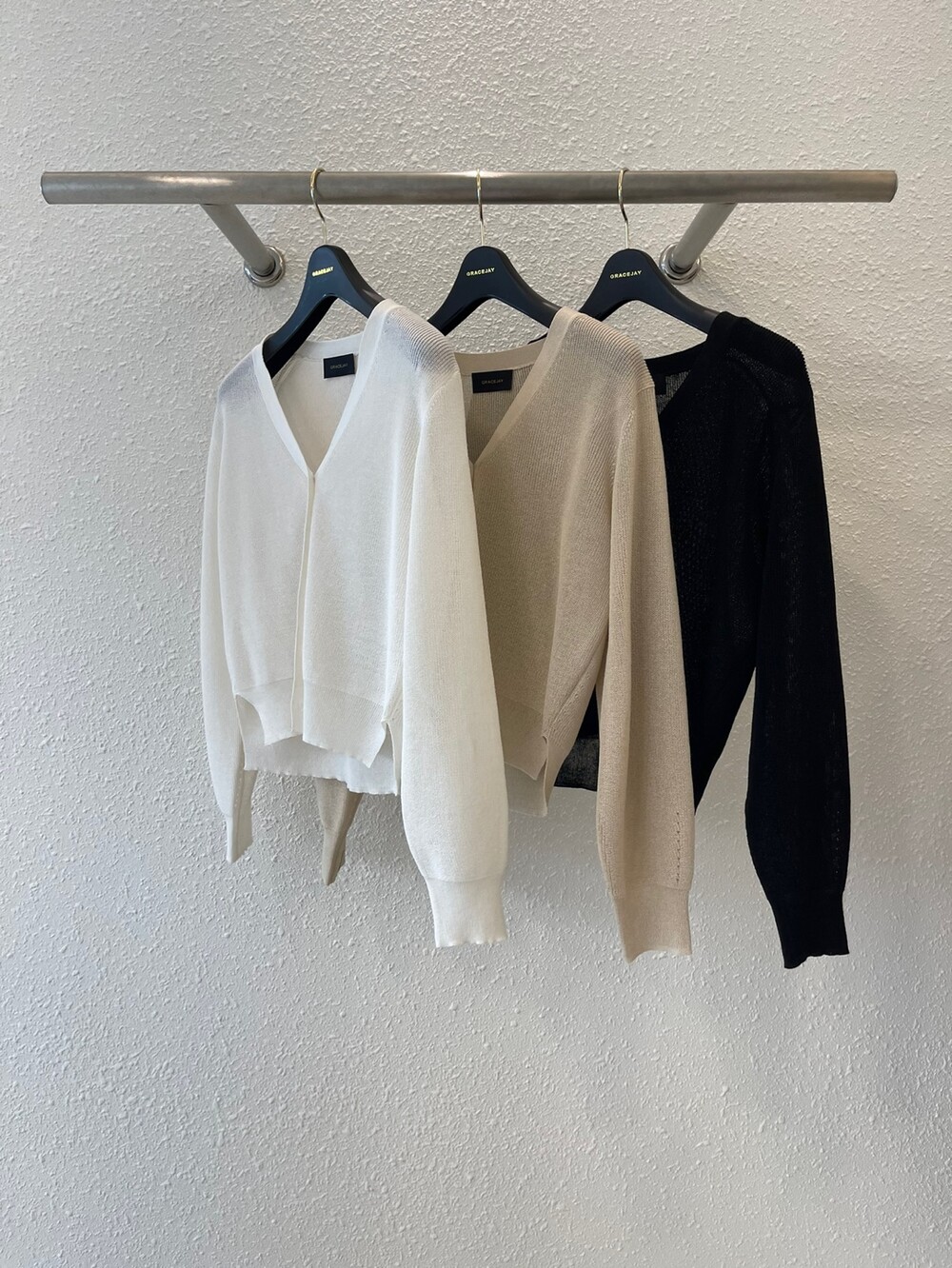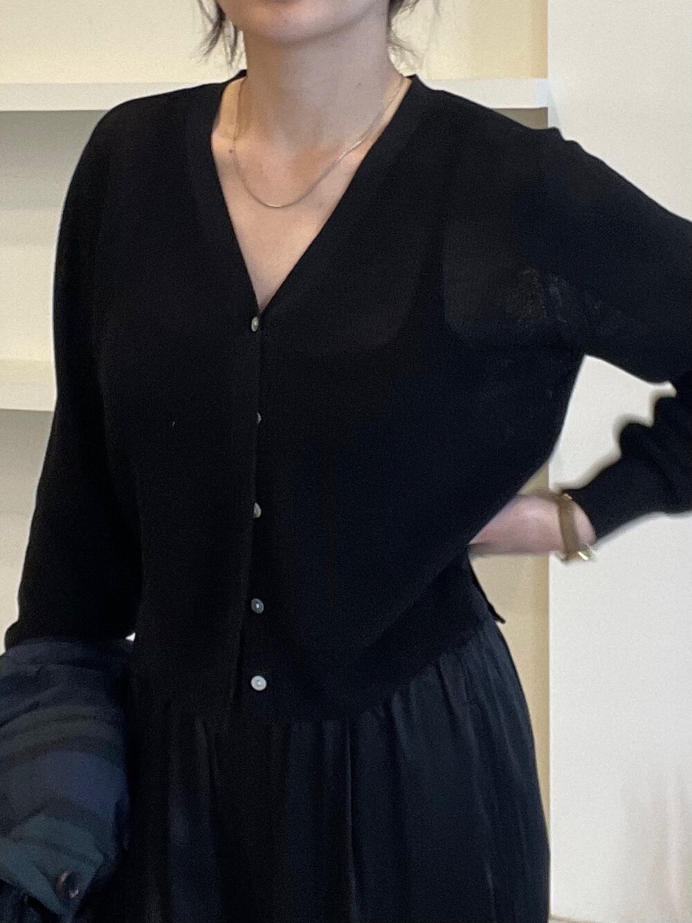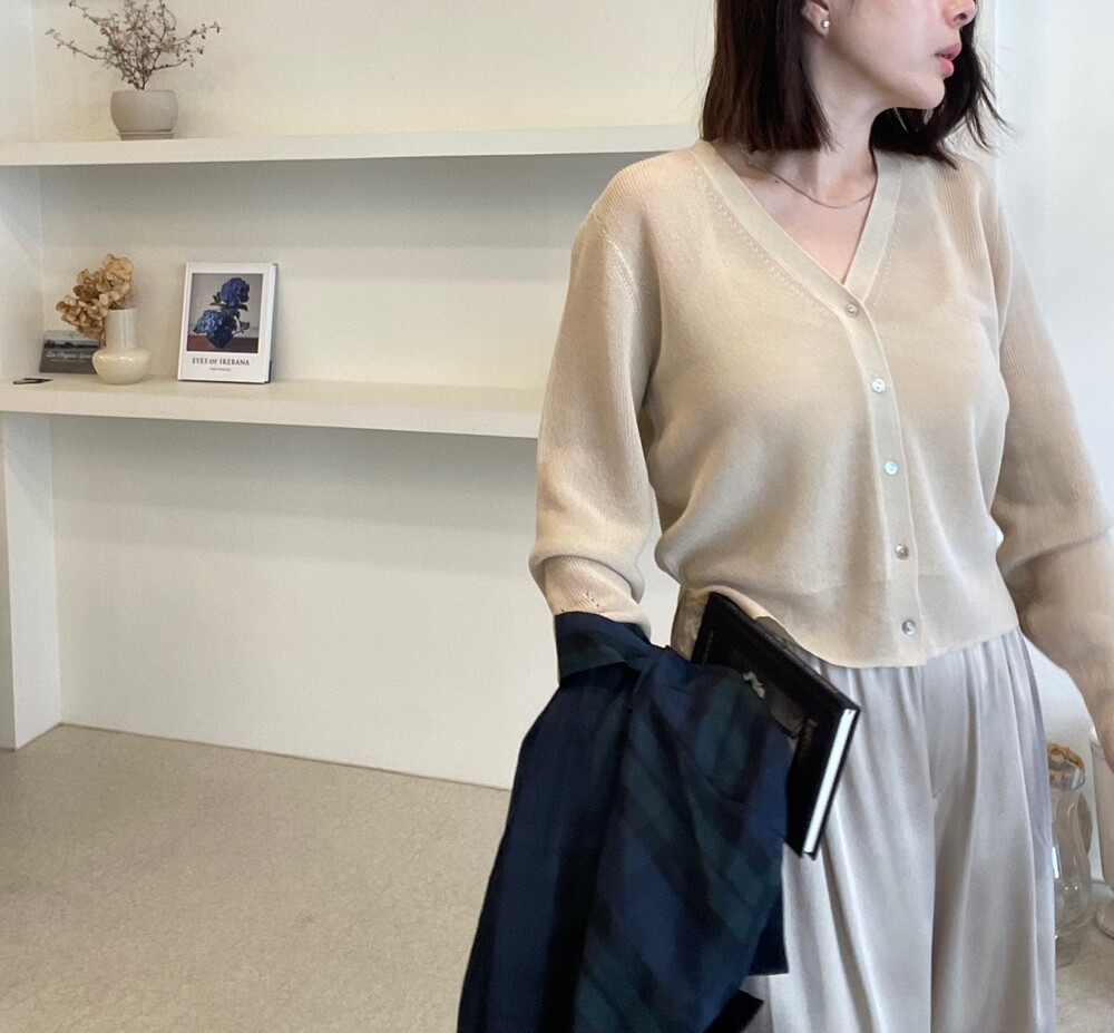 파임이 깊지 않은 이너용의 긴소매 가디건으로 자켓속에 레이어드 하시기 좋은 품과 많이 짧지 않은 길이감 포인트인 제품입니다. 비침이 있는 소재감이며, 썸머울/ 아크릴, 폴리 혼방으로 부드럽고 청량한 터치감입니다.