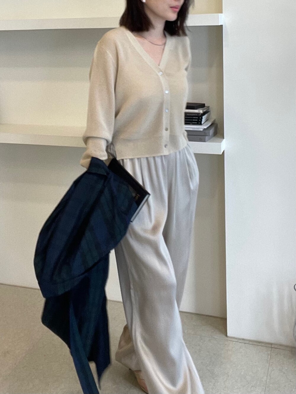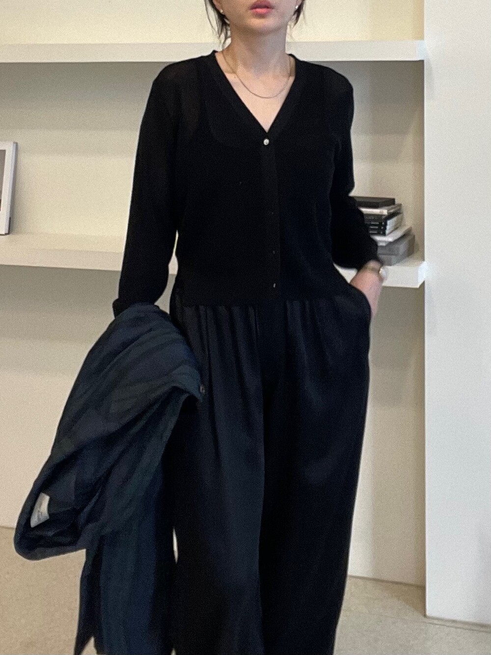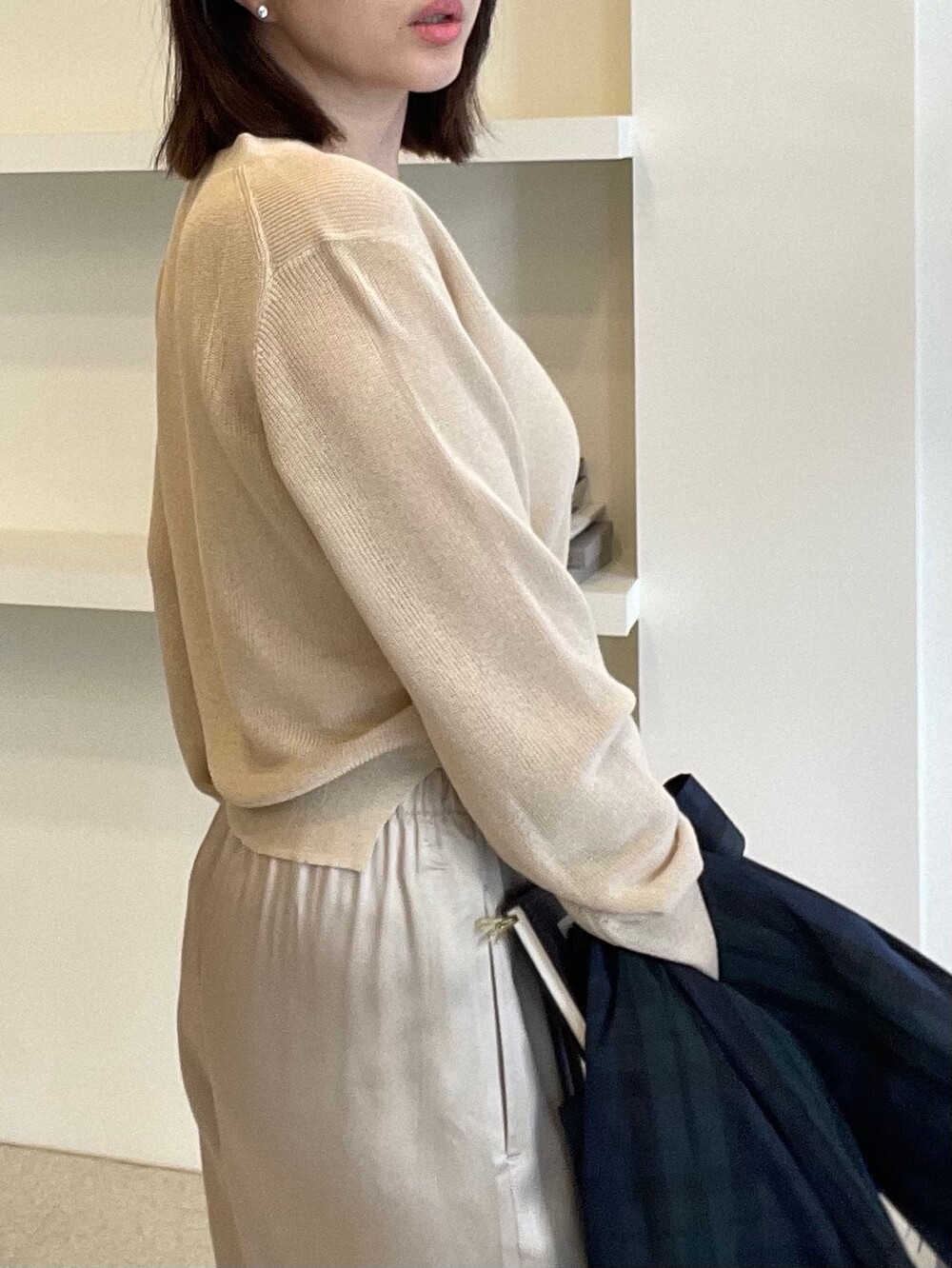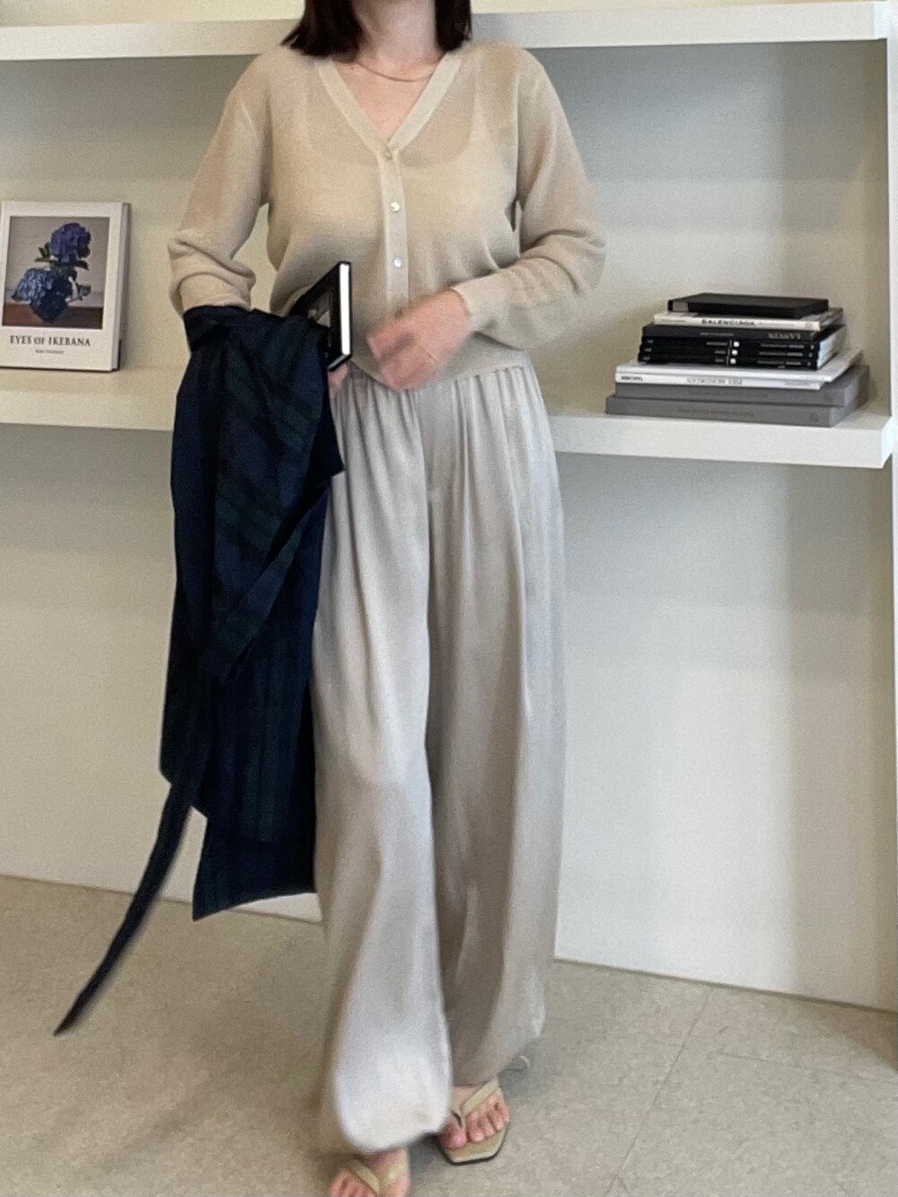 파임이 깊지 않은 이너용의 긴소매 가디건으로 자켓속에 레이어드 하시기 좋은 품과 많이 짧지 않은 길이감 포인트인 제품입니다. 비침이 있는 소재감이며, 썸머울/ 아크릴, 폴리 혼방으로 부드럽고 청량한 터치감입니다.