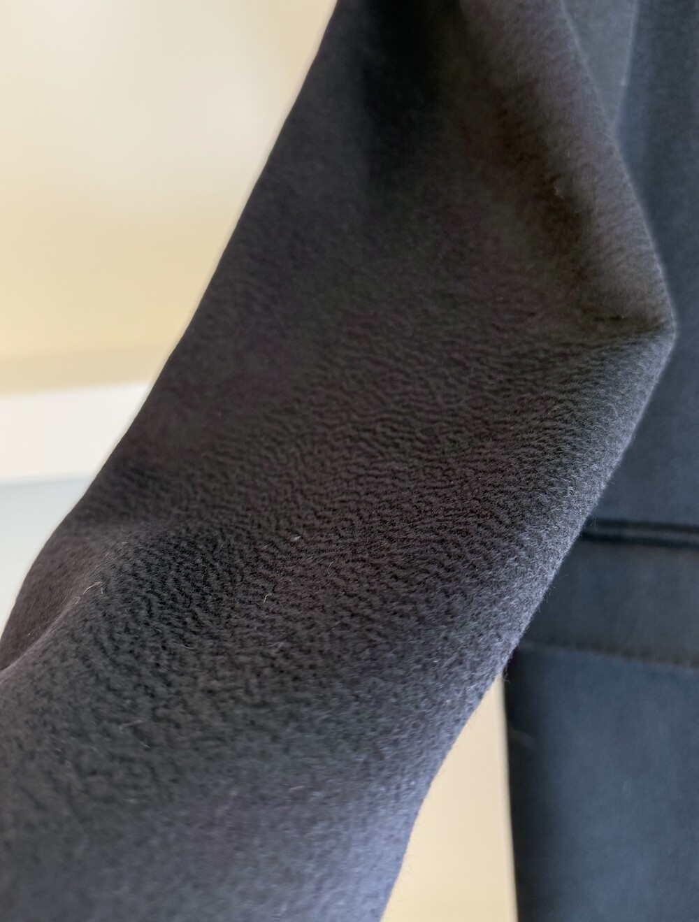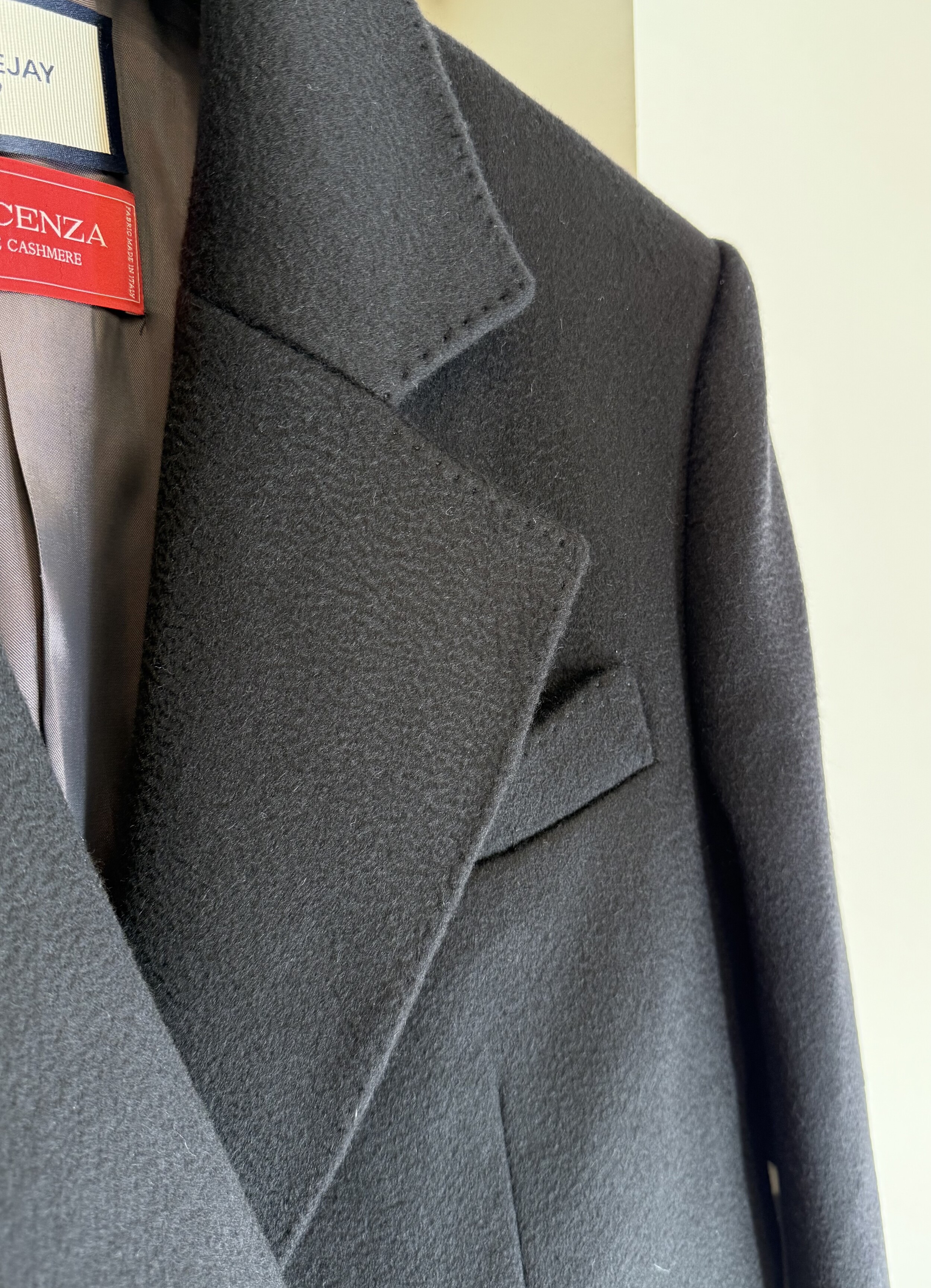 테일러드 코트의 쉐입을 힘있게 잡아주면서도 무겁지 않게 즐기기위해 울50% 캐시미어50% 의 소재로 선택 되었습니다. 탄탄한 질감이지만 캐시미어의 함량이 높은 편이라서 무엇보다 부드럽고 가볍게 즐기시기에 좋습니다.