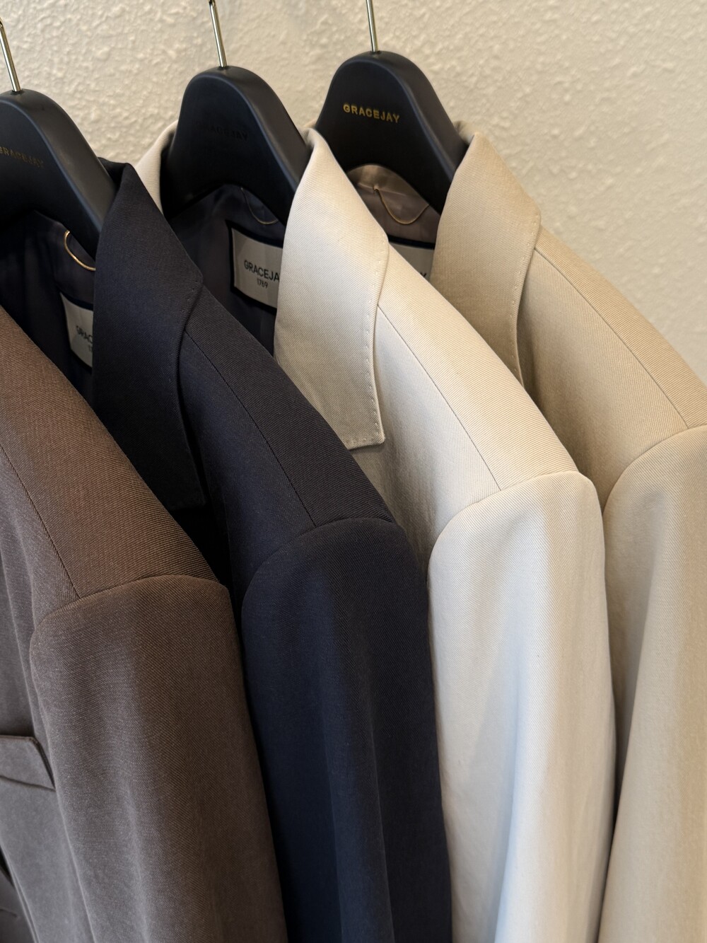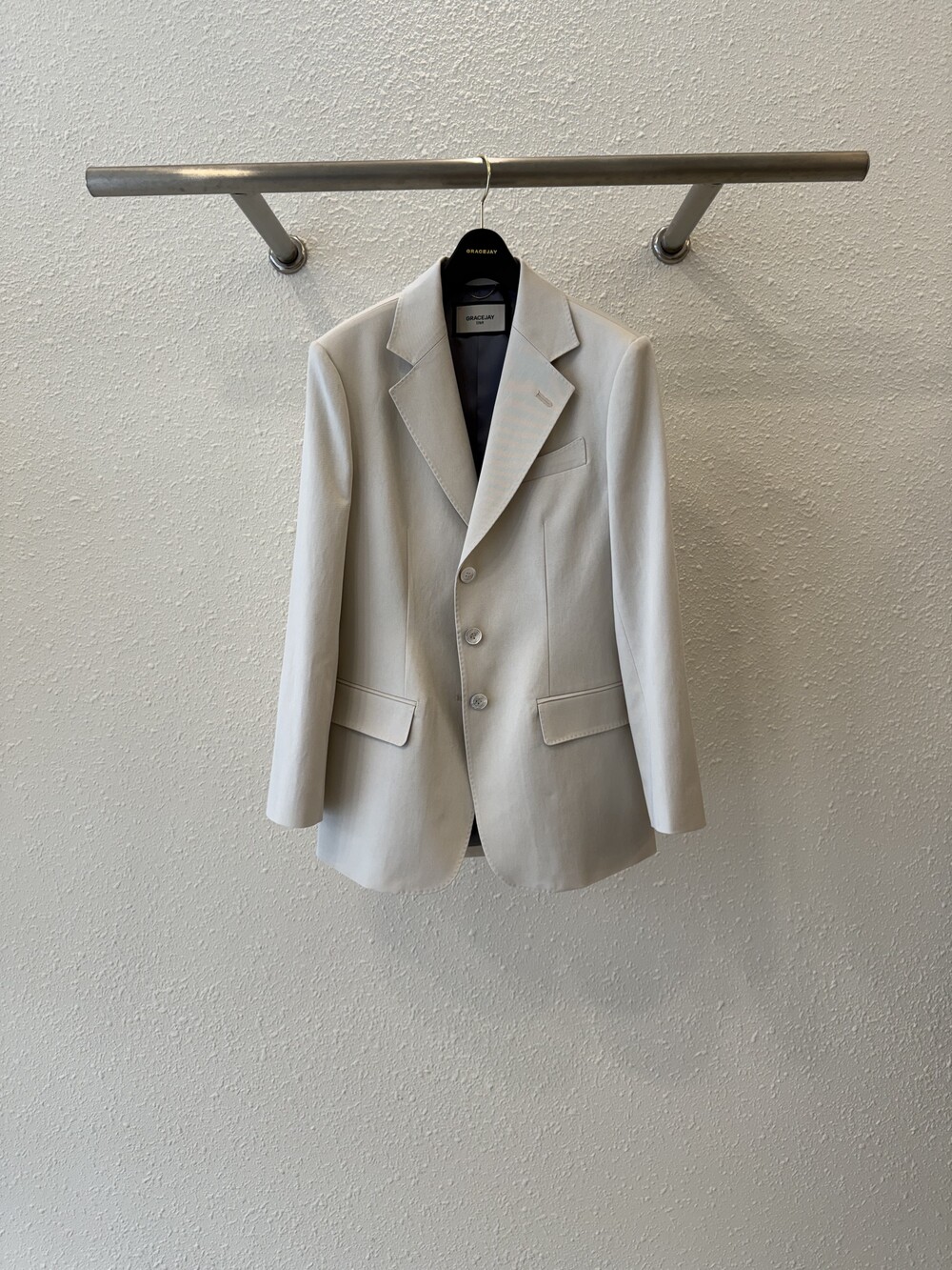 기존 그레이스제이의 3버튼 클래식 자켓 패턴에서 변형된 실루엣으로 이번 시즌 새롭게 제안됩니다.