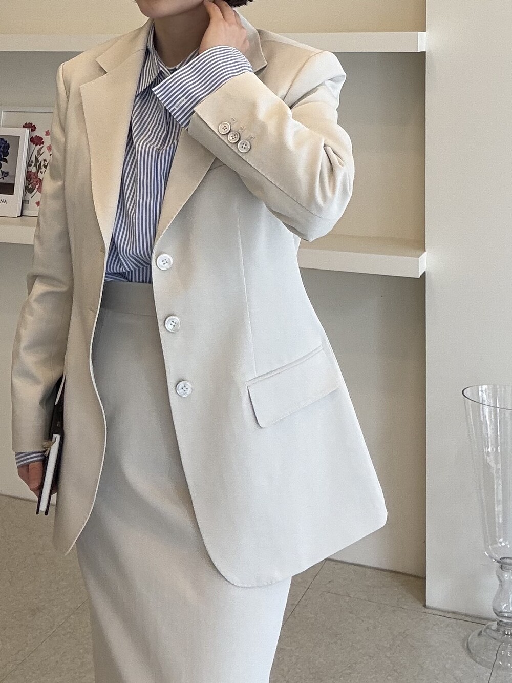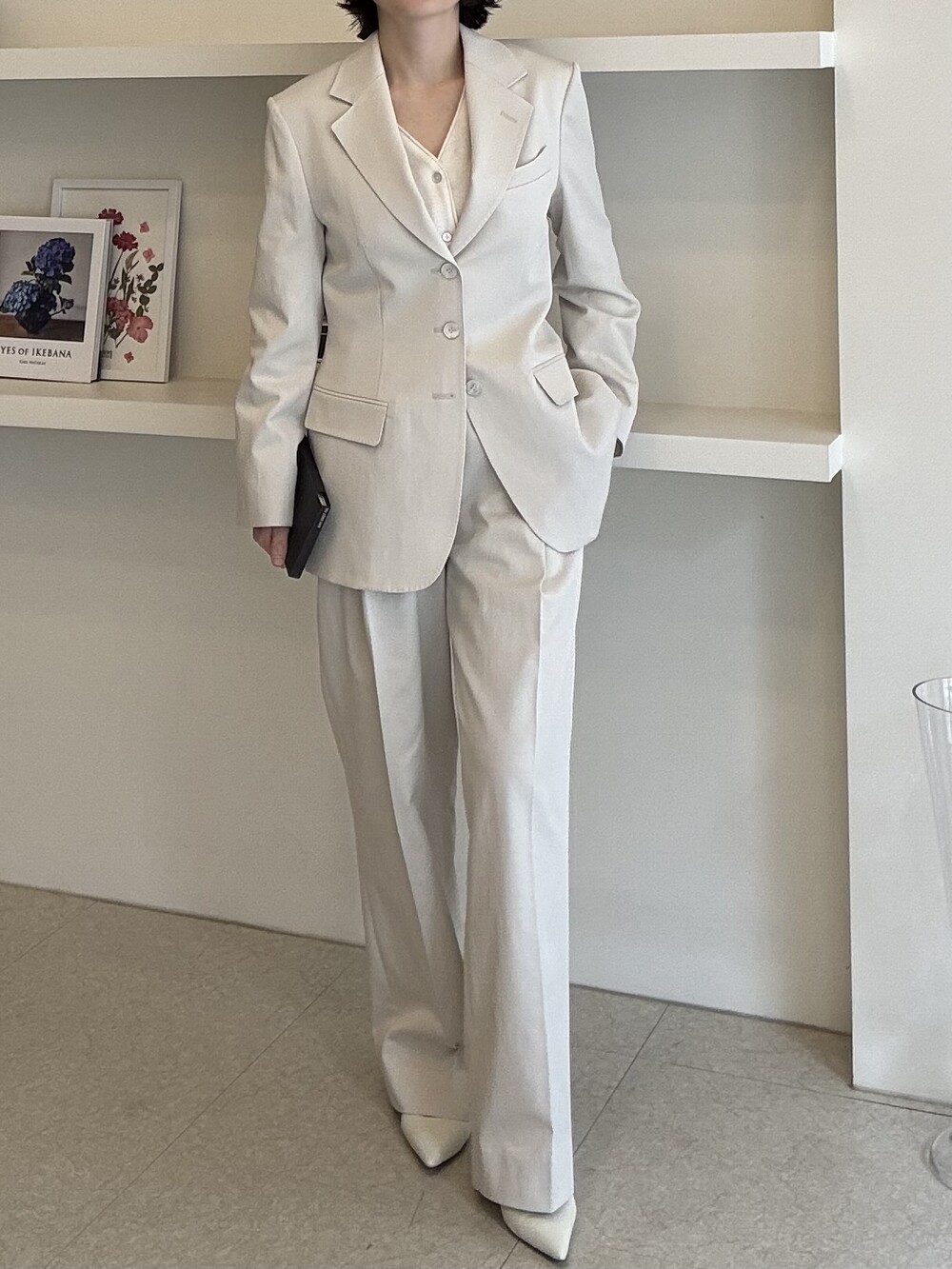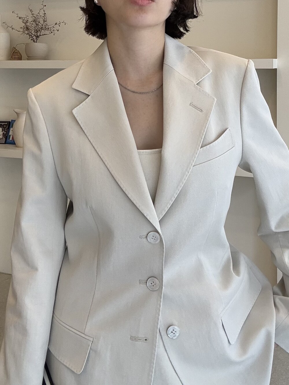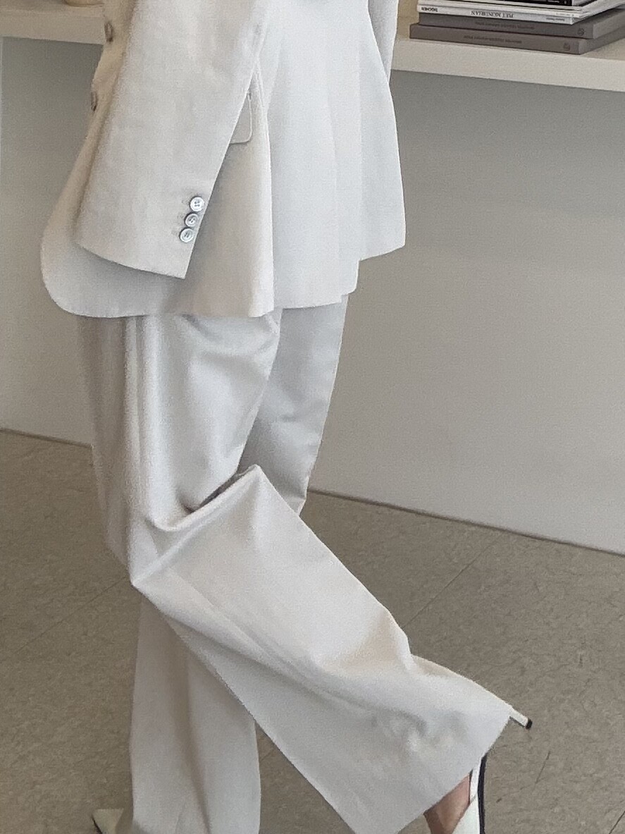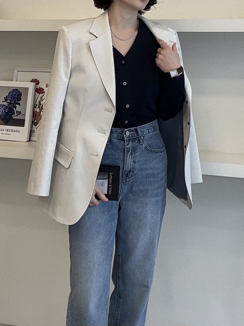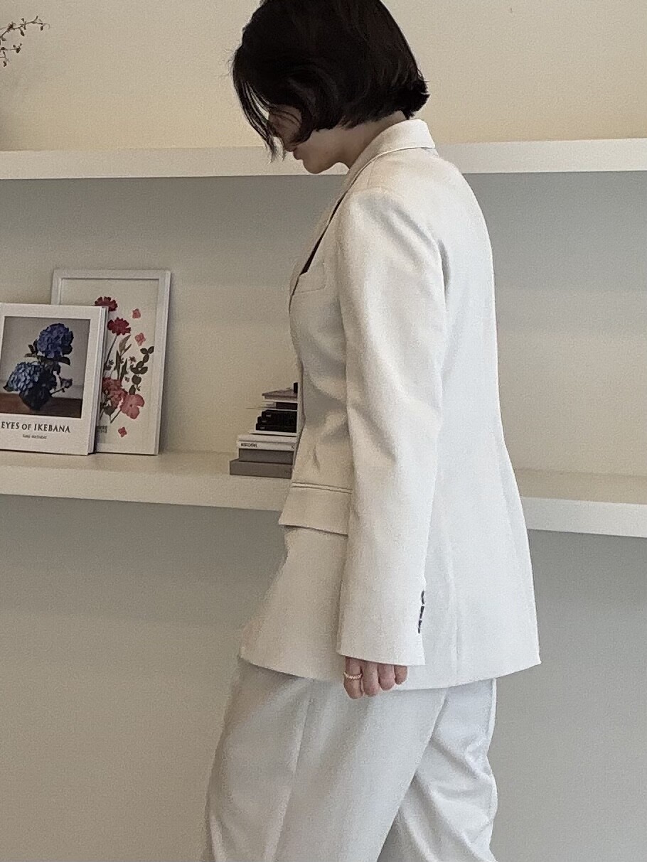 허리라인이 부각되었으며, 이번 크림색의 3버튼은 너치드 라펠 디자인으로 제안됩니다.