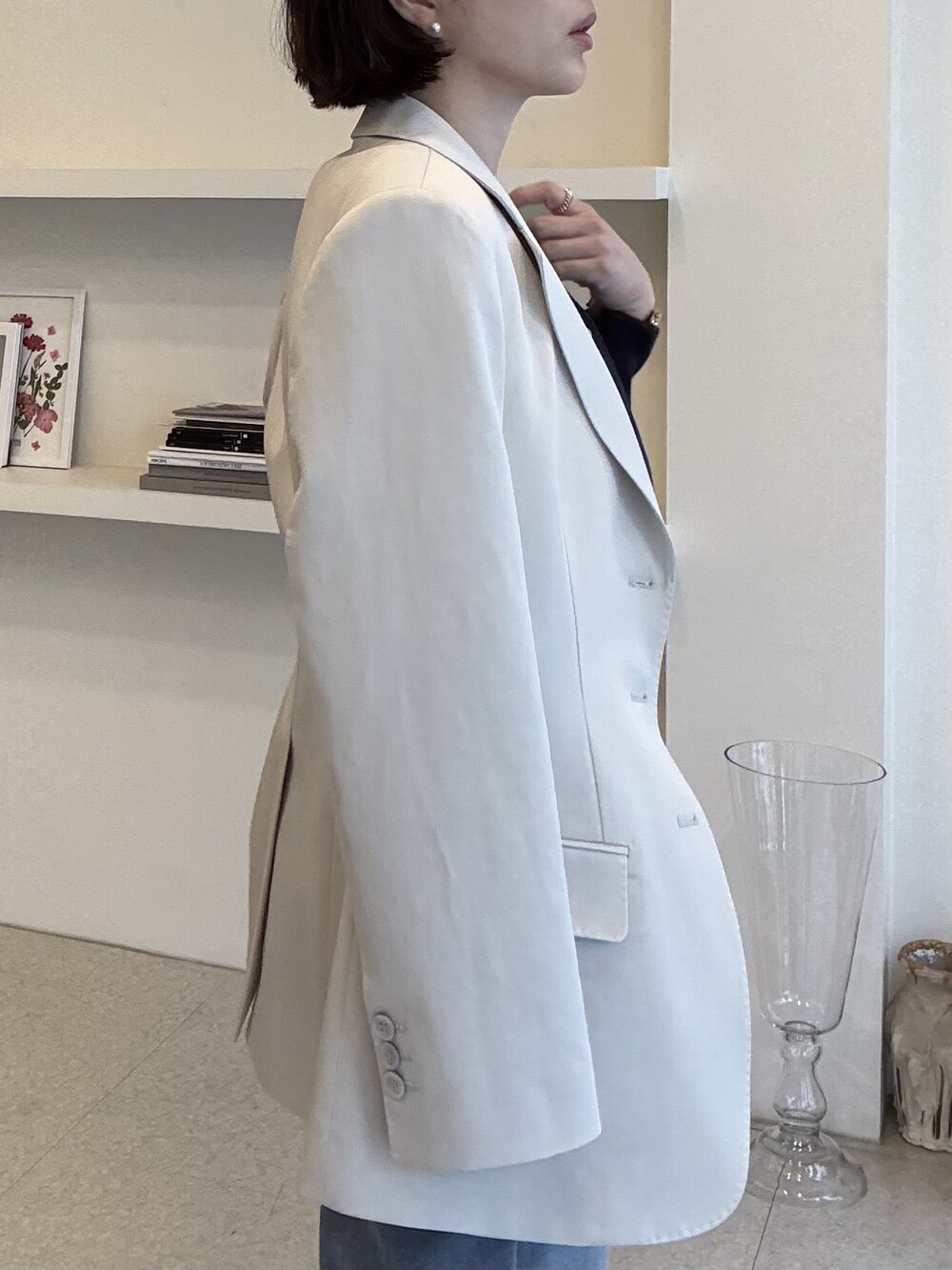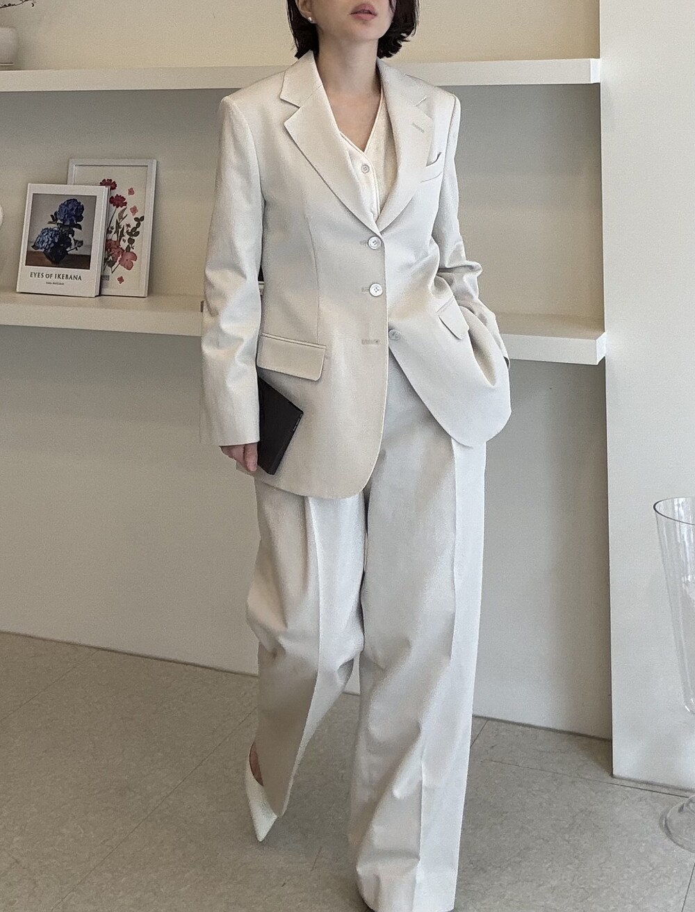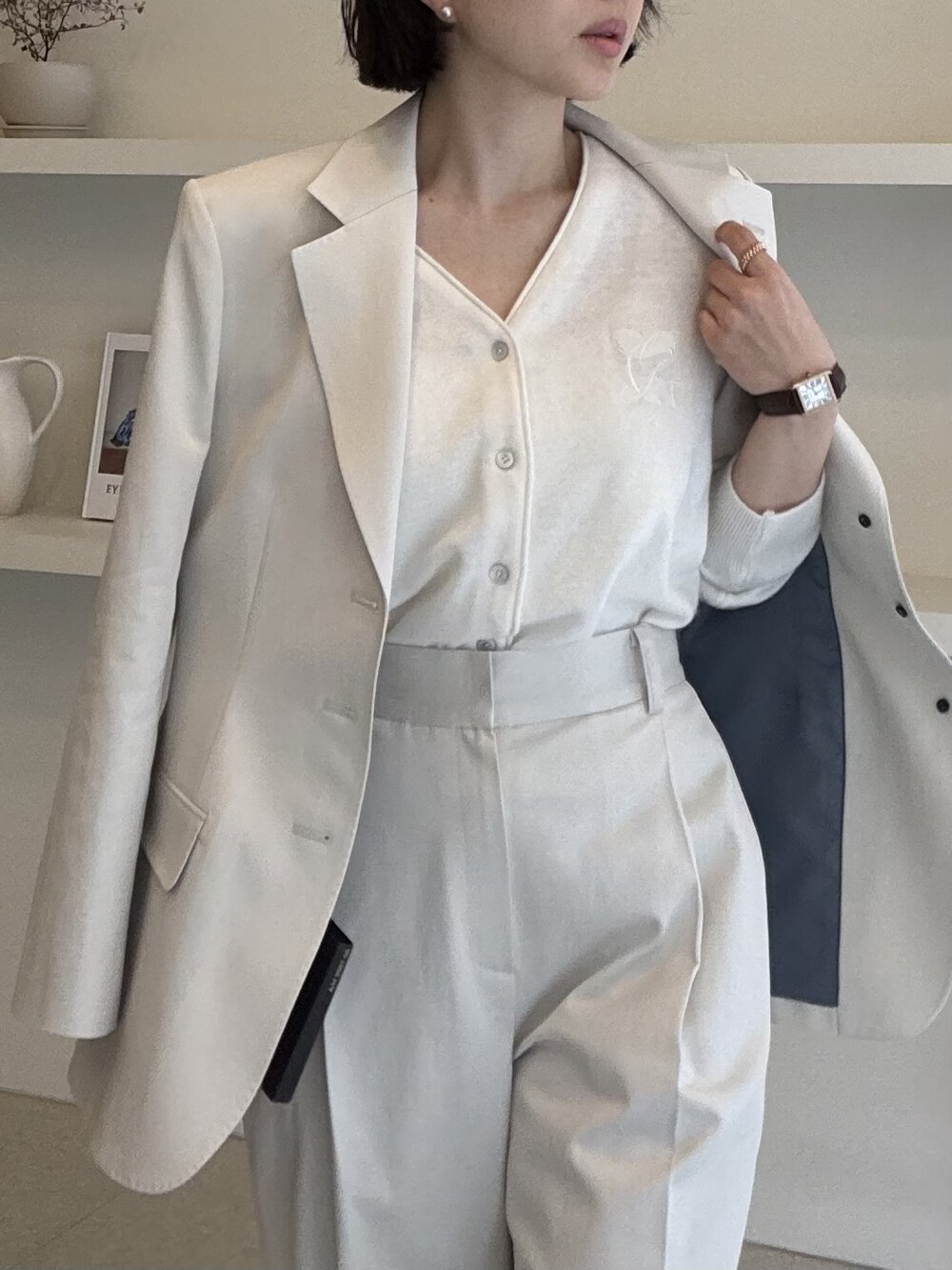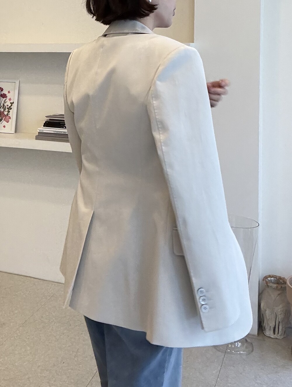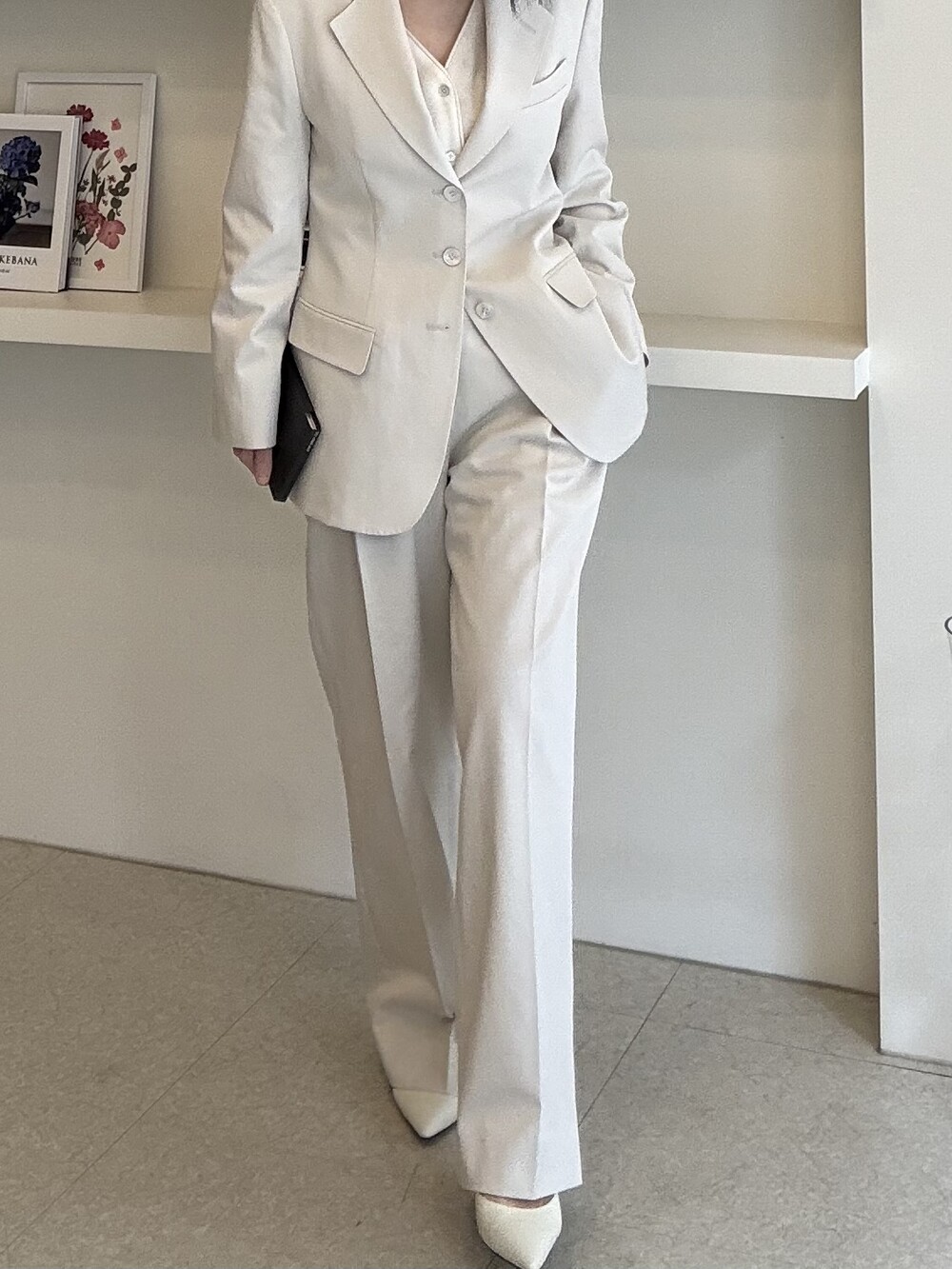 허리라인이 부각되었으며, 이번 크림색의 3버튼은 너치드 라펠 디자인으로 제안됩니다.