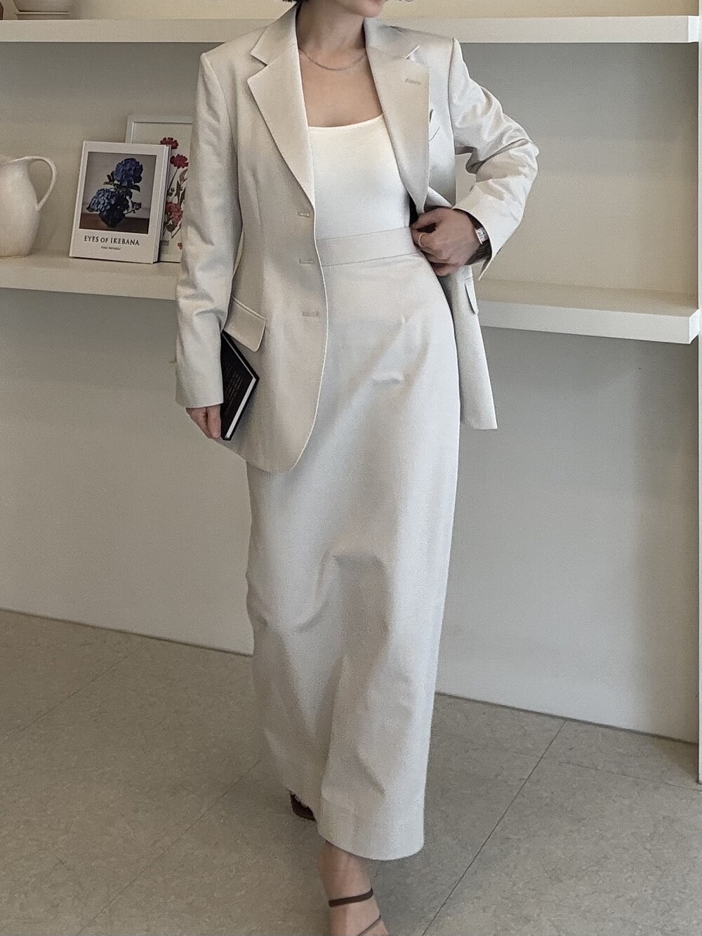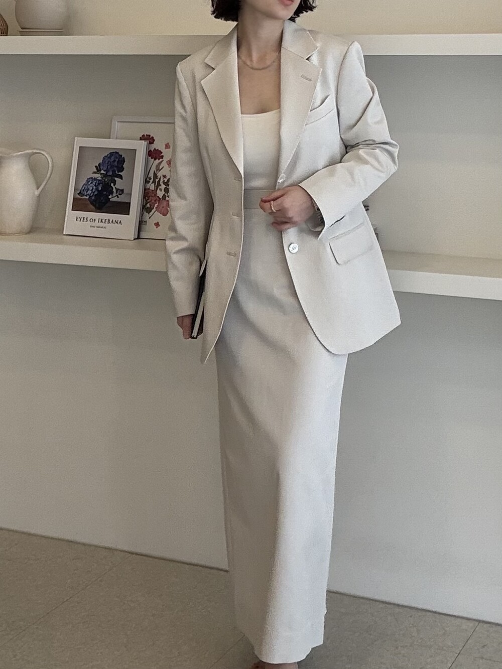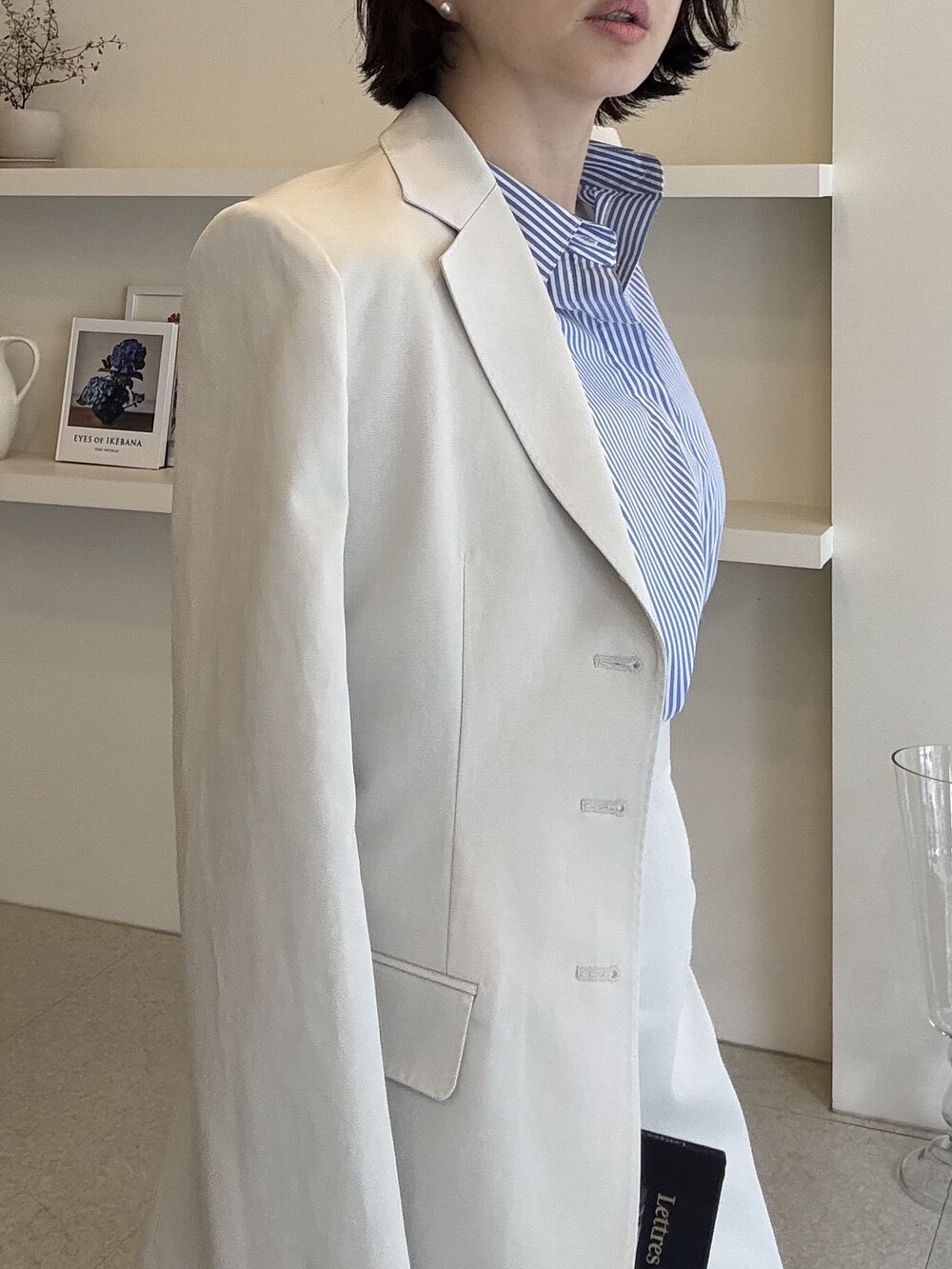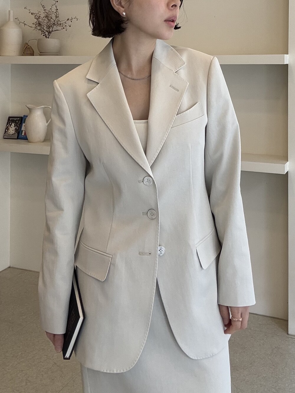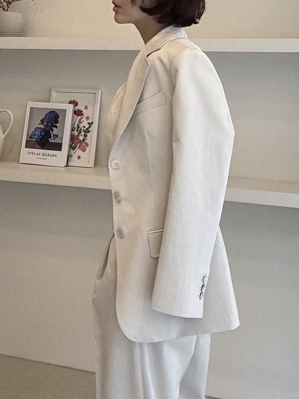 허리라인이 부각되었으며, 이번 크림색의 3버튼은 너치드 라펠 디자인으로 제안됩니다.