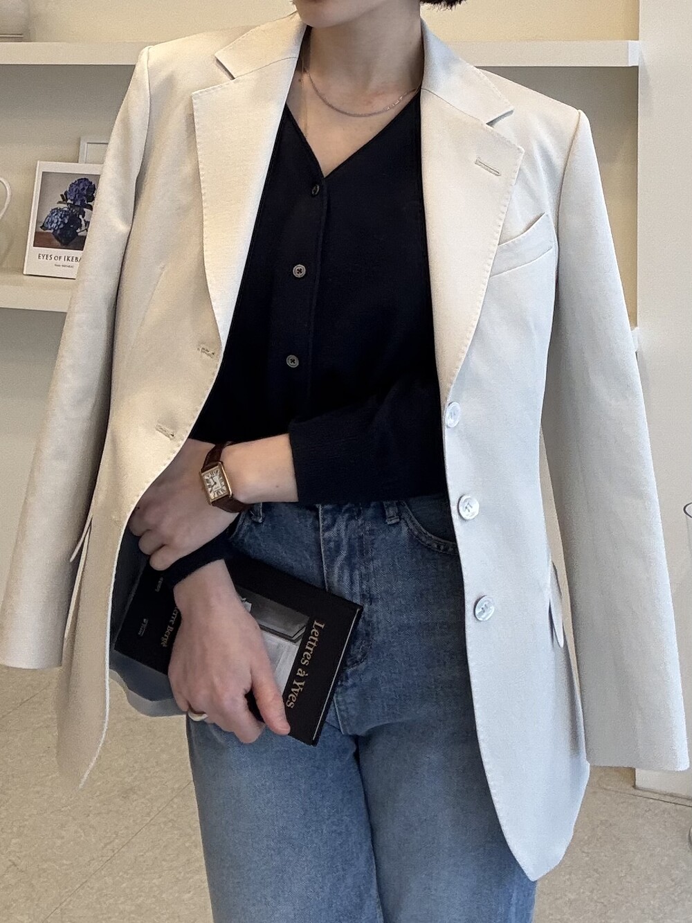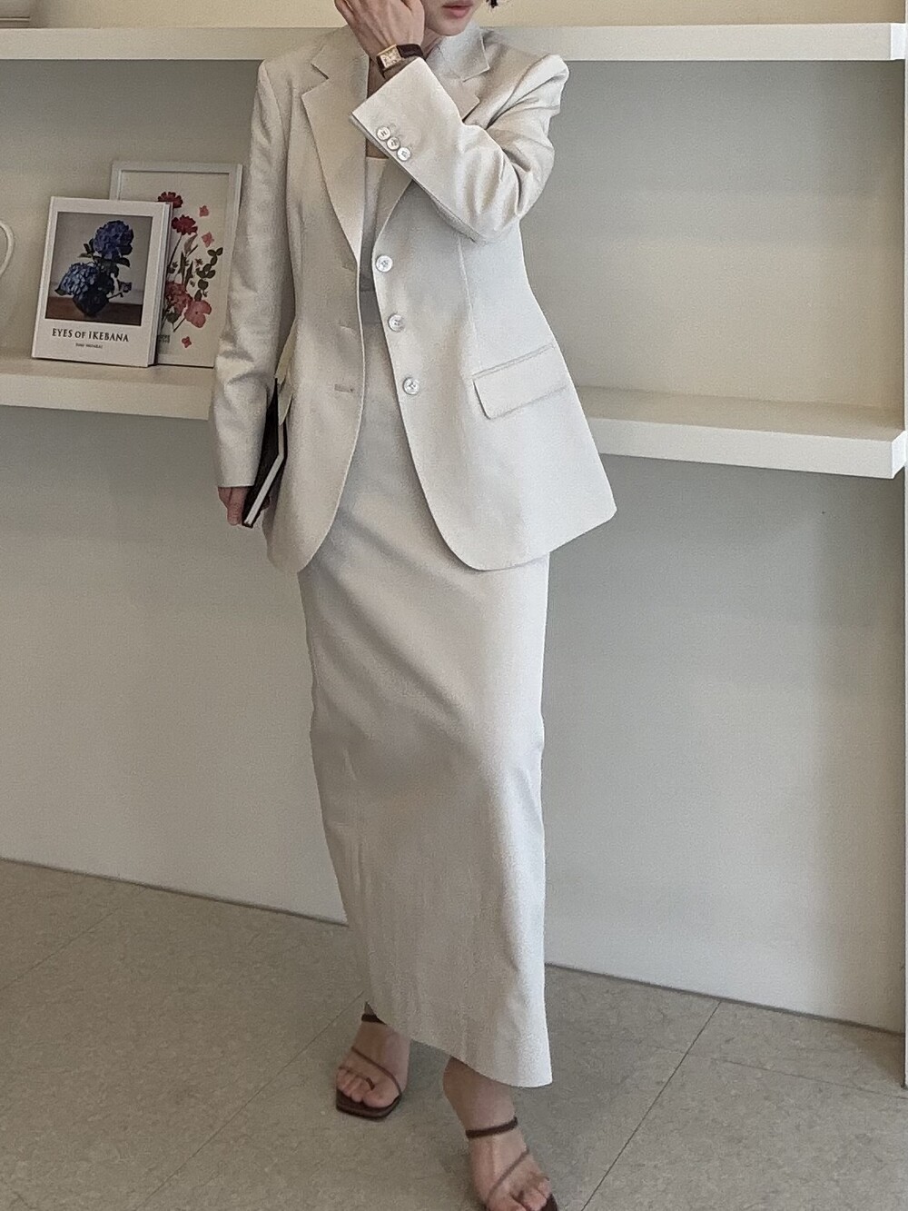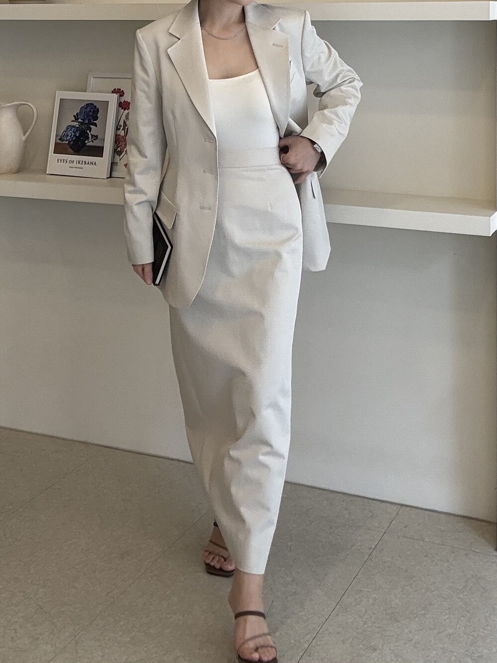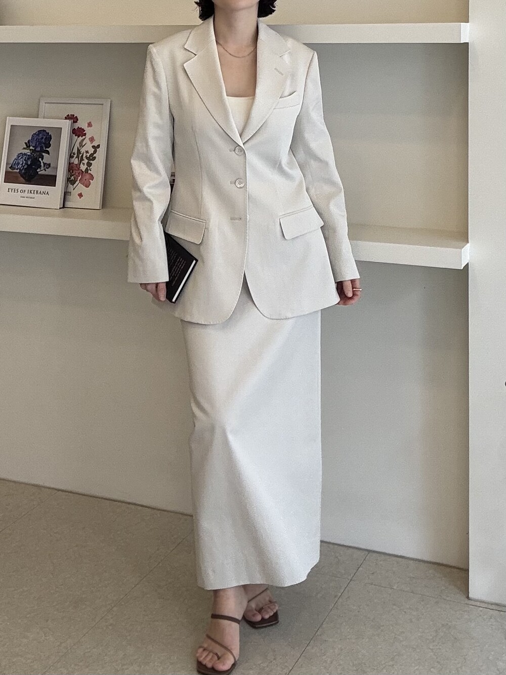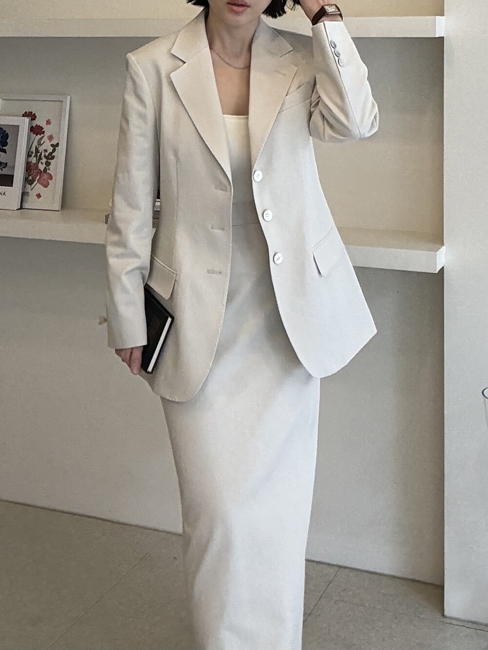 허리라인이 부각되었으며, 이번 크림색의 3버튼은 너치드 라펠 디자인으로 제안됩니다.