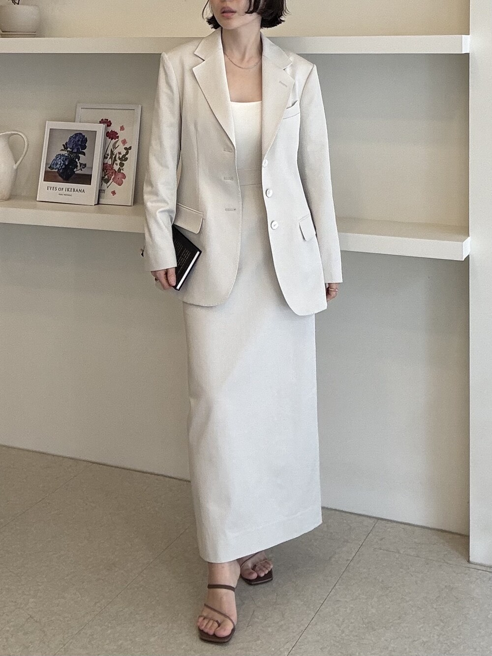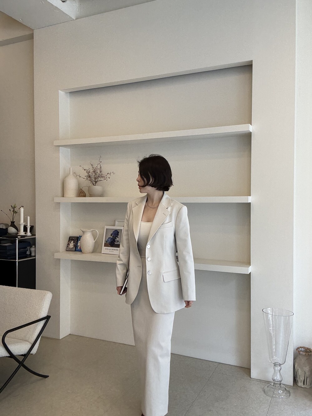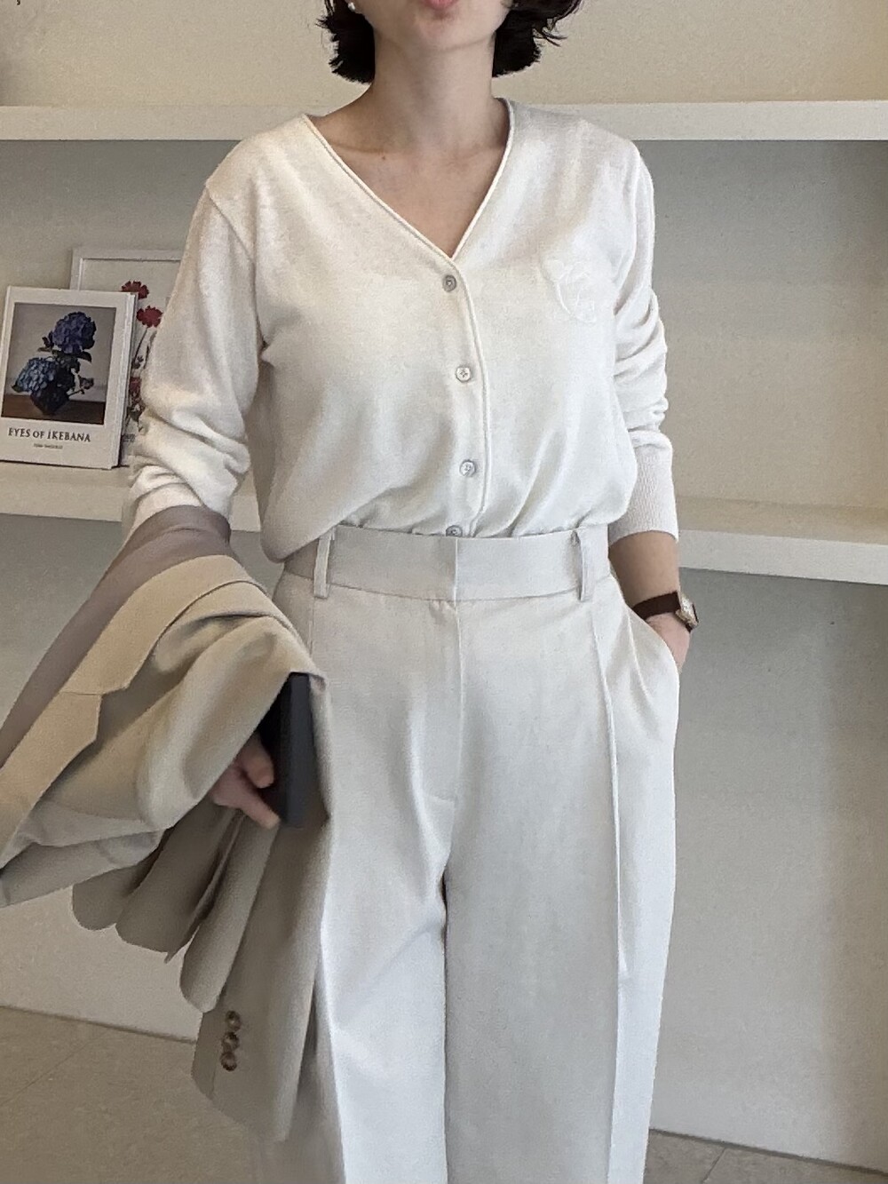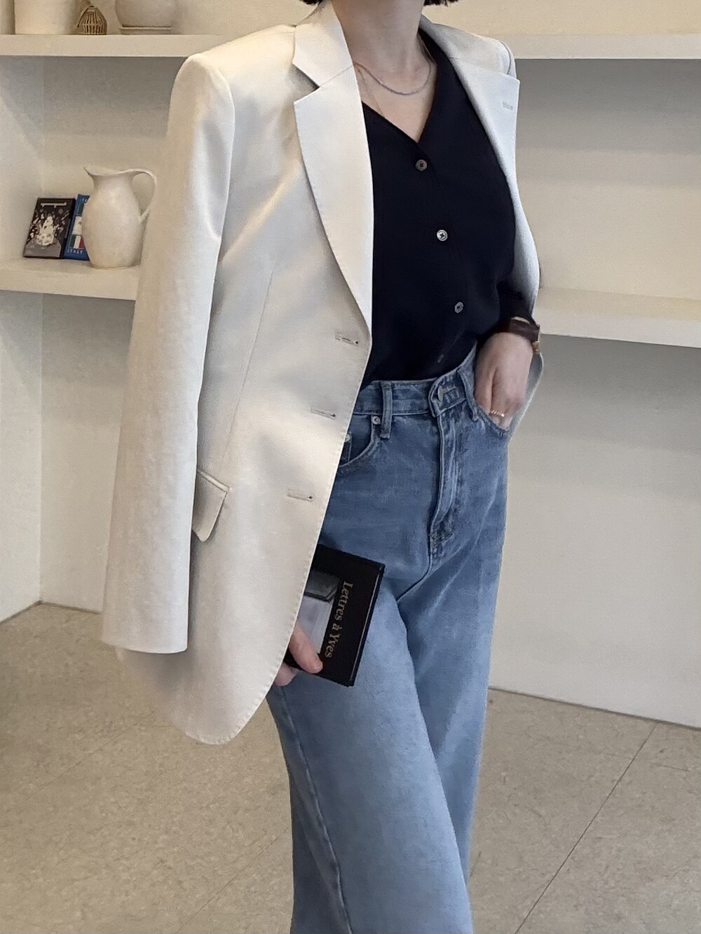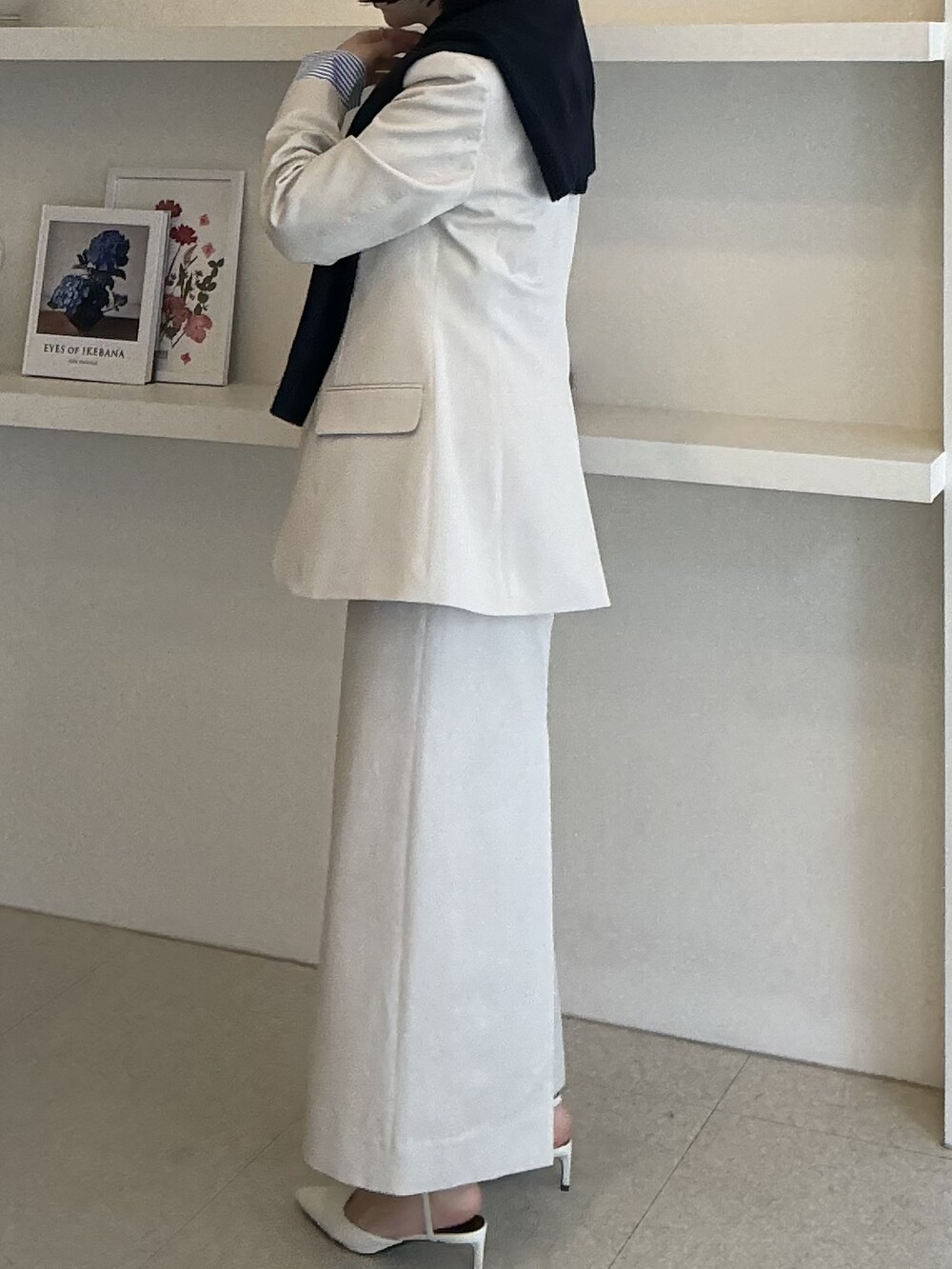 허리라인이 부각되었으며, 이번 크림색의 3버튼은 너치드 라펠 디자인으로 제안됩니다.